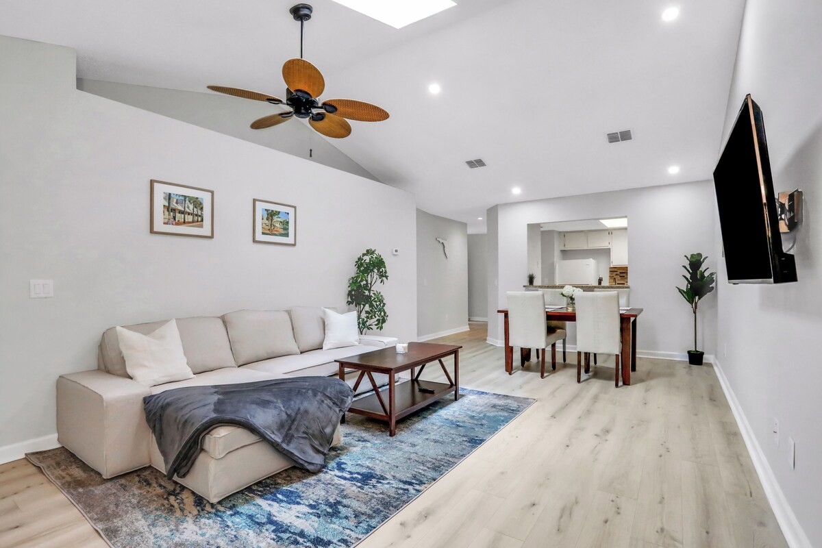 Welcome to Your Jacksonville Beachside Retreat! Discover the perfect blend of comfort, convenience, and vibrant fun in our stunning Beach Blvd townhome, nestled in the serene Golden Glades - The Woods neighborhood of Jacksonville, FL. This newly renovated 3-bedroom, 2-bathroom retreat, spanning 1,200 square feet, is your ideal home base for family adventures or a relaxing getaway. With fresh flooring, modern paint, and a fully equipped interior, this pet-friendly gem offers everything you need for an unforgettable stay. Home Highlights • Master Bedroom: Unwind in a cozy queen bed for restful nights. • Second Bedroom: A comfortable queen bed, perfect for guests. • Third Bedroom: A versatile trundle bed with two twin mattresses, ideal for kids or extra visitors. • Backyard Sunroom: An air-conditioned haven featuring a pool table, dartboard, and patio furniture for year-round entertainment. • Private Backyard: Relax around a fire pit, perfect for cozy evenings under the stars. • Two Bathrooms: Each with individual shower-tub combos for ultimate convenience. Prime Location with a Neighborhood Vibe Tucked away in the palm-lined, tropical community of Golden Glades - The Woods, this townhome offers a peaceful escape with a close-knit, family-friendly feel. Located just minutes from Beach Blvd and San Pablo, you’re only a 10-minute drive from the pristine sands of Jacksonville Beach or Neptune Beach and just 5 minutes from the renowned Mayo Clinic. Downtown Jacksonville is a quick 20-minute drive, and Jacksonville International Airport is just 30 minutes away, making travel a breeze. Explore Nearby Attractions • Beaches: Soak up the sun at Jacksonville Beach or Neptune Beach, both less than 6 miles away, ideal for swimming, surfing, or leisurely strolls. • Shopping & Dining: Indulge at the upscale St. Johns Town Center, a 10-minute drive, or explore eclectic boutiques and restaurants along Atlantic Boulevard. • Outdoor Adventures: Wander scenic trails at the Jacksonville Arboretum and Gardens (10 miles) or enjoy picnics and water activities at Huguenot Memorial Park (12 miles). • Cultural Gems: Experience the Jacksonville Symphony at Jacoby Symphony Hall (15 miles) or immerse yourself in art and history at the Cummer Museum of Art & Gardens. • Family Fun: Make memories at the Jacksonville Zoo (18 miles) or visit the Catty Shack Ranch Wildlife Sanctuary (15 miles) for a unique wildlife encounter. Rest at ease with a $1,500 damage waiver on most accidental damage through Waivo, (terms and conditions apply). Why Choose This Townhome? Whether you’re seeking family-friendly entertainment, a romantic escape, or a solo adventure, this townhome delivers. The vibrant backyard sunroom with a pool table, dartboard, and outdoor fire pit ensures fun for all ages, while the tranquil setting and proximity to Jacksonville’s best beaches, shopping, and cultural attractions make it the ultimate vacation home. Available when you need it, this pet-friendly retreat invites you to experience the best of Northeast Florida living. Book your stay today and make this Golden Glades - The Woods townhome your home away from home! Our prices include all fees. No hidden fees.
