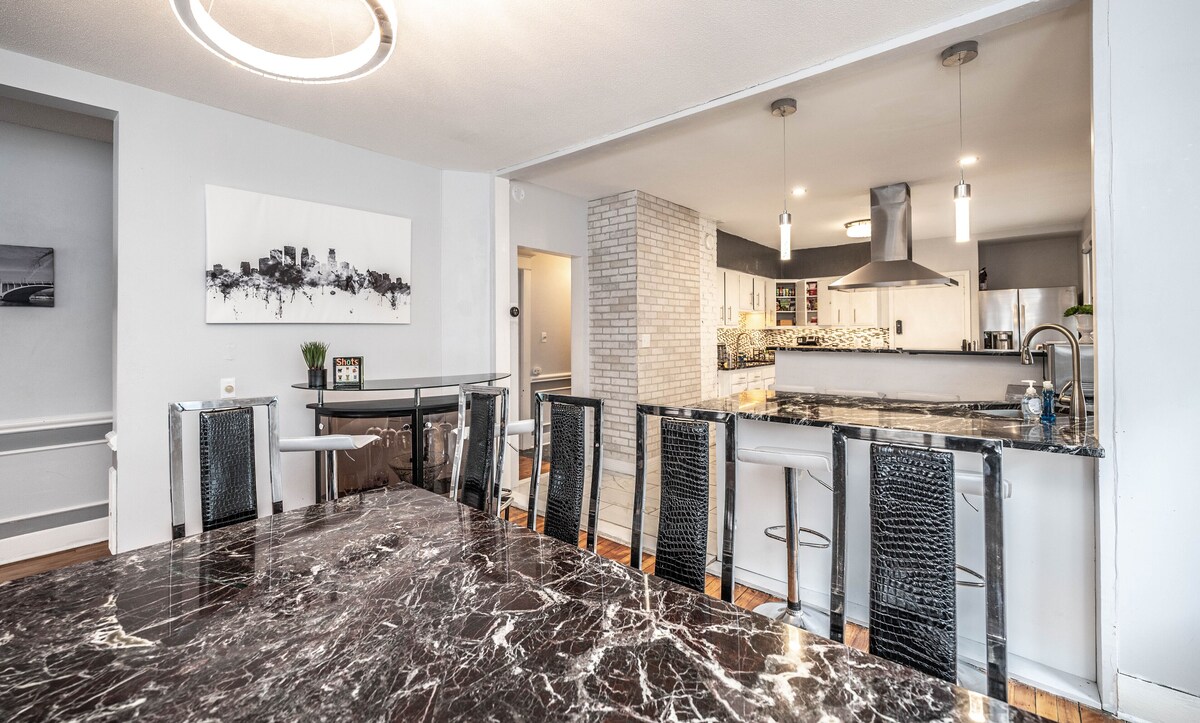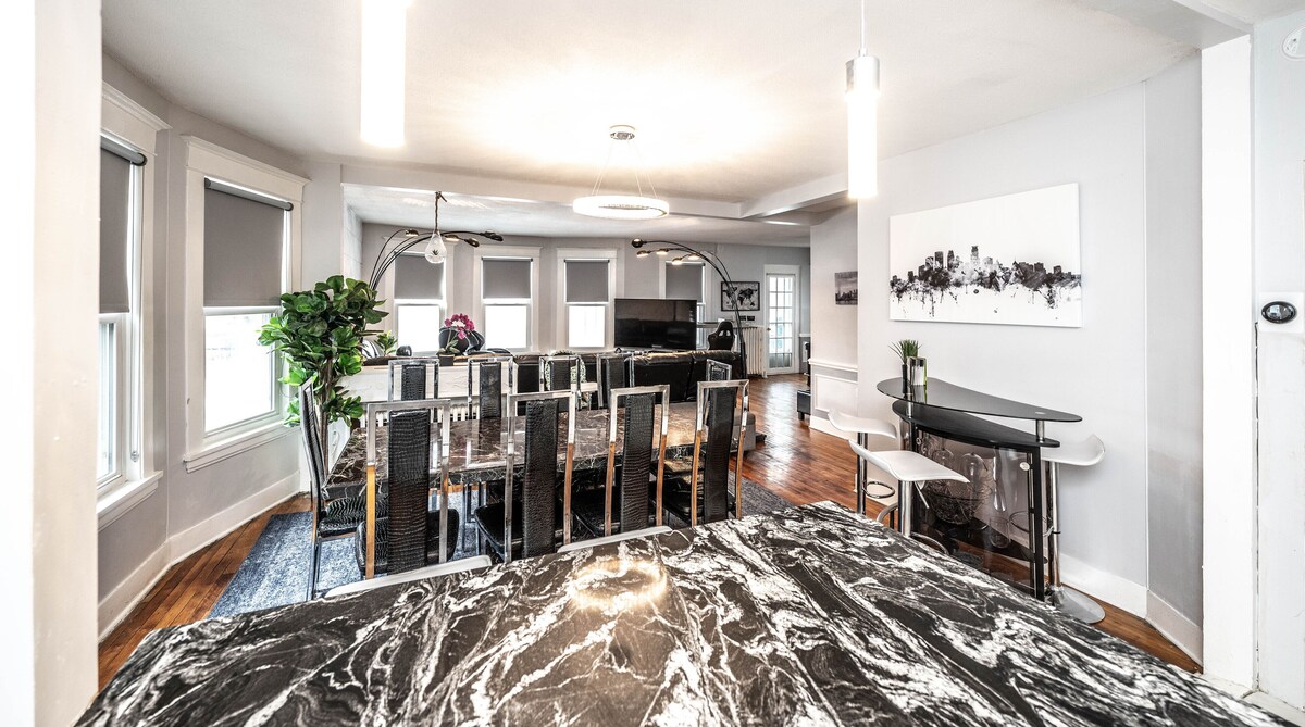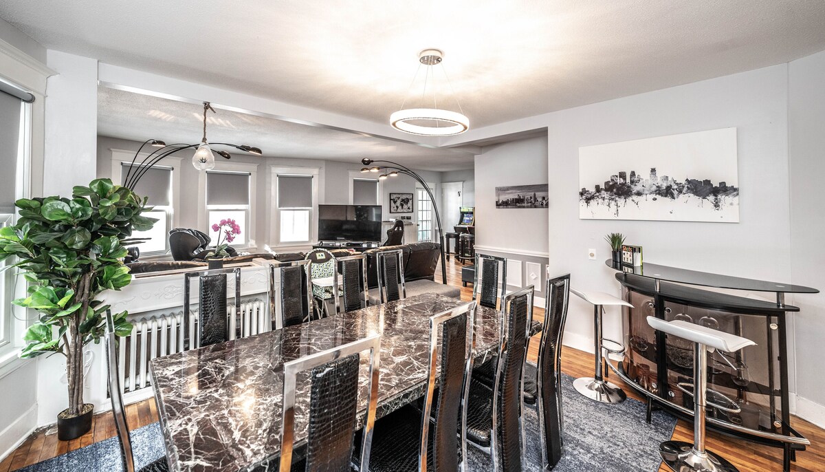 Stay in a Gorgeous 6BR private two level duplex unit inside a Historic 5700 sq ft Mansion less than 1 mile from Downtown, Uptown, Lakes, Eat Street, Loring Park, and More. **Professionally Cleaned (cleaners follow CDC standards for cleaning). Modern Furniture, BBQ grills, premium Cable, In unit W/D, Massage Chair, Gas Fire Pit, New Bathroom, Coffee Bar, 5 work stations. Off street parking for 1 car and free street parking. Our prices include all fees. No hidden fees.