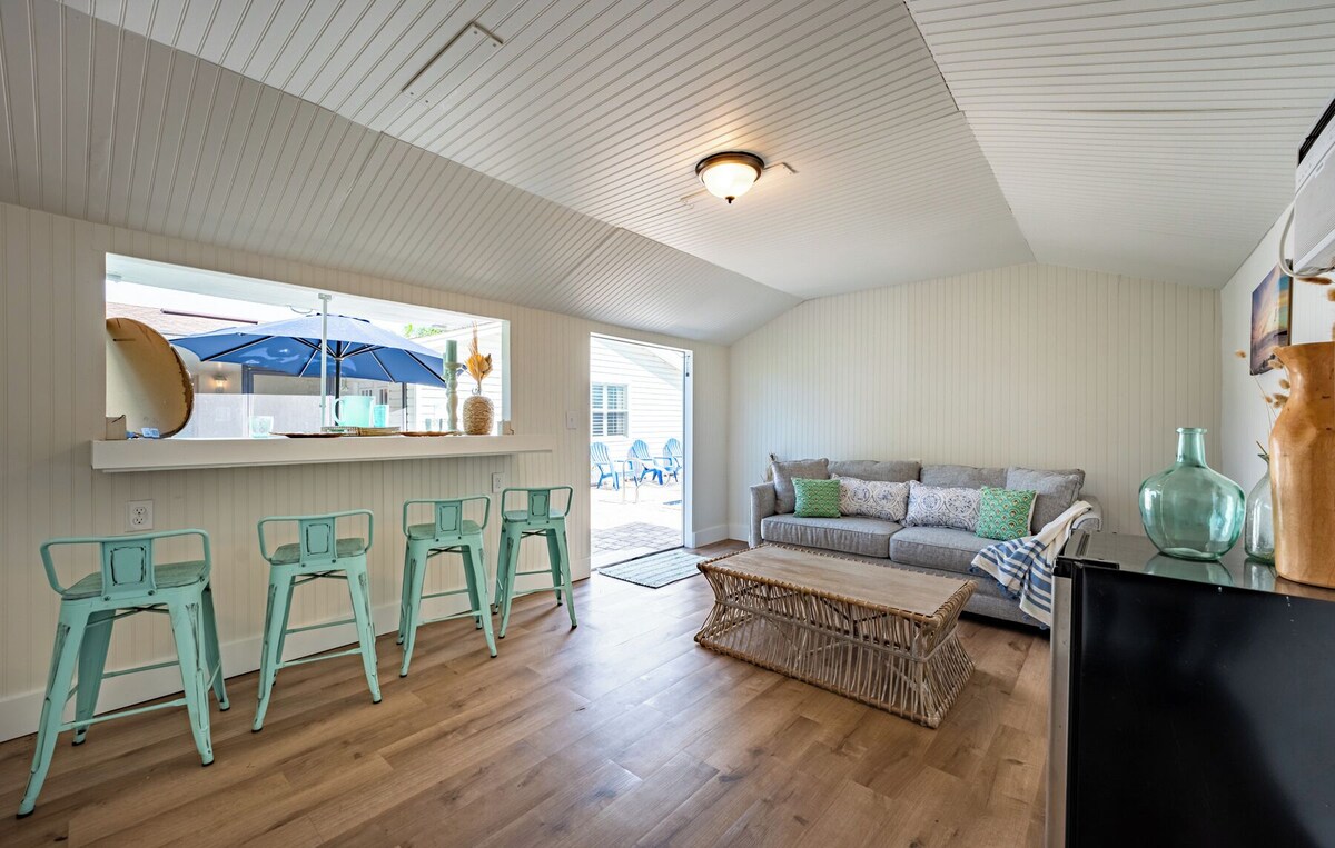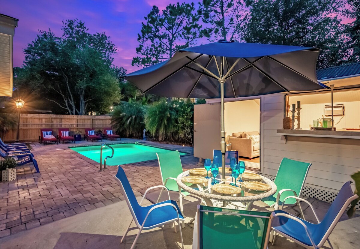 Palms Bungalow is a 3 bedroom 2 bath pool home, only 1 mile from Mayo Clinic and 3 miles from Jacksonville Beach. This one story home features a newly remodeled kitchen with all new appliances. Palms Bungalow offers 2 lounging areas, with plenty of space for everyone to relax. All 3 bedrooms have smart TV's, with cable in living rooms and primary suite. Step outside to, a large covered porch, sparkling heated pool, and a new tiki bar that includes AC, mini fridge, couch, Smart TV, and bar seating. Outback you will also find a grill with provided propane. Just one house away from Isle of Palms park, this bungalow is perfect for families.