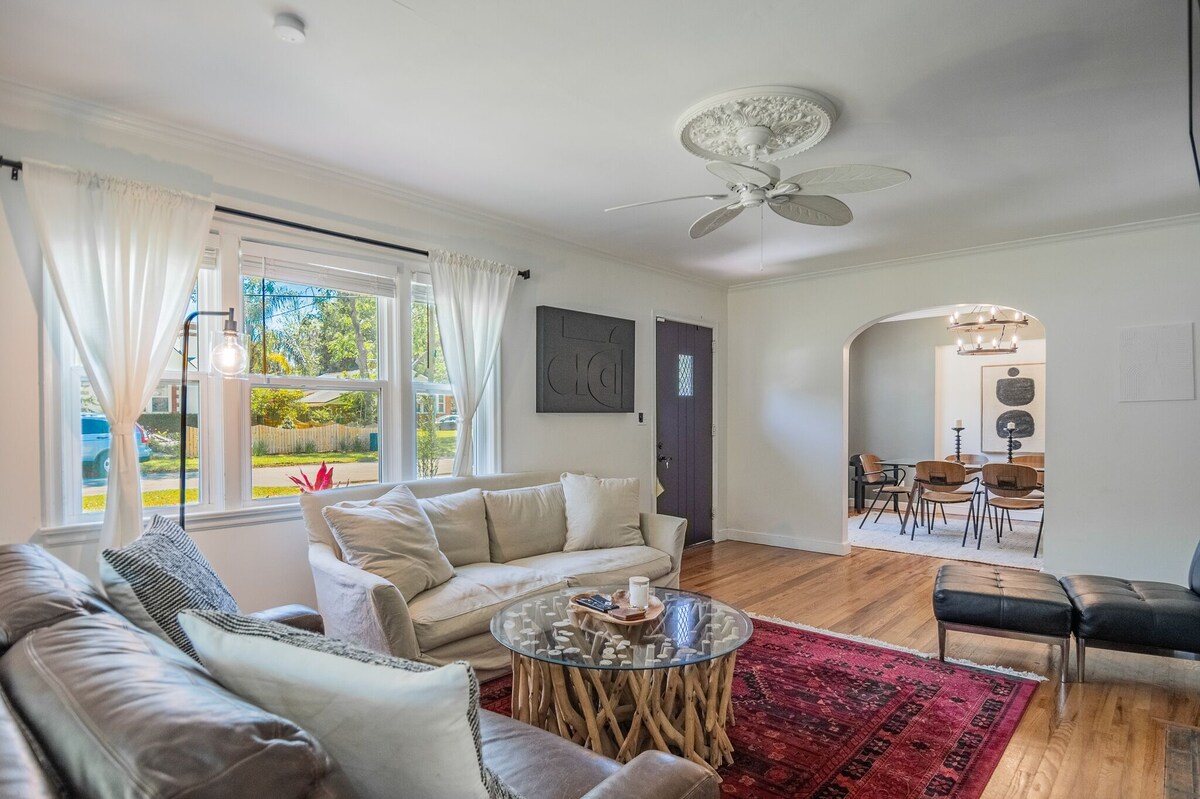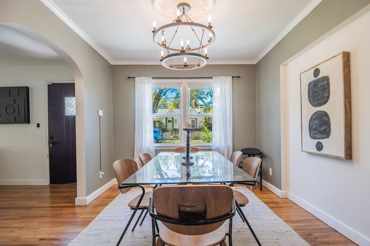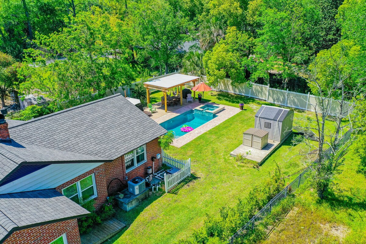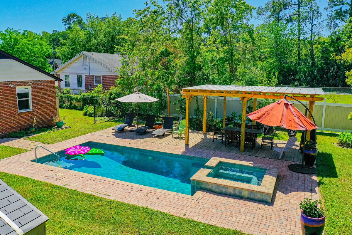 Discover your private oasis in the heart of Jacksonville’s charming San Marco neighborhood. This stylish 1950s home blends vintage charm with modern comforts—featuring a heated pool, hot tub, grill, and space for up to 8 guests. Whether you’re planning a family vacation, a weekend escape, or a long-term stay, everything you need for a relaxing getaway is right here. Welcome to our thoughtfully designed 1950s home—where timeless character meets resort-style amenities. Tucked into a peaceful, family-friendly neighborhood, this home is ideal for every kind of stay, from quick weekend escapes to extended vacations. Highlights: • Heated pool available ($100/night, 48hr notice) • Complimentary hot tub heating • Outdoor grill & furnished backyard • High-speed internet, Smart TV • Fully equipped kitchen & cozy dining space • Quiet residential street with lovely neighbors Sleeping Arrangements: • 2 bedrooms (1 queen, 1 with twin beds) • Sunroom with twin beds • Leather sleeper sofa in living area • Sleeps up to 8 comfortably Bathrooms: • One with walk-in shower & vintage tub • One with classic green tiles & shower/tub combo Extras Guests Love: • Self-check-in via keypad • Parking for up to 4 vehicles • Fenced-in yard and private entry • Close to top dining, shops, and riverwalks Whether you’re unwinding poolside, enjoying a night in with loved ones, or exploring Jacksonville’s best, this is your perfect home base. Love this space? Add us to your wish list so you can easily find us for your next trip! Our prices include all fees. No hidden fees.