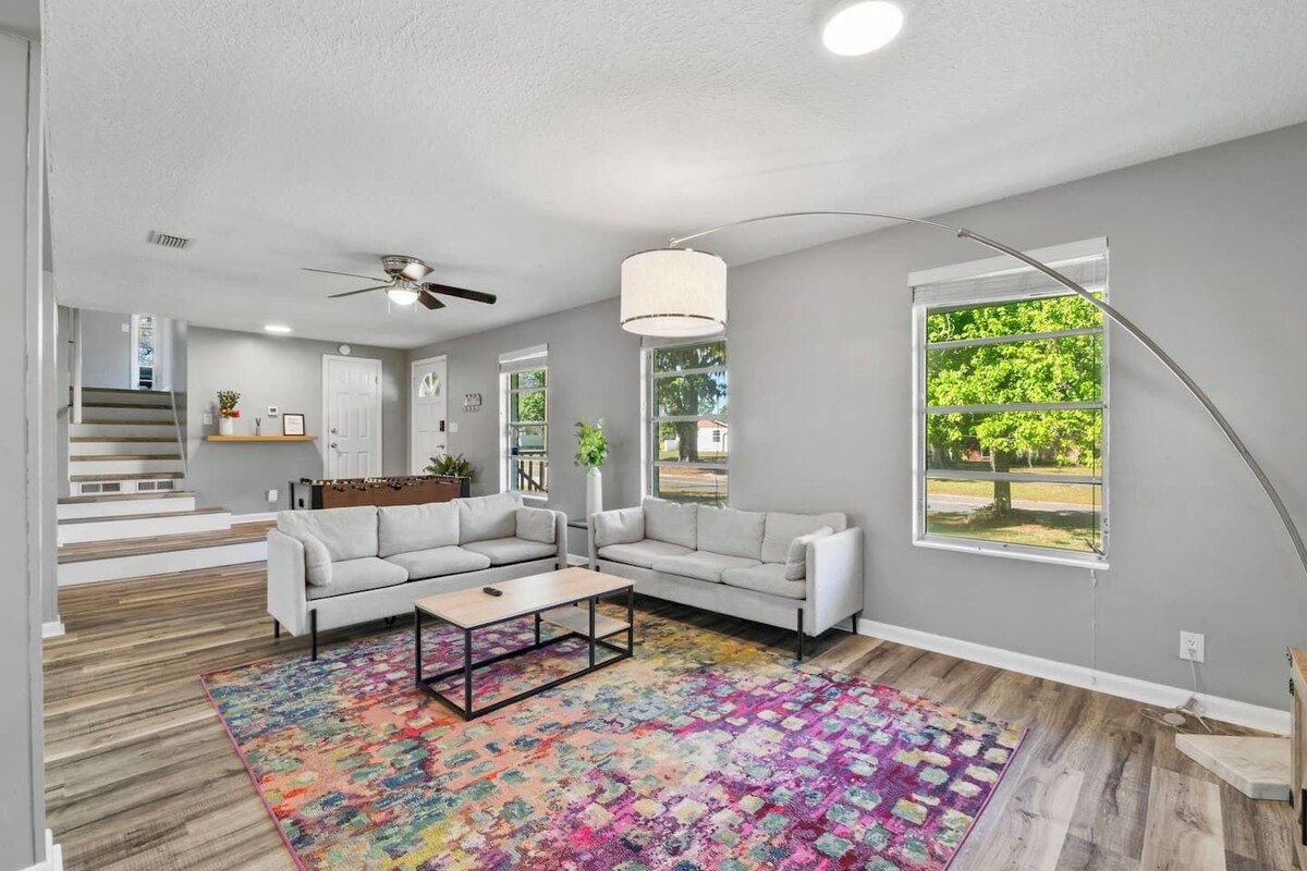 Arlingwood Abode will certainly make you feel right at home. Your family will be close to everything when you stay at this centrally-located place. You will get to experience the way of life in this vibrant area of Jacksonville. The house is cozy and tastefully designed! Alderman Park is a neighborhood in Jacksonville, Florida with a population of 4,640. Alderman Park is in Duval County. Living in Alderman Park offers residents a dense suburban feel Guests will have full access to both units. Unit A is the upstairs primary house. Unit B is the down stairs two bedroom portion. Completely separate from each other. Our home is very spacious, with formal living room with smart TV's and wifi. This space is perfect for business, pleasure and anything in-between! Home includes Foos ball table and private patio. Some of the amenities we have include: **Smart TV ** Dedicated work space, perfect for remote workers ** Large Couch perfect for Families **Big screen TVs **Beautiful Back yard **Backyard patio space and covered deck **Fenced yard **Coffee pot with coffee, cream, and sugar ** Cooking basics **Washer and Dryer **Main floor upstairs has a 1 king, 1 queen, and 2 twins with an additional 2 beds and a pull out downstairs! ** Pets accepted. Only dogs no cats. Downstairs: There is a full kitchen/kitchenette with all the appliances and cookware you need to feel at home (Microwave, Coffee Maker, Blender, Portable Cook Top). The living room is quaint and the bedroom's has a sitting area if you would prefer to read and relax. Full bathroom as well downstairs! Wifi is included with a flat screen TV. Some of the amenities we have include. **Smart TV ** Fridge ** Microwave **Fenced yard **Coffee maker with coffee, cream, and sugar ** Eating Utensils **Big screen TV **Laptop-friendly workspace and more! Car or Uber Health & Safety: We prioritize the health, safety, and comfort of our guests. Each stay is followed by a thorough cleaning to maintain a welcoming environment. Late Check-Outs & Early Arrivals 1-2 hours: $100 2-3 hours: $200 Note: Early arrivals and late check-outs are not guaranteed due to our tight cleaning schedule. Please request approval in advance. Refund Policy A 3.9% processing fee on refunds is non-refundable. Refunds will be the amount paid minus this fee, per Stripe's policy. This applies to direct booking and bookings made through select booking channels. General Guidelines ●Pets: A pet fee of $100 applies per reservation for up to 2 pets. Bringing a pet without prior notification incurs an additional $100 fee, and we may end your stay early. No cats allowed. If your pet causes any damages, additional charges will incur to cover repair or cleaning costs. ●Garage Access: Not permitted due to liability. If applicable, garage doors must stay closed. ●Age Requirement: Primary guest must be 21+, with an adult over 21 present during the stay. Food & Drink: No food or drink in bedrooms (closed water bottles allowed); extra cleaning fees for stains. ●No Smoking: Smoking of any kind is prohibited; $200 fine for violations. Additional charges will incur to cover repair or cleaning costs. ●Trash: Dispose of all trash in outside bins before departure. ●Damages: Report any damages within 24 hours of occurrence or immediately upon arrival. Failure to report damages could result in liability for repair or replacement costs. ●Dishes: Wash all dishes and run the dishwasher (if applicable) before leaving. ●Windows: Keep windows closed for security. ●Laundry: Avoid overloading machines; do not wash sandy items, and clean the dryer lint trap. ●Storage Closet: Keep this area closed and locked. ●Consumables: Leftover items are at your discretion; freshness is not guaranteed. ●Furniture: Do not rearrange. ●Parties & Events: Unauthorized parties are not allowed; violations will result in additional charges and immediate eviction. ●Only registered guests are permitted to stay at the property. If you would like to add extra guests beyond the number initially registered, please request approval before finalizing your booking. Any additional guests that exceed the maximum allowed at the property will incur an additional charge of $100 per person. This requires approval from us prior to booking. ●Illegal Activities: Will result in immediate eviction. ●Quiet Hours: 10pm to 7am. Please be respectful of neighbors. Thank you for your cooperation, and enjoy your stay! Our prices include all fees. No hidden fees.