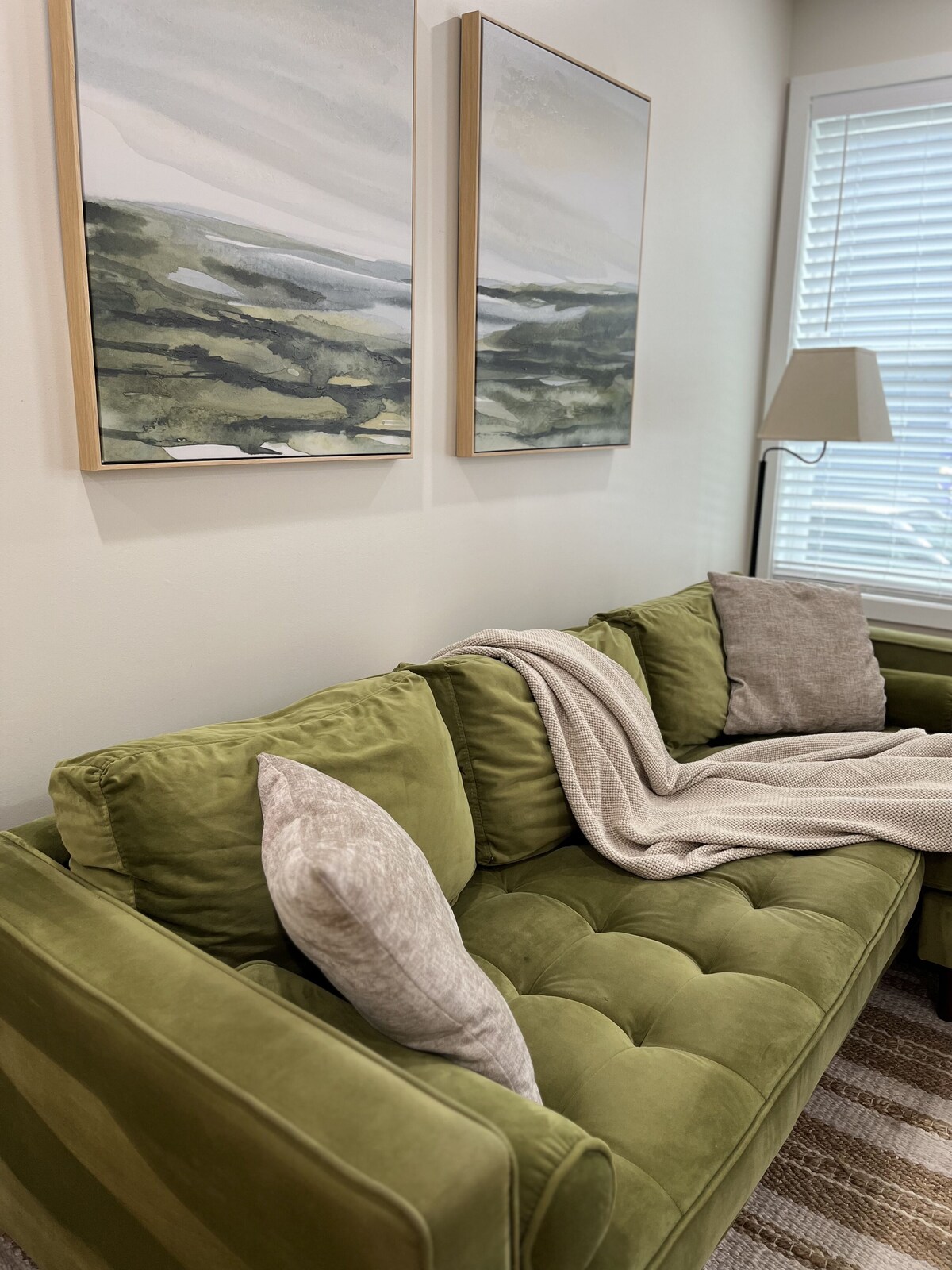 Enter to a bright and welcoming open concept living space featuring a comfortable plush couch, 65\