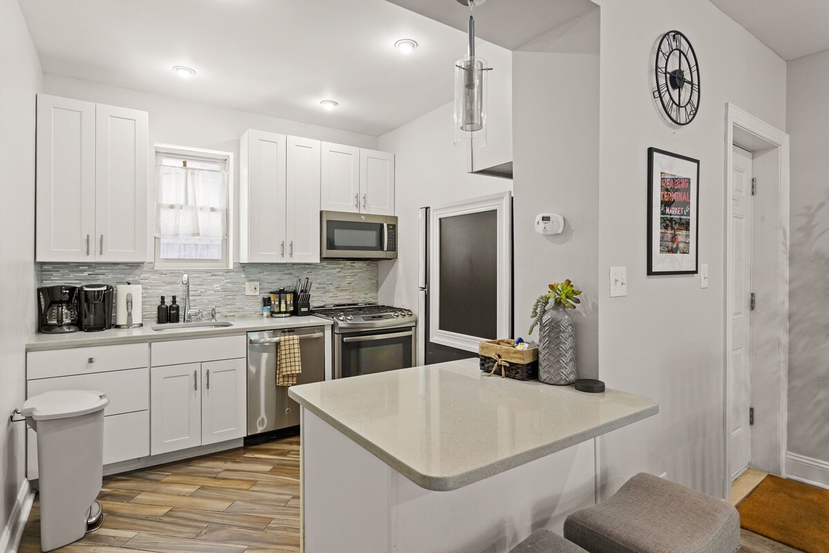 Centrally located to all the sites and eats, while overlooking beautiful & historic Jefferson Square Park. Few can match this location - stay in the heart of the action yet relish in the peace, quiet and safety of our comfortable home w/ free street parking! ⭐ “Perfect location to explore Philly!” 🌆 HIGHLIGHTS ✓ Sits on the park ✓ Walk to 30+ restaurants, bars, cafes & grocery ✓ Safe & quiet neighborhood w/ free parking ✓ Plush beds, central-air & well-appointed w/ 100 Mbps internet THE SPACE Beds to sleep 10 w/ central-air throughout Kitchen & Dining Room ∙ Stocked kitchen for at-home baking and cooking ∙ Cooking oils and seasoning essentials ∙ Coffee maker, Keurig, tea kettle and toaster ∙ Abundance of dishware, glassware and silverware, including children’s ∙ Full-sized fridge and freezer ∙ Gas range stove and oven ∙ Microwave ∙ Dishwasher ∙ Rice cooker ∙ Dining room table, seating for 6 (up to 10 w/ 2 stackable chairs and 2 at breakfast bar) ∙ Cozy breakfast bar w/ additional seating ∙ High chair ∙ Cleaning supplies Living Room ∙ Smart TV ∙ Netflix, Prime Video and Hulu included ∙ View overlooking Jefferson Square Park ∙ Pullout couch and accent chair Master Bedroom (3rd Floor) ∙ Vaulted ceiling ∙ Queen size bed ∙ Premium mattress and comforter ∙ Mounted Smart TV ∙ Accent chair ∙ Closet w/ hangers and additional mattress pad ∙ Bedside tables & lamps ∙ Full-length mirror ∙ Room-darkening shades ∙ Jefferson Park view Bedroom #2 (2nd Floor) ∙ Queen size bed ∙ Premium mattress and comforter ∙ Closet w/ hangers and additional folding mattress w/ frame ∙ Bedside tables & lamps ∙ Full-length mirror ∙ Room-darkening shades ∙ Iron and ironing board ∙ Jefferson Park view Bedroom #3 (2nd Floor) ∙ Queen size bed ∙ Premium mattress and comforter ∙ Bedside tables & lamps ∙ Room-darkening shades Bathroom #1 (2nd Floor) ∙ Shower ∙ Bathtub ∙ Makeup/shaving mirror ∙ Hairdryer ∙ Shampoo, conditioner and body wash Bathroom #2 (3rd Floor) ∙ Oversized tiled & glass shower ∙ Jack & Jill sinks ∙ Makeup/shaving mirror ∙ Hairdryer ∙ Shampoo, conditioner and body wash **Please note, as this is the city, please expect there could be city noises. 🚶 Nearby ∙ <1 min walk - Jefferson Square Park ∙ 1 min walk - Sacks Playground ∙ 3 min walk - Herman’s Coffee ∙ 3 min walk - Pennsport Beer Boutique ∙ 3 min walk - Aroma on 3rd Italian Restaurant ∙ 4 min walk - Mummers Museum ∙ 4 min - Giant grocery store ∙ 5 min walk - Ginza Sushi & Ramen ∙ 6 min walk - Philadelphia Java Company ∙ 6 min walk - Cake & Joe Cafe ∙ 6 min walk - Shot Tower Rec Center ∙ 6 min walk - Rizzo Rink (ice skating) ∙ 6 min - Walmart, Target & Acme ∙ 7 min walk - Lucky’s Last Chance American Restaurant ∙ 7 min walk - Ba Le Bakery ∙ 7 min walk - Herron Playground ∙ 7 min - Bok Bar ∙ 7 min - Pennsylvania Hospital & Jefferson Hospital ∙ 8 min - Liberty Bell and Independence Hall ∙ 9 min walk - Royal Sushi & Izakaya ∙ 9 min walk - For Pete’s Sake Pub ∙ 9 min walk - El Fuerte de Loreto Mexican Restaurant ∙ 9 min walk - Grindcore House Cafe ∙ 10 min - The Franklin Institute ∙ 11 min walk - Royal Tavern ∙ 11 min - Rittenhouse Square ∙ 11 min - Reading Terminal Market ∙ 12 min walk - Benna’s Cafe ∙ 12 min - Lincoln Financial Field & Citizens Bank Park ∙ 12 min - Philadelphia Museum of Art (Rocky Steps) ∙ 12 min - Parc French Restaurant ∙ 13 min walk - Pat’s King of Steaks & Geno’s Steaks ∙ 13 min walk - South Philly Barbacoa (featured on Netflix!) ∙ 13 min - Philadelphia Zoo ∙ 13 min - Philadelphia International Airport ∙ 14 min walk - Moonshine Philly ∙ 15 min - Please Touch Museum ∙ 17 min walk - South Street ∙ 20 min walk - Italian Market ∙ 21 min walk - Zahav Israeli Restaurant (featured on Netflix!) ∙ 24 min walk - Spruce Street Harbor ∙ 25 min walk - Magic Gardens ∙ 28 min walk - Old City Our prices include all fees. No hidden fees.