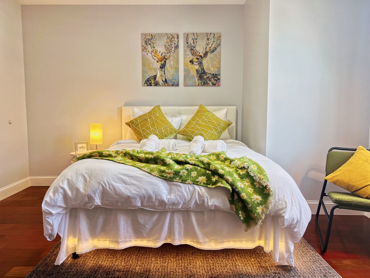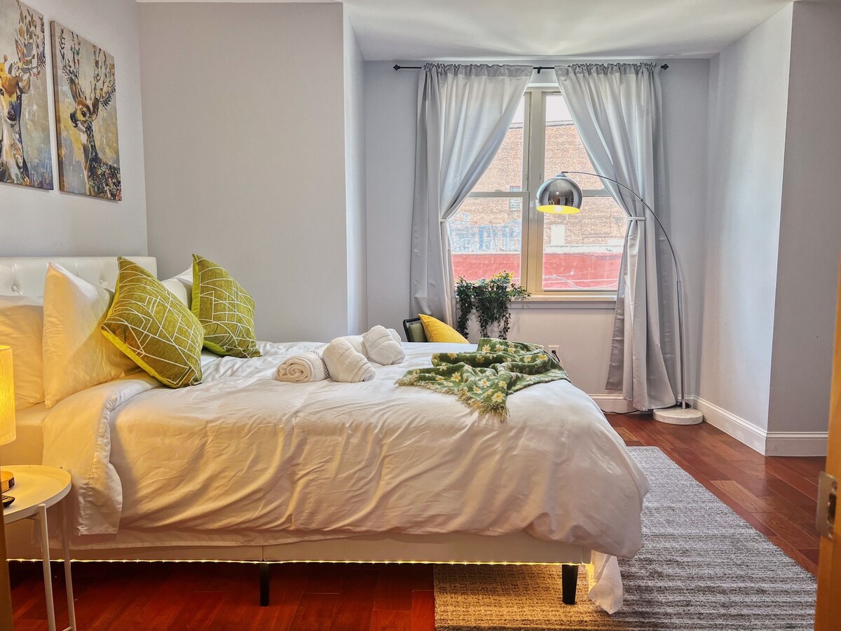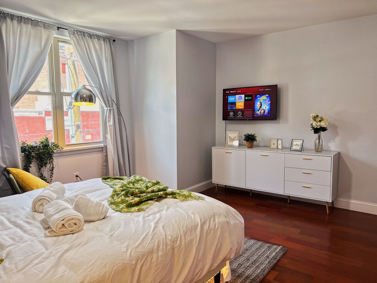 Make yourself at home in our two-bedroom apartment. Enjoy privacy with two separate bedrooms, each equipped with a TV. The master bedroom features a queen-sized bed while the second bedroom offers a full-size bed. Our full-kitchen is equipped with a refrigerator, stove, microwave, coffee maker, and all the necessary cookware and dining essentials. The adjacent dining area is perfect for enjoying your home-cooked meals. The living area features a sofa bed that can accommodate additional guests (extra bedding available for a fee). For added convenience, a washer is available for your laundry needs. The bathroom is stocked with essential toiletries and fresh towels for your comfort. Callowhill neighborhood is vibrant and conveniently located near City Hall, Center City, Reading Terminal Market, and Chinatown, offering excellent dining, shopping, and nightlife options. It is well-connected by public transit and great for jogging to the museum or a short drive to work. While the area is lively and occasionally has some noise, it remains a pleasant and appealing place to live. Just be cautious when walking outside during the night, as Philadelphia is known for safety issues at night. Ready to book your stay? Check availability now! Our prices include all fees. No hidden fees.