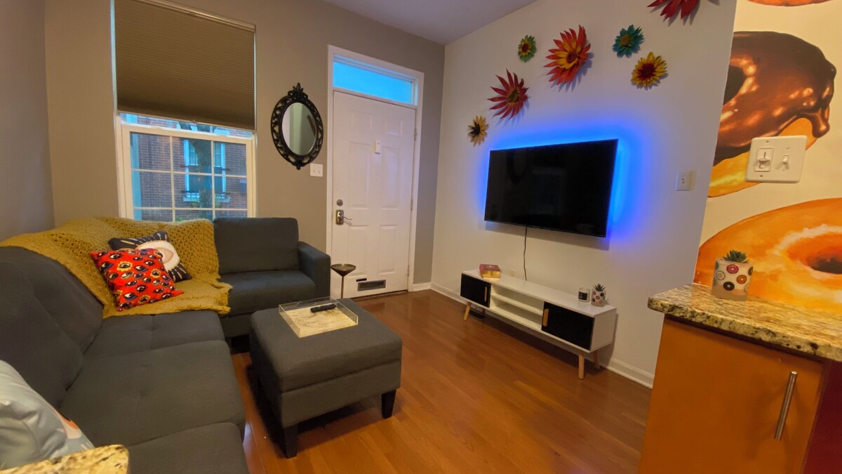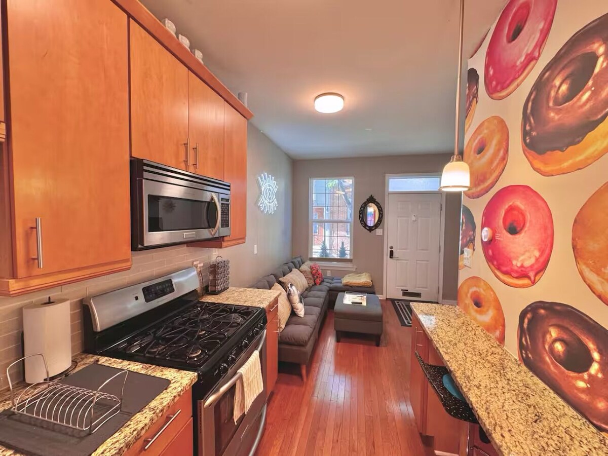 This pet-friendly, modern home is located in the charming Rittenhouse Square neighborhood, just blocks away from the city's top restaurants, shops, and sights. Its sleek, three-story design has been thoughtfully curated to offer a unique and comfortable living experience in the heart of Center City Philadelphia. With a modern aesthetic and attention to detail, this home embodies contemporary urban living. The space On the main floor, enjoy a stunning living room with a large smart TV and super comfy couch. The spacious kitchen nook offers indoor dining, and the back patio is perfect for alfresco meals and grilling. The modern kitchen boasts marble countertops and all the essentials for cooking. The second floor features the \ complete with a queen-size bed, ample closet space, and a luxurious private bathroom with a vintage Philadelphia theme and high-quality towels. Indulge in comfort and luxury on the top floor, where the \ awaits with a plush queen bed adorned with high-quality bedding and pillows. Enjoy the comfort of a window unit air conditioner during hot summer days while basking in natural light from the room's windows. The room also features a private full bathroom for added convenience and relaxation. Relax in the rustic Spanish library-themed basement, complete with an extensive literary collection or take a siesta on the comfortable full-size pullout bed to rebuild your inner peace. A warm half bathroom and laundry area add to its convenience. Guest access You will have access to the entire house during your stay, as it will be exclusively yours to enjoy. Our prices include all fees. No hidden fees.
