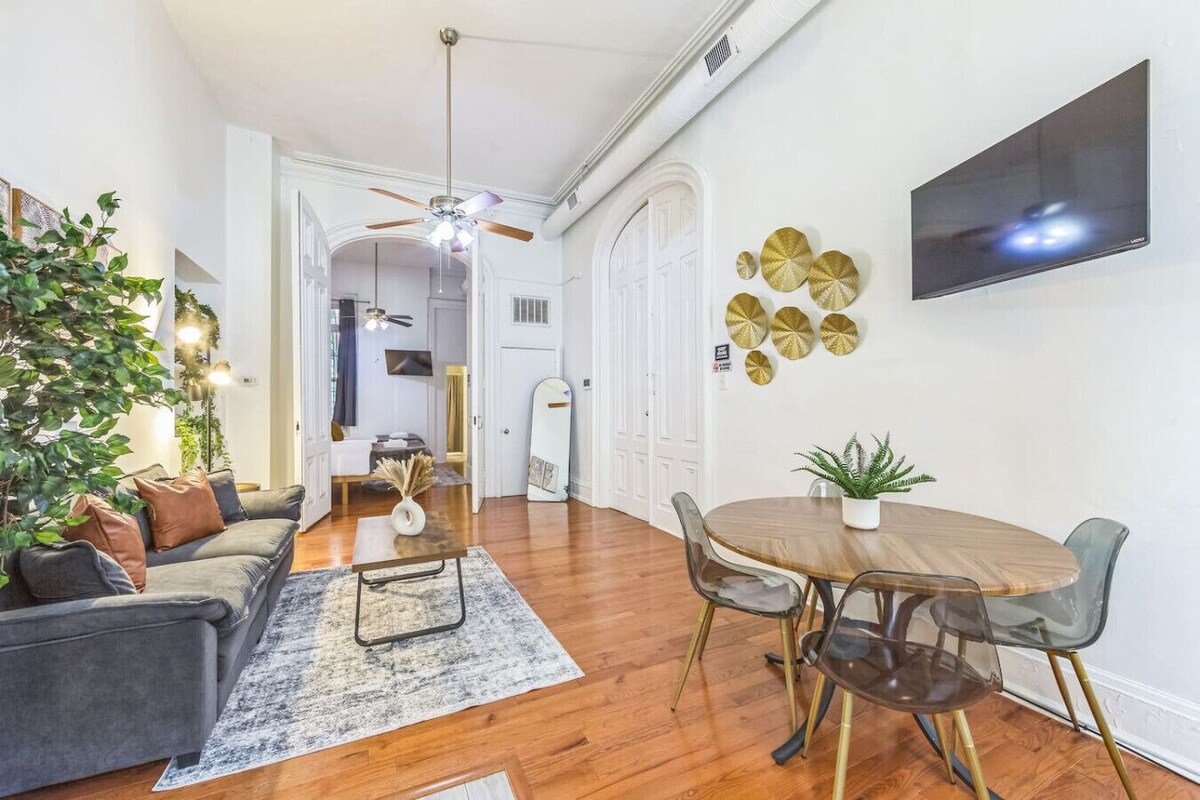 Enjoy this large, historical 1 BR unit located in the heart of Center City. Vaulted high ceilings w/palatial windows & regal doors allow an abundance of light to enter this beautiful historic home. Be just a few blocks away from Rittenhouse Square. Unit in the most prime location that Philly has to offer. Walk outside to the city`s best restaurants, lounges, cafes, and destinations. Fully equipped with every item needed to accommodate a long or short term stay. Washer and Dryer also in building. ★ Unit comes w/blazing fast High-Speed Internet ★ Washer/Dryer inside of building ★ Paid Public Parking available in Surrounding Area ★ Lush & luxurious linens with plush pillows ★ Super comfortable `cloud-like` sofa ★ Hand Towels & Bath Towels ★ Extra Linens & Bedding for 1 guest ★ Large Smart TV w/Roku in Bedroom & Living Room ★ Fully Stocked Kitchen w/all necessary utensils, pots, and pans to make a full meal ★ Essential Toiletries (Shower Gel, Conditioner, Shampoo) ★ Modern Steam Shower ★ Memory Foam Queen Sized mattress ★ 2 Queen sized Beds ★ 1 high-quality aero-bed for 1 extra guest ★ Keyless Entry w/Code changed in between each guest for added security ★ Floor Length Mirror ★ Regular Drip Coffee machine ★ Tea Kettle ★ Blender ★ Stove Top & Oven ★ Microwave ★Toaster You will be reserving this entire unit. No part of this apartment is shared with anyone else. Our team is also a short message or phone call away. Ready to assist you with any needs that you might have during your stay. We’re happy to offer flexible check-in and check-out times whenever possible to make your stay more enjoyable. Here’s a quick overview of our options: Standard Times: • Check-In: 4:00 PM • Check-Out: 10:00 AM Flexible Check-In & Check-Out: • Early Check-In: 2:00 PM (if available) for an additional $25 • Late Check-Out: 12:00 PM (if available) for an additional $25 • Please Note: Unauthorized check-ins or late check-outs may incur a $100 fee, so be sure to reach out to us first! Please note that parties or events of any kind are strictly prohibited. Any unauthorized gatherings or events will result in a $1000 fine and immediate cancellation of the reservation. Quiet hours are from 10pm-8am Surveillance cameras are in the hallways of the building that monitor & record all activity 24/hrs. This is a non-smoking property. Smoking is not permitted anywhere on the property. Also, in the case of any guests using illicit drugs within the unit or building. All guests will be reported to local authorities and evicted immediately. PARKING: There are several public parking lots nearby, all within a short walk or drive from the property, so you’ll have plenty of options. We recommend using the `BestParking` app, which shows all available public parking spots in the area and allows you to compare prices. It’s a tool that many of our guests have found really useful! PLEASE NOTE: We are pet-friendly, but pets must be registered at the time of booking. A non-refundable ($25 per pet/per day pet) fee will automatically be added to your reservation. If a pet is found on the premises without prior registration, your reservation will be cancelled, you will be evicted, and a $500 fine will be charged by Airbnb. Our prices include all fees. No hidden fees.