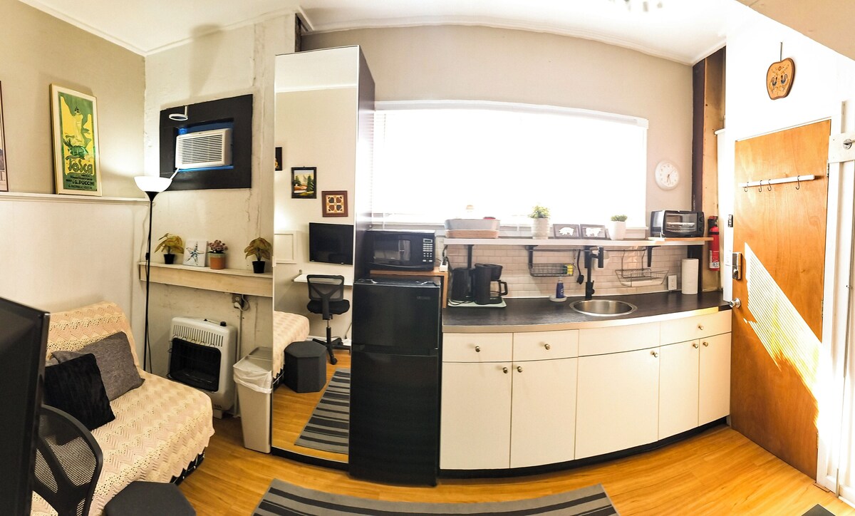 Welcome to Cozy Vibe MicroFlat Your own little retreat in the city. This thoughtfully designed micro-studio has everything you need for a comfortable stay — a snug sleeping nook, a fully equipped kitchenette, and a clean modern bath. What you’ll love: - Warm, inviting décor with a touch of style - Smart layout that makes the most of every inch - Fast Wi-Fi + SmartTV, NETFLIX, Prime, HULU+LiveTV, Disney, AppleTV - Walkable to restaurants, cafés, and nightlife - Easy access to public transit Whether you’re in town for work, a weekend getaway, or just need a quiet place to recharge, Cozy Vibe Studio is the perfect spot to rest and reset. Our prices include all fees. No hidden fees.