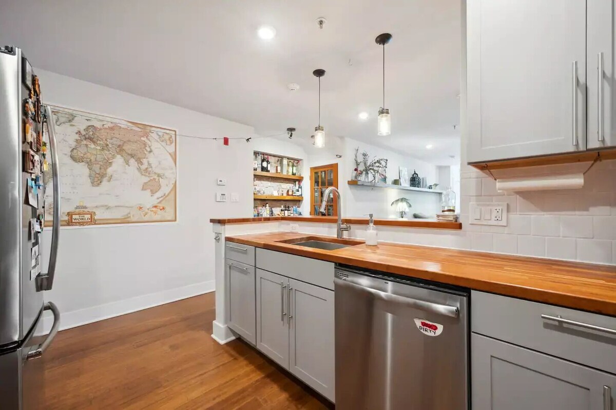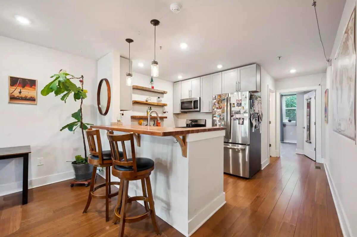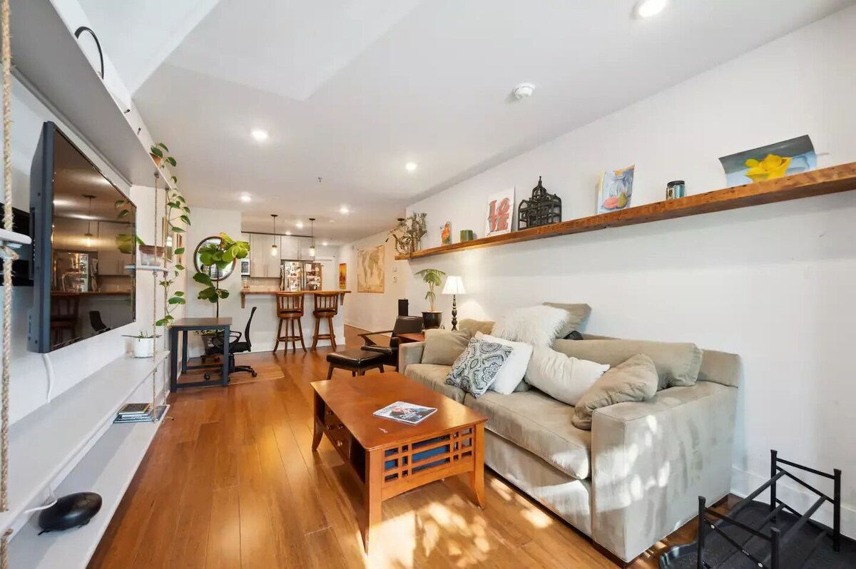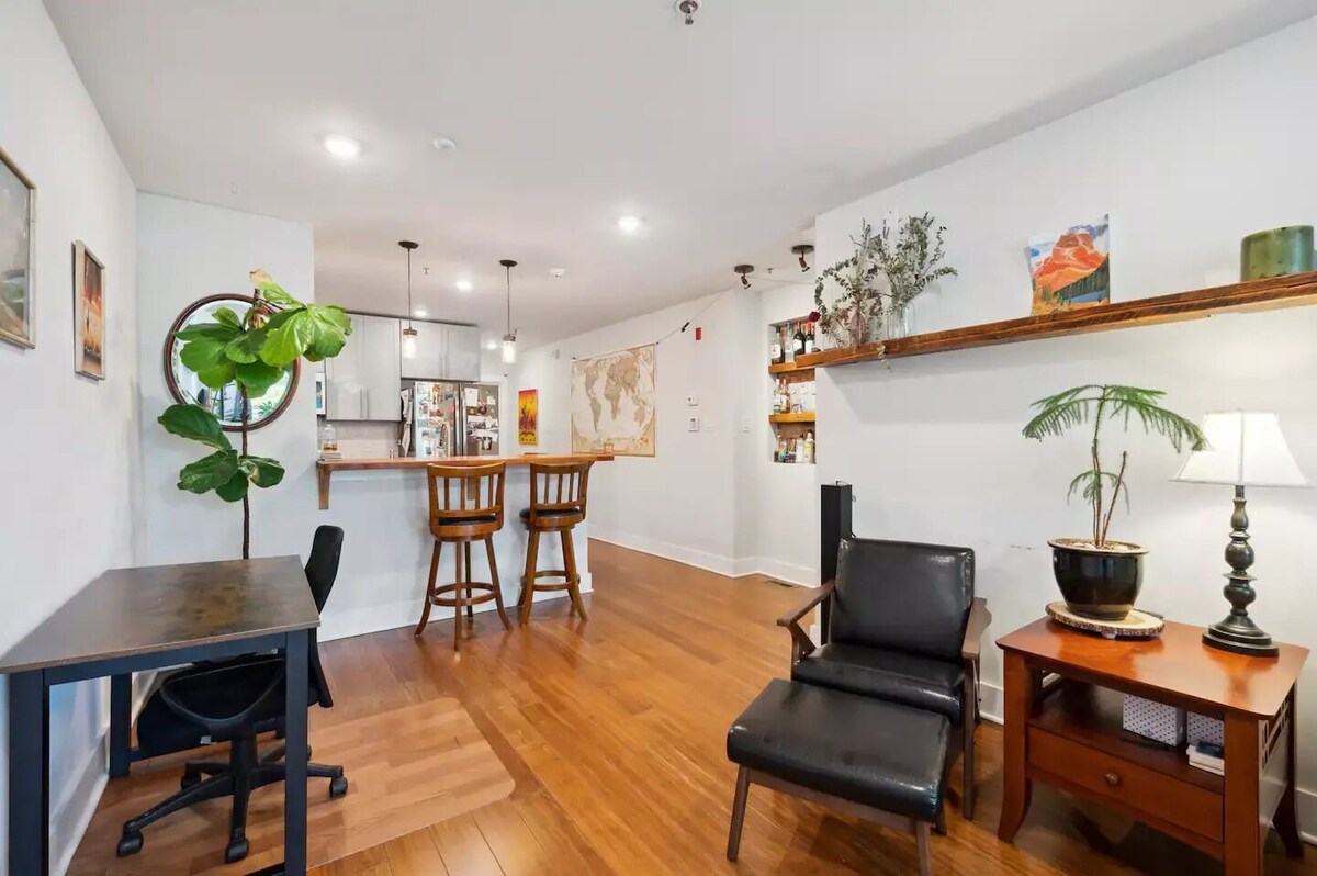 Plant-filled ground floor apartment with patio, conveniently located in the heart of Fairmount/Art-Museum area. The entire building was completely renovated a few years ago The space Access by digital code locks. Living room in front with natural light tv, couch, love seat, and fold-down desk workspace. Full-sized galley kitchen with stainless appliances (including French door fridge, dishwasher, microwave, gas oven, and garbage disposal). Butcher block countertops and bar seating. Full bathroom with shower and fan heater. Bedroom in rear with queen mattress. Private rear patio with custom-built cushioned bench, wood swing, and pull-up bar. Additional sleeping space would be the couch and/or a provided aero bed, located in bedroom closet upper shelf. Guest access Full access to all rooms/closets on the 1st floor. Access to the washer/dryer. Other things to note Apt is a block or two from all of the cafe's/bars/shops throughout Fairmount. Walking distance to: - Schuykill River Trail/Fairmount Park (5 mins) - Art Museum/Ben Franklin Parkway (5 mins) - City Hall (15 mins) - Whole Foods (10 mins) - Eastern State Penitentiary (2 mins) - Bus stop to center city/throughout town (1 min) - Indego BikeShare docking station (1 min) Our prices include all fees. No hidden fees.