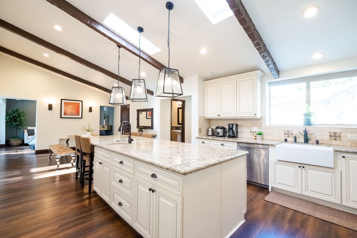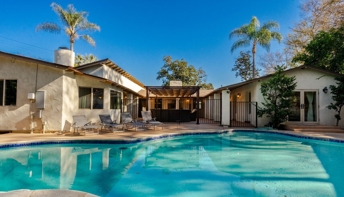Escape to our stunning Spanish-style villa in Toluca Lake, perfect for groups seeking both shared experiences and private retreats. Two detached casitas, each with a full bathroom, complement the main house, ensuring everyone enjoys their own space. Enjoy the Outdoors: - Heated pool (additional fee) - Free jacuzzi heating - Built-in BBQ - Garage game room with mini golf and ping pong - Dedicated work desk - 2 Mini Golf Course (backyard) Absolutely NO PARTIES whatsoever. Prime Location: - 5 minutes from Warner Bros. & Universal Studios - Situated in a quiet and safe neighborhood, tucked away at the end of a cul-de-sac (a street with a dead end) - Also, very close to the highway for exploring LA (please note: some highway noise may be audible, but our guests consistently find the convenience of the location outweighs this factor) Comfort & Entertainment: - Memory foam mattresses for restful sleep - Fast WiFi & smart TVs with Netflix for movie nights - Large outdoor space for dining under the stars - Fully equipped kitchen for culinary creations Additional Notes: - Casitas are detached from the main house which means each casita offers privacy and separate entrance. - One casita has a window AC unit, while the other has two box fans. - The casitas are Bedrooms 1 and 2. Pool Heating: If you'd like to enjoy a warm swim or soak, we offer pool heating for an additional $100 per night. If you'd like us to heat the pool before your arrival, just let us know and we'll send someone on our team to do so in the morning. Please note, the pool can take anywhere from 5-10+ hours to heat up, depending on the outside temperature. Please keep in mind: our pool is surrounded by beautiful nature, which can sometimes lead to leaves and twigs ending up in the water. On windy days, there may be more leaves than usual, but we do have a twice a week pool cleaning service to keep it in tip-top shape. We do keep a pool net there just in case you need to use it. ----------- OTHER THINGS TO NOTE: To abide by local legal requirements, you may be asked to complete a secure verification portal by providing a copy of your official government-issued photo ID, confirming your contact information and sharing the purpose of your stay. The information is collected for screening and verification only and is not stored or used for any other purposes. By making a reservation, you acknowledge that you may be required to provide a copy of a valid government-issued ID prior to check-in. You understand that your check-in instructions might be withheld until you have successfully completed verification steps in our guest portal. For security and to prevent unauthorized parties, please be aware there are two cameras on the property: - Ring Doorbell Camera at the front gate - Backyard facing pool ----------- We're thrilled to have you considering our property for your next stay! When making your reservation, we'd love to know a bit more about your group. If you wouldn't mind, please provide us with the following information when you book or message us: 1. How many guests will be staying with us and their approximate age range? Will there be any visitors stopping by during your stay? 2. The purpose of your visit – is this a relaxing vacation, a busy business trip, or something else entirely? 3. Confirmation that you've had a chance to read through our house rules. You can find these in the \ section at the bottom of the listing. ------------- House Rules: Welcome to our home! We want you to have an amazing time, so we've put together some friendly tips to ensure everyone has a great stay: 1. **No smoking or parties, please!** We have a NoiseAware and Ring doorbell to help us keep things quiet and peaceful for all. 2. **Respect our neighbors.** Please keep things quiet after 10 pm, especially any music or outdoor gatherings. No swimming for groups or kids after 10 pm either. 3. **Let us know who's coming!** Please tell us the exact number of guests staying at the house and if anyone plans to visit during your stay. 4. **No fires, please!** The fireplace is just for decoration, and we're in a fire hazard zone, so no fires anywhere on the property, including smoking. 5. **Parties and events are strictly prohibited.** 6. **Keep things tidy!** Please clean up after yourself to help keep our home neat and tidy. 7. **Pool and garden care:** We have a gardener (Saturdays) and pool service (Mondays and Thursdays) come every week. You can request for additional cleanings for a fee (covered by the guest) if needed. Please note that sometimes leaves and twigs might fall into the pool, especially between service days. If that happens, feel free to use the pool net to scoop them out. Thanks for helping keep things sparkling! 8. **Furry friends welcome!** We love pets, and they're welcome to join you for an extra fee of $250 per pet. Just let us know beforehand so we can approve it. 9. **Check-in and checkout times:** We're happy to offer early check-in or late checkout if we can, but it depends on availability. There might be an extra fee of $50 per hour. **A friendly reminder:** While we want you to have a fantastic time, we can't be responsible for any accidents or injuries that happen during your stay. So, please be careful and have fun! We're here for you 24/7 if you have any questions or need anything at all. Enjoy your stay! 😊 ------------- FAQ - Why does the price change? We use dynamic pricing software that changes the rates from time to time - Can you tell me more about this Noiseaware system? Noiseaware is a gadget that alerts us when the noise level has reached its threshold. This device doesn't record video nor audio, it only notifies of the noise level inside and outside the property. Do you allow dogs/pets? Service animals may be accepted with appropriate certification provided to us and if approved by hosts. There is also an additional $250 pet fee associated. - Do you have serving dishes and utensils for large groups of people? W