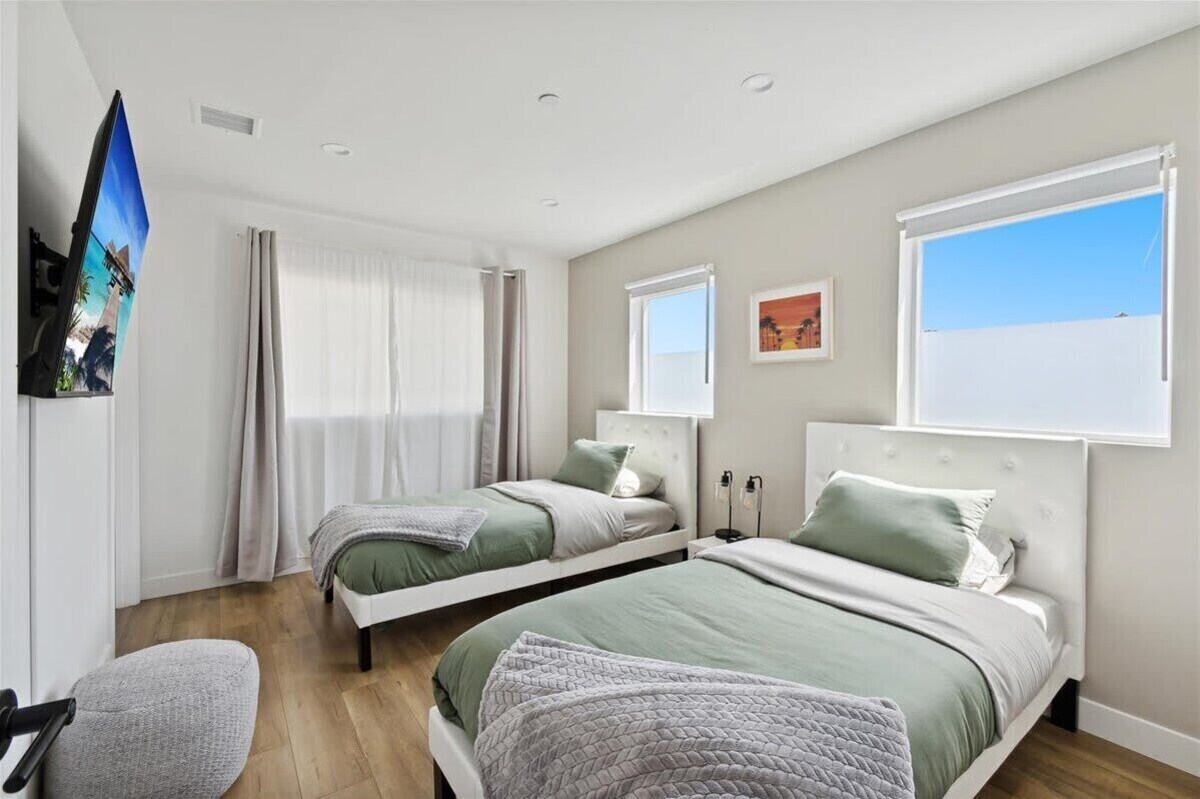 Summary: • New Construction ('23) 3BR/3BTH townhouse in Hollywood East • Near major attractions: Walk of Fame 5 min, Hwood Bowl 10 min • ALL BR's have TV's, High-quality bedding, blackout curtains, multiple charging ports • Equipped kitchen to cook a great meal + Keurig for coffee in the AM :) • Multiple private outdoor balconies! • Hwood sign views from upstairs • Private Garage parking for two cars • Full Bath for each BR (not all connected) • Full Desk for work + FAST WiFi • Fully Gated property, Safe & Secure The Space: Welcome to our striking, newly built 3BR/3BTH townhouse situated in the heart of East Hollywood. A testament to unmatched comfort and tasteful design, this property offers an experience that is unrivaled in the city. Every inch of our home has been designed with thoughtful consideration, ensuring it caters to all your needs while simultaneously offering an aesthetic appeal that is hard to resist. Echoing minimalist Scandinavian design principles, our space pairs simplicity with functionality, offering a clean and comfortable ambiance for your stay. Located minutes away from major tourist attractions, great restaurants, and local hotspots, our home ensures a seamless exploration of what Los Angeles has to offer. Marvel at the iconic Hollywood sign from the comfort of our upstairs bedrooms, venture to Universal Studios, explore Griffith Park, take a stroll on Hollywood Boulevard's Walk of Fame, or bask in the glamour of Sunset Strip - all within a short distance from your temporary abode. Inside, you'll discover an array of top-of-the-line amenities designed to ensure your absolute comfort. Each bedroom is equipped with high-quality bedding, blackout curtains for an uninterrupted sleep, and a television for your entertainment. Not forgetting the digital nomads, we provide high-speed WiFi throughout the property and have a dedicated work area with charging ports, lamp & notepad. This property is 3 floors, so there are stairs our guests will need to use. Laundry is inside the unit as well and has everything you need to keep fresh and clean. Parking is inside your secure, two-car tandem garage that offers direct access to the unit, making parking and transportation effortless. Moreover, our property is completely gated, providing you with the utmost safety and security during your stay. -High end beds, bedding, bath towels -TV's in all rooms -Board games and cards to enjoy for kids and adults -3BR's total -Bedroom #1: King, Bedroom #2: Queen, Bedroom #3: 2 twin beds, , Common area: Queen Air mattress/Sofa -Kid friendly- baby supplies available for rent -Super Fast WIFI (200 MBS) -Fully stocked kitchen for everything needed to make a great meal at home -Stocked Keurig Coffee machine + drip coffee machine as well -Sleeps up to 10, with 8 in real beds. -Free parking on site in the 2 car tandem garage (one large vehicle and one medium will fit). **Very tall or XL vehicles may not fit and would be required to park off site. There is no ability to park on-site if your car does not fit in the garage. Please ask and we can tell you for sure ahead of time** Bedding & Sleeping quarters: Bedroom #1 (Master- Top floor)- King bed, Connected bathroom, top of the line memory foam mattress and bedding, blackout curtains, convenient and numerous outlets for charging your devices, desk work area, 55\ TV with Netflix and all major streaming services, convenient and numerous outlets for charging your devices, small outdoor patio. Bedroom #3 (Middle Floor)- Two twin beds, top of the line mattress and bedding, blackout curtains, convenient and numerous outlets for charging your devices, 50\ ,