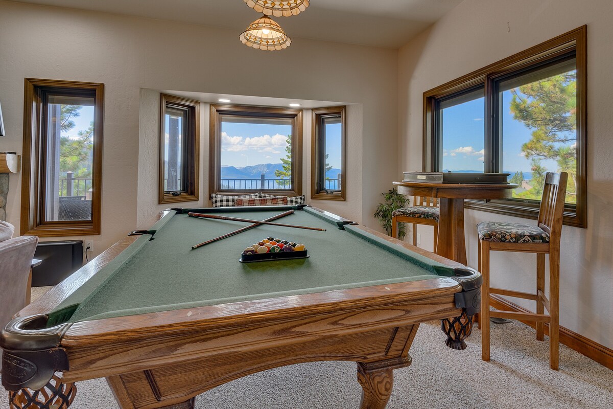 Permit # DSTR1097P Occupancy Rules: *Min age to rent any property is 25. If you, the credit card holder- person signing the contract- and person responsible for the reservation, rents this house and are not 25, we will cancel the booking and you will not get a refund, no exceptions, you MUST be 25 or older. *Per county rules: Weddings are NOT allowed of any kind or size, on the property or at the house. You will be shut down immediately and will lose the security deposit and will be subject to more fines. *You are only allowed 8 people at any time at the house. This includes any dinners or gatherings you may have. *Please help us to keep our home a vacation rental. NOISE ORDINANCE 9pm to 8am DAILY and is very strict in this neighborhood. * Fireworks, wood fire pits, and charcoal BBQ's are illegal in the Lake Tahoe Basin. **Parking: 2 cars allowed at house at any time. There is no street parking per county and fire safety rules. Pursuant to DCC 20.622.040 (D) (6) Failure to park in the designated parking spaces and/or display the parking permit may result in a citation and fine of $500 to the responsible party or person of the vehicle. You must display the parking pass in both vehicles during your stay. They are in the rental house. *Please be prepared for winter driving conditions as we are above 7k feet in elevation, and we do get snow. ~ This home does NOT have AC. This Lake Tahoe home offers beautiful panoramic views of the lake and mountains. The house offers a nice open layout so you can really spread out while in the house with family or friends. With a pool table and indoor hot tub you will will have all the comforts of home with a few added perks! Located just minutes from the Stagecoach ski lift at Heavenly, what more could you ask for in a Lake Tahoe vacation home. In the living room is a pool table with an amazing view of the lake. BR1 master, has a queen bed, TV and full bath; BR2 has a queen, TV and a shared full bath; BR3 has 2 bunk beds both with twin on top of twin. The indoor hot tub is in the hallway along with a full bathroom and a laundry room. There are many steps from the parking area to the front door of the unit. The driveway is also steep and gets icy during the winter. There are 2 spots in the garage for this unit, the garage could be a tight fit for large SUV's. There is outdoor parking for large vehicles that is first come first serve. Our prices include all fees. No hidden fees.
