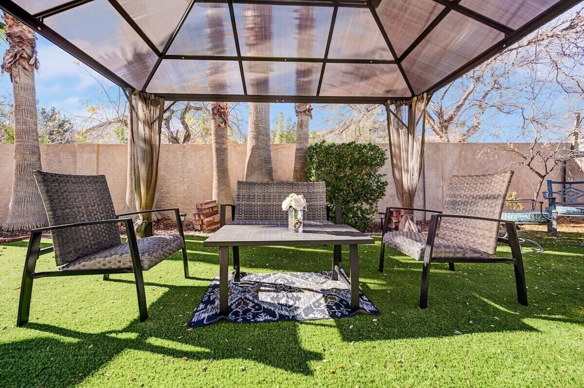 Summary: Don't forget to click the \ icon for special offers on our charming Las Vegas house! 》Indulge in luxury at our spacious multi-family home: ✦ 1531 sqft of elegantly appointed space with all modern comforts ✦ A gourmet kitchen with top-tier appliances ✦ A serene outdoor gazebo ✦ Free high-speed Wi-Fi, central air conditioning, and heating for year-round comfort ✦ Near Top Attractions Book today and experience the excitement and convenience of Vegas from your private oasis! The Space: Welcome to your stylish haven, just minutes away from the dazzling Las Vegas Strip. Get ready to escape and enjoy all that Las Vegas has to offer! ✦ Get ready to enjoy 1531 sq. ft. of pure comfort and elegance, perfect for both relaxation and entertainment. It's the perfect space for you to unwind and have some fun! ✦ Looking for a luxurious stay? Plush Retreats has got you covered! Experience the ultimate comfort with four opulent bedrooms, each featuring sumptuous beds and tranquil decor. And to make your stay even better, we've got 2.5 upscale baths waiting for you. Get ready to indulge in a relaxing and rejuvenating vacation! ✦ Unleash your inner chef in a kitchen designed for culinary excellence. Gourmet touches abound, ready to complement your creations and bring your cooking to the next level. ✦ Savor peaceful moments or host festive gatherings in our picturesque gazebo surrounded by lush greenery. ✦ Enjoy effortless living in Las Vegas with easy self-check-in and a dedicated team available 24/7, ensuring a comfortable and unforgettable stay. Guest Access: ★ SLEEPING ARRANGEMENT - 2 BEDROOMS ★ ⓵ Primary Bedroom: This serene sanctuary features a luxurious king-sized bed, ensuring a restful night's sleep. ⓶ Second Bedroom: Comfort meets style in this room with a cozy king-sized bed. It's tastefully decorated, offering a peaceful retreat after an exciting day in Las Vegas. ★ BATHROOMS ★ ⓵ Full bathroom with bathtub ⓶ Full bathroom with bathtub ⓷ Half Bathroom: Convenient for quick visits, ensuring everyone's comfort. ★ COMMON SPACES ★ Gather and enjoy: ✔ Living Room: A cozy spot with plush seating and a Smart TV. ✔ Kitchen & Dining: A fully equipped kitchen and a welcoming dining area. ★ BACKYARD OASIS ★ ✔ Gazebo Area: Unwind in the shade of our stylish gazebo, perfect for enjoying a book or a glass of wine. ✔ Dining Al Fresco: Utilize our outdoor dining set for meals under the sky, whether it's a breezy breakfast or a starlit dinner. ✔ BBQ Grill: Channel your inner chef with our BBQ grill, ready for you to sear steaks or grill veggies to perfection. ✔ Lush Green Lawn: The synthetic grass area provides a clean and green space for kids to play or for you to bask in the sun. ✔ Seating Options: Choose from various seating arrangements, including lounge chairs and a bench, to suit your mood and company. Book now for a stay that promises all the comforts of home with the excitement of Las Vegas just a short drive away! Other Things to Note: ⬇RULES⬇ ▶ To avoid insects and mold, please keep all windows and doors closed. Leaving them open while the AC is on could result in a fee up to $500. For your comfort, we recommend setting the AC between 72-83°F. ▶This house is privately owned and does not include maid service or daily cleanings. The cleaning fee covers a final cleaning (after your checkout). ▶ Unregistered guests are not permitted. ▶We are happy to accommodate small to medium-sized pets (20–50 lbs, 15–20 inches tall). This guideline helps us maintain cleanliness and protect the condition of the property. A non-refundable pet fee of $125 per pet per stay applies only if noted at booking. If not, we’ll request the fee manually. Pets outside the size range or undeclared may incur a $250 fine. ▶ No parties. Significant noise or playing loud music after 9:00 pm will result in you being asked to leave without a refund for the remaining time of your reservation. ▶ No smoking of any substance is permitted in the unit. Evidence of any type of smoking will result in a $250 fee, and you will be asked to leave without a refund for the remaining time of your reservation. ▶ Check-in is at/after 4 pm and check-out time is no later than 11 am. Early check-in or late check-out is subject to availability. Late check-out without prior approval will result in a fee of $100 per hour for each hour after 11 am. ▶ During check-in, you will find towels, linens, shampoo, conditioner, soap, and toilet paper provided for your convenience. Please note that we do not provide additional supplies during your stay, so we recommend planning accordingly. ▶ Please note that moving the furniture in the apartment is not permitted. Violation of this rule can result in a penalty in the amount of $250. ▶ The trash is removed every Tuesday (if your reservation is fallen on these days, please kindly place the trash containers on Monday evening outside by the road so the trash can be picked up, and place them back after the trash is picked up, but no later than Tuesday evening). ▶ Do not flush paper towels, wipes, trash, or feminine products down the toilet. Please use the bins instead. If it is found that something has been flushed and clogged the septic system, you could be charged damages. Interaction with Guests: 》 Please note that we are available to assist you with any questions or inquiries you may have. Feel free to reach out to us prior to booking, and we'll be more than happy to provide you with any additional information you need to ensure a pleasant stay. Our prices include all fees. No hidden fees.