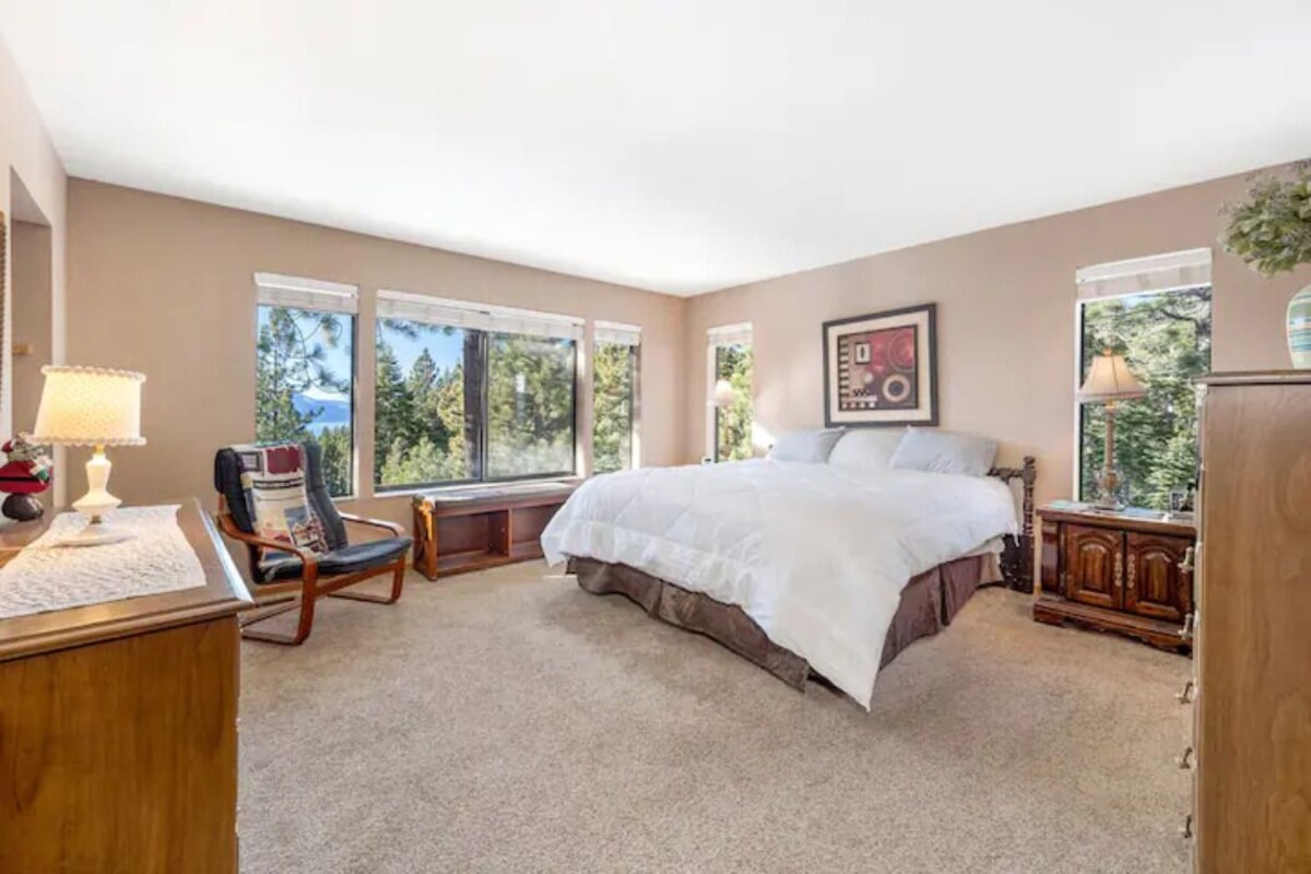 Welcome to Tahoe Vacation Stays! Beautiful private hilltop location 3 bed/2 bath home w/BBQ, Hot Jacuzzi on huge deck w/lake treetop views from all rooms, 4 min from Tahoe waters, Heavenly Ski Resort, Casinos, Restaurants, & all the action w/out the noise & busy-ness of town. Sleeps 12 guests w/1 King master w/ bath, 1 queen bdrm, 1 triple bunk bed & living room sofa sleeper. Douglas County Community Development Vacation Home Rental Permit - DSTR1544P Our prices include all fees. No hidden fees.