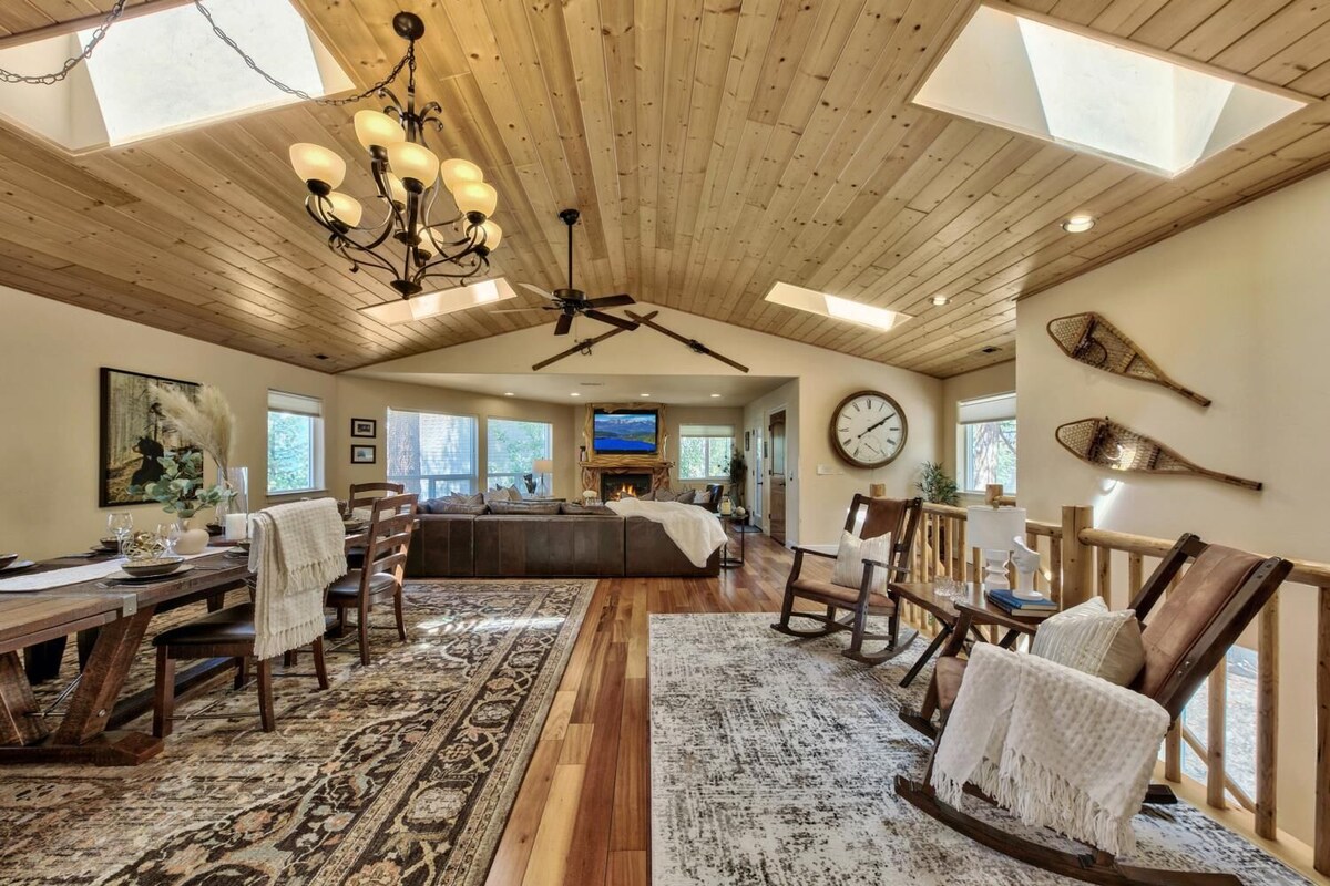 Elevate to Rooftop Lake Views amidst Mountain Luxury! Stunning lake views from your private deck & hot tub! Custom features: Handcrafted “blue vein” wood fireplace in great room, matching bar, lodge pole pine staircase, KOA Tiger wood floors, solid alder doors. Master suite w/ vaulted wood beam ceiling, 2-sided gas-log fireplace, custom “walk-in or roll-in” shower w/ beautiful pebble stone floor & steam room feature, jetted tub, dual vanity. Kitchen has granite counters, alder cabinets, stainless appliances, skylights. Private 1st level w/ 2 bedrooms, 2 full baths, large laundry rm. Main living, + master suite on 2nd level. This home is close to the beach, pier, ski areas & casinos! There is something for everyone here PROPERTY MANAGEMENT Amber Mcdade B.1000666 PM.163829 Permit #DSTR1164P. Maximum daytime 14 and nighttime occupancy 8 Notice that gatherings and events that exceed the maximum occupancy of the vacation home rental are prohibited Maximum number of allowed vehicles 4 Notice that renters will be issued parking placards which they and their guests must display on the driver's side dashboard of their vehicles, that renters and their guests will be required to park only in designated parking areas, and that failure to park in designated parking areas and/or display the parking placards may result in a citation and fine of $500; and Quiet hours are designated between 9:00 pm and 8:00 am and will be strictly enforced. We also ask that you sign our stay agreement. Our prices include all fees. No hidden fees.