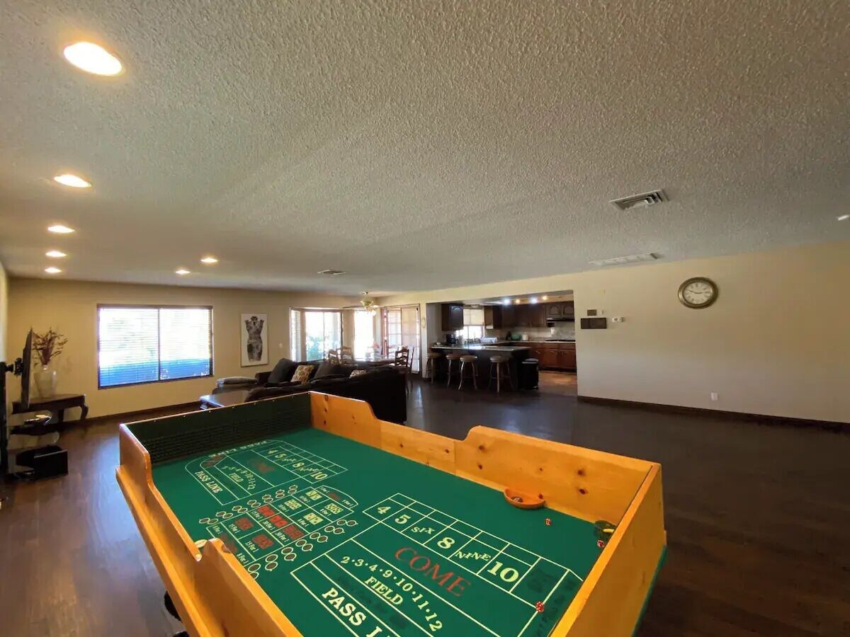 Welcome to the Cozy & Spacious Oasis: A Group-Friendly, Licensed Vegas Retreat! Welcome to our expansive 4,250 sq ft ranch-style haven, featuring four bedrooms, 4.5 bathrooms, and a 3-car garage. Nestled only 15 minutes from The Strip and conveniently located near the freeway, you’ll enjoy all that Las Vegas has to offer within easy reach. Our place is one of the fewer than 200 STRS in Las Vegas that are fully licensed, ensuring that your stay will be completely legal and uninterrupted. The space Our generously sized, vintage abode is designed with elements that echo the vibe of a cozy resort. Highlights include: ❀ Kitchen w/ cooking utensils ❀ High-speed Cox internet ❀ Indoor and outdoor dining areas ❀ An outdoor patio ❀ A trio of game tables: poker, blackjack, and craps ❀ Large flat-screen smart TV equipped with Fire Stick and complimentary Netflix ❀ A large private swimming pool and a Jacuzzi ❀ BBQ grill Several rooms in our home come with plush carpeting, closet organizers, and en-suite bathrooms that feature separate showers and jet tubs. Whether you're planning a family/group vacation, a WSOP tournament, an extended stay, or a corporate trip, our home provides remarkable value and an ambiance that is both welcoming and relaxing. Note: Heating the Jacuzzi incurs an additional $50 charge for the entire duration of the stay. Please reach out to us after booking for assistance. Guest access As our guest, you’ll have unrestricted access to every part of the home, excluding a side room that we, as owners, occupy for office/storage purposes. Other things to note Other Things to Note In compliance with city ordinances, we maintain occupancy in one of the side rooms which functions as our office. We have a separate entrance/exit from the garage to this office, ensuring your privacy and peace aren’t disturbed. The property is privately owned, and we hold no responsibility for any accidents, injuries, or illnesses that occur on the premises. Likewise, we aren't liable for any loss of personal belongings or valuables. By accepting this reservation, guests assume the risk of any harm arising from their use of the premises or others they invite to use the premise. For everyone's safety and security, security cameras have been installed in the front and back pool areas. This footage isn't shared and is recorded strictly for liability purposes. It's important to note that these cameras in no way intrude upon your expectation of privacy in these public areas of the property. Any attempt to disable or obscure the cameras is prohibited and may result in eviction without a refund. ❁❁❁ In the interest of maintaining a peaceful atmosphere for all, we kindly request a maximum of 8 guests on the property at any given time. This policy helps us ensure our retreat remains a serene and tranquil space for all our guests, as well as our lovely neighbors. We greatly appreciate your understanding and adherence to this rule. Non-compliance may unfortunately result in ending your stay early. Rest assured, we aim to avoid any uncomfortable situations and trust our valued guests will respect this guideline. ❁❁❁ License number: G67-01317 Registration number G67-01317 Our prices include all fees. No hidden fees.