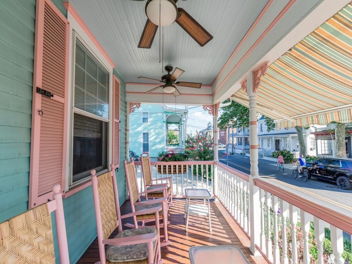 Beautifully maintained three story Victorian home featuring five bedrooms, three full bathrooms with additional outdoor shower and bonus basement shower. Sleeps fifteen comfortably with three king size beds, two queen beds, and an additional two queen sleeper sofas and a rollaway bed. First floor has a queen pull out, second floor has two queen bedrooms and a sitting room with a queen pull out, third floor has has three king beds and front bedroom has rollaway bed. Washer and dryer and bicycles in the basement. Two living rooms with tv and couches, full kitchen with subzero refrigerator. Restored hardwood floors, original wood moldings and trim. Gorgeous front porch that is great for people watching complete with rocking chairs, a retractable power awning and lighted ceiling fans. Sit back and watch the antique trolley tours go by, horse drawn carriages and the annual Christmas parade. Parking for three cars. Plenty of space to relax and enjoy the shore. Two blocks from the beach and just steps to the Washington Street Mall, the famous Congress Hall Hotel, and many of Cape May s most popular restaurants and cafes. This is a pet friendly property. If bringing a dog an additional $150 fee will be added to the lease after booking. If bringing more than one dog please contact us for fee. Our prices include all fees. No hidden fees.