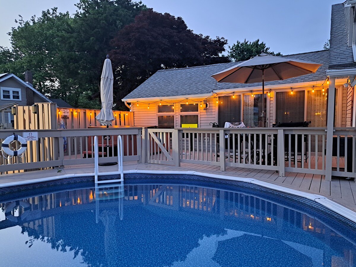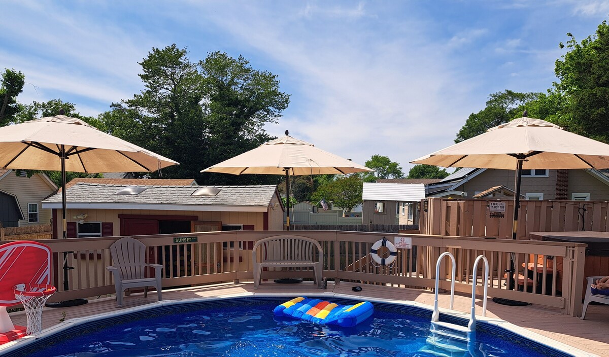 Now accepting Summer 2026 bookings! Welcome to Driftwood Cottage & Club, your family-friendly, dog-friendly Delaware Bay getaway. Cottage in the front, Club in the back. This original 1943 Villas Cottage has been tastefully updated and added to while still keeping its Vintage Charm. Screened-in front porch, hot tub, pool, firepit, yard games, kayaks, and bonus pool house. Linens, towels, dish soap, laundry detergent, dishwasher detergent, and paper products are provided.... literally you'll just need to pack your personal toiletries, swimsuit, and sunscreen! Located a block and a half from the sand, 15 mins to Cape May and Wildwood beaches. Please check out a virtual Driftwood walk-through posted on our YouTube channel! Head to YouTube and go to @DriftwoodCottageNJ and choose the Property Tour clip! The space: Driftwood Cottage is a 4 bedroom, 2.5 bath beach house, capable of accommodating up to 14 guests and 2 dogs. Linens and towels are provided. The main cottage contains 3 bedrooms and 1.5 bathrooms: - The Primary (up to 3 guests plus pack & play) holds a King-sized bed with a Stearns and Foster mattress and a super-comfy twin in case any younger guests need to stay with mom and dad. Pack & Play located in the bedroom closet - please bring your own pack & play sheets. (Roku and DVD-capable TV) - A second family bedroom (up to 4 guests) with a twin over full bunk bed and separate twin sized bed, and vintage reading nook bench. - A third bedroom with twin and trundle (up to 2 guests). - Living room has sleeper sofa and can easily convert into a cozy sleep for 2 guests. The bonus Pool House Suite is home to your second King Bed with a twin-over-full bunk bed, mini-fridge, microwave, high-top table with 4 stools, Roku-equipped TV, Game1Up Arcade with Asteroids (plus 7 other Atari games), and full bath. The expansive sunroom houses a gas fireplace (seasonally available), leather furniture, egg chair, dining area, high-top table with 4 stools, and Roku equipped TV. Screened-in front porch with seating for 4 to enjoy your morning coffee or evening cocktail. House amenities included are: - A fully-equipped kitchen including Keurig coffee maker, 4 slice toaster, nonstick cookware set, knife drawer, crockpot, electric skillet, pool-friendly plates and cups, plenty of items to serve 14. - Xfinity WiFi with capacity for your devices - Pool with surrounding decking for lounging (maintained weekly by professional pool service) - 6 person lounger hot tub (maintained weekly by professional pool service) - Oversized outdoor shower - New propane gas fire-pit - 6 new Adirondack chairs - Oversized hammock with pillow - 2 bikes, 6 beach chairs, 2 body boards, beach cart with beach toys, and beach umbrella. - A new regulation-sized Backyard Hero cornhole set, giant Connect4, kid-friendly axe-throwing (ages 8+), and a water table for the littles for safe water play! - Board games, coloring books, crayons, and puzzles for the entire family. - 2 Kayaks and life jackets. - Propane BBQ grill. - Plenty of indoor/outdoor dining and lounging spaces throughout the property What to expect when you stay here: - Enjoy the bay only 1.5 blocks from the house for a taste of the bay beach scene. The bay is a wonderful place for exploring and discovering, with a world of wildlife and marine life. You'll see plenty of horseshoe crabs, gulls, pipers, and if you're lucky you might even spot a pod of dolphins off the shore. - Visit the Cape May beaches with the 12 included beach passes. A tour through Cape May, encompasses world class restaurants, wineries, breweries, theaters, nature preserves, and other attractions. - You can stay local and enjoy the Driftwood Club, take a dip in the pool, barbecue, unwind in the hot tub and finish off with a nightcap around the propane gas fire-pit or take the 4 minute stroll to the local bay beach to watch one of our famous Delaware Bay sunsets. - Travel 5 minutes south to North Cape May and visit the Cape May ferry terminal for a ferry ride or eat at On The Rocks Dockside Grill with outdoor dining. While in North Cape May you can visit the Cape May winery, one of the area's finest. - We are located a 12 minute drive to downtown Cape May, and a 12 minute drive to the beaches and boardwalk in Wildwood. Don't forget to visit the Cape May Zoo, one of Trip advisors top US zoos with no admission fees. This is a dog-friendly home! **Dogs must be house-trained and non-aggressive with no bite history whatsoever.** Be sure to visit the immense Wildwood dog park and the dog friendly beaches there as well. We accept up to 2 dogs and provide kennels for when you are out and the dogs are left alone in the house. Crates are in the front entry hall closet. Dog fee is $50 per dog/per stay. Sunday - Sunday weekly rentals in peak summer season! Please ensure you are clicking on a Sunday to Sunday for weekly rates. ;) Guest access: You can enjoy the entire property; home, sunroom, pool, hot tub, pool house suite, fully-fenced in yard for the kids and dogs! It's going to be your little slice of paradise. Other things to note: We really hope you enjoy this Vintage Villas cottage and unique property as much as we do! Please message with any questions about availability for the pool and/or the sunroom's gas fireplace. We will try our best to accommodate requests for pool/fireplace availability during your stay. Our prices include all fees. No hidden fees.