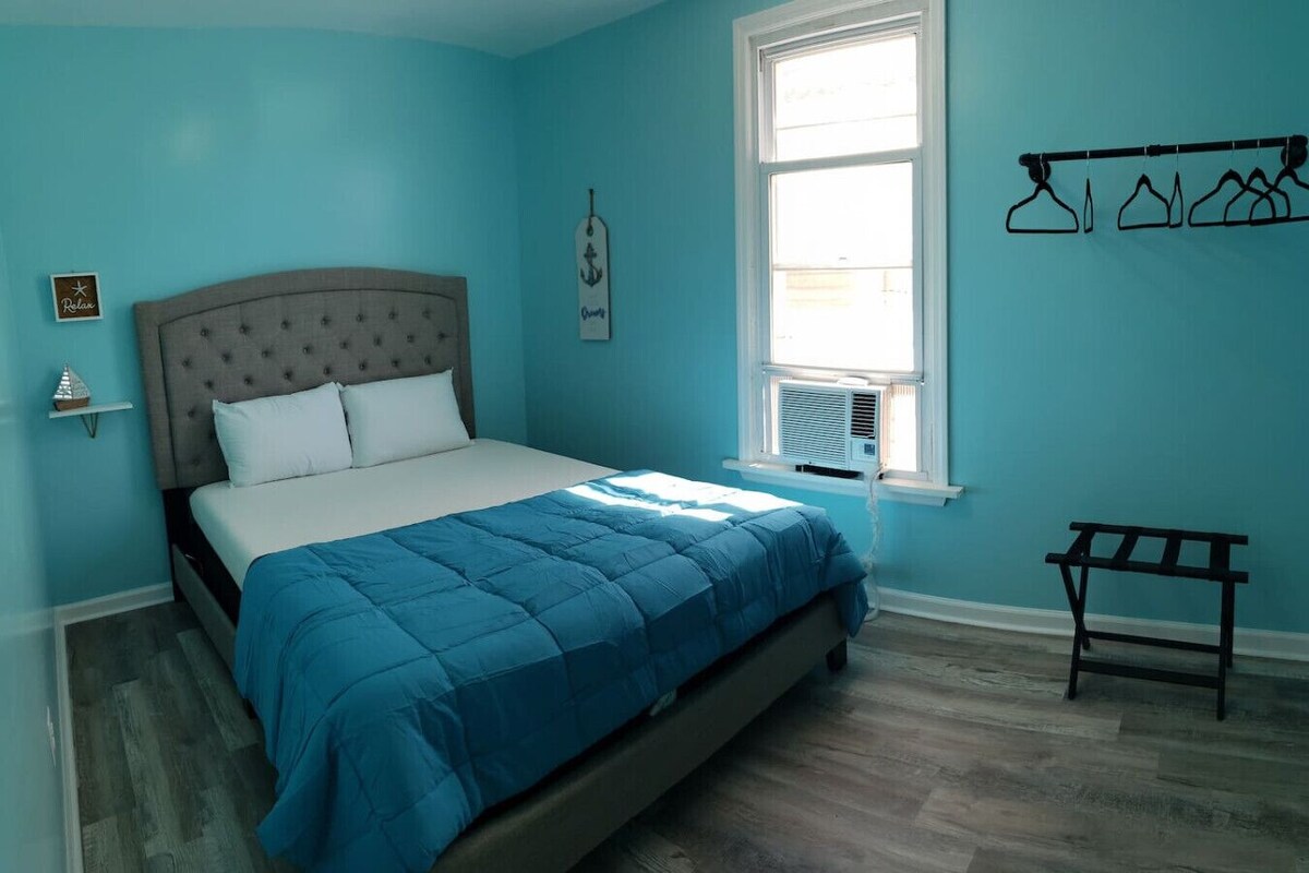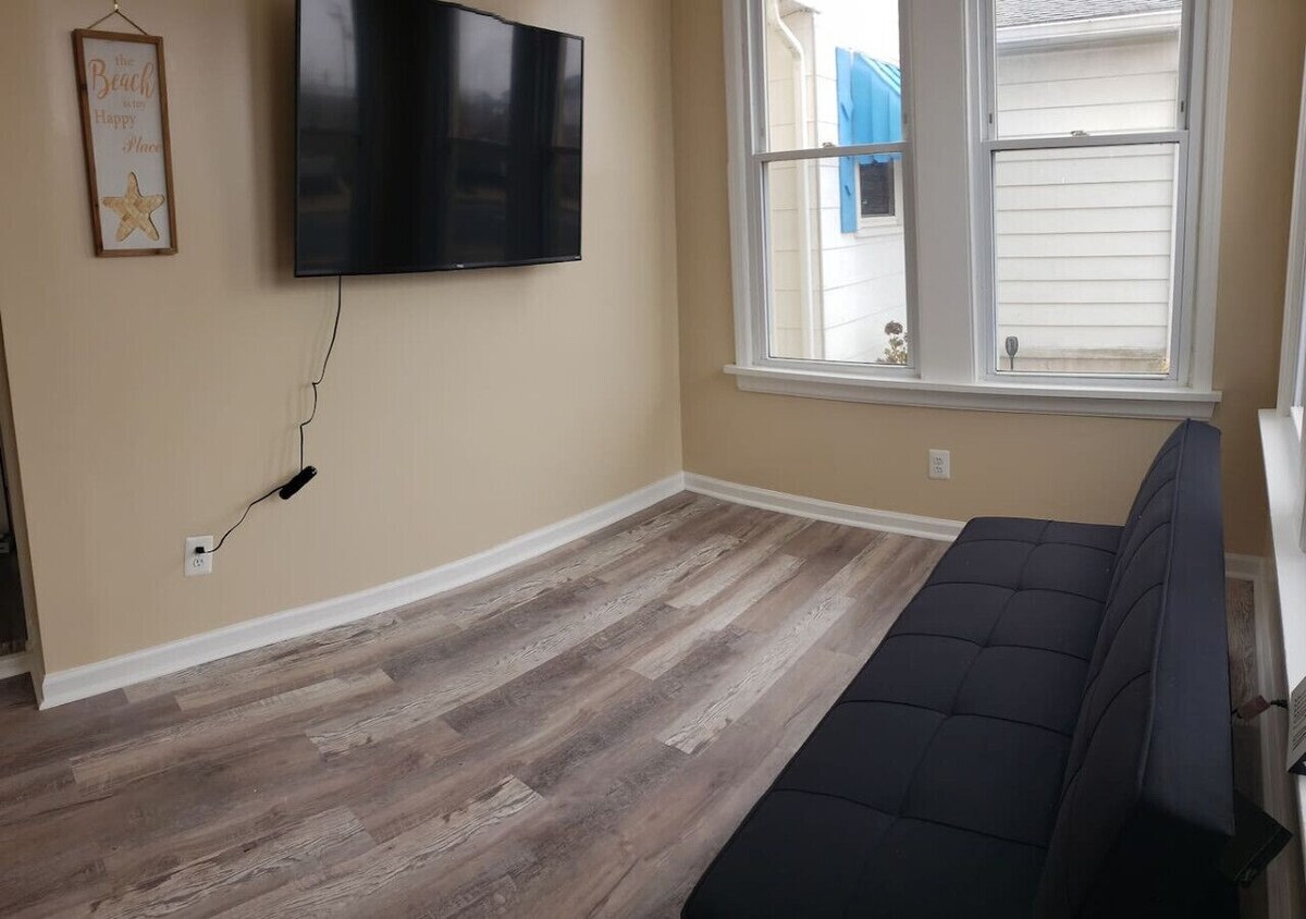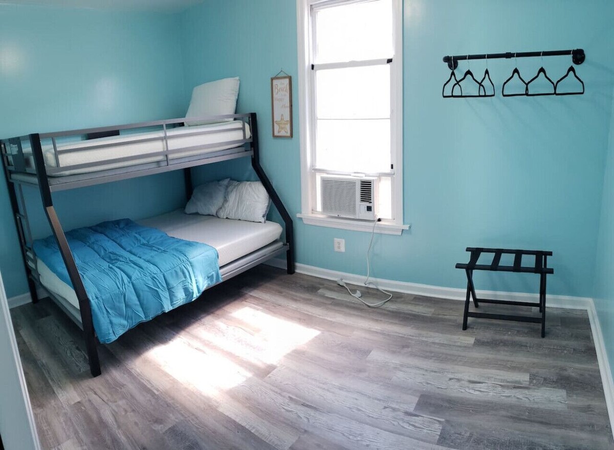 Situated a mere 7 minute walk away from the bustling Wildwood Boardwalk & Beach, this 2 bedroom, 1st Floor gem promises effortless access to the city`s finest dining and bars. Explore picturesque nature preserves, sandy beaches, the historic Cape May Lighthouse, and educational museums all within a 20-minute drive away. On the inside, you`ll be greeted by a spacious 700 sq. foot space, boasting a large HDTV, a fully equipped kitchen, and backyard BBQ with access to a grill. Off-street parking. Get ready to explore the beautiful coastal landscapes out here on the south-eastern shores of New Jersey’s lively resort city, with TMU National Wildlife Refuge and Wildwood Dog Park & Beach being under a 10 minute drive away. A delightful setting for friends and families, guests who stay here will enjoy a world of endless entertainment owing to the wealth of attractions, thrill rides, waterparks, and shopping opportunities located just a stone’s throw away. Upon entering the home, you will be greeted with newly renovated apartment. Indulge in a movie marathon on our large HDTV, with the ability to log into your favorite streaming services. Getting hungry? Satisfy your culinary cravings in the kitchen, a lovely space with all the tools you need to bring your culinary visions to life. Full suite of appliances – every aspect of this kitchen has been designed to make your cooking experience effortless and enjoyable. Get your creative juices flowing using our: Full size refrigerator Microwave, oven and stove Pots and pans Oil, salt, pepper and spices Plates, bowls, mugs, glasses, and silverware Cutting board, cooking spoons and knives Should you decide to dine out, have peace of mind that a slew of seafood restaurants and international cuisines are a short walking distance from the property. Choose from Mexican, Polish, Italian, and many more! Ready to hit the hay? Then get ready to sleep on cloud 9! Whether you need to take a short nap or retire for the night, restful sleep will find you in our comfy bedroom. A total of 5 guests can fall asleep comfortably here, and feature: 1 Queen mattress 1 Bunk bed with a twin over full mattress Living room futon 1 full bathroom with a standup shower, toilet paper, towels, and a sink vanity to store your bathroom essentials. walk or drive, easy access to all Keep reading to learn more about our extra benefits and start planning your trip to Wildwood, NJ today! ✓ Covid-19 Compliant: Health, safety, and wellbeing of our guests are of utmost importance. Therefore, expect a thorough and sparkling clean before you check in. ✓ Pets Allowed: We extend a warm welcome to your furry companion to embark on your next journey here at no extra cost! Please message the host beforehand and notify which type of pet and how many you plan to bring. ✓ Work from Home: Stay connected on our complimentary high speed internet of up to 1000 Mbps, capable of streaming video conferencing calls or downloading big documents. ✓ Safety: Have peace of mind during your stay with our emphasis on safety. The house is equipped with fire extinguishers, smoke detectors, carbon monoxide detectors, and security cameras to ensure your well-being and protection. Other Things to Note: No smoking or vaping at all times Minimum age to book is 27 years old Top Rated Attractions *Historical Attractions* Cape May Lighthouse Nestled in the charming coastal town of Cape May, New Jersey, sits a beacon of history and beauty – the Cape May Lighthouse. Standing tall at 157 feet, this lighthouse has stood the test of time and has been shining its guiding light for over 160 years. The lighthouse is one of the oldest in the country, and is still in operation, illuminating the way for sailors and beckoning all to come and explore. Climb the 199 steps to the top of this magnificent tower, and you will be rewarded with breathtaking panoramic views of the Atlantic Ocean and the surrounding landscapes. This lighthouse is a true gem, listed on the National Register of Historic Places and beloved by locals and tourists alike. Come and experience the magic of the Cape May Lighthouse, where history and beauty converge, creating a truly alluring and unforgettable experience! Doo Wop Experience Museum Step back in time and experience the vibrant, futuristic world of Doo Wop architecture at the Doo Wop Experience Museum in Wildwood, New Jersey. This museum is a celebration of a unique moment in design history, showcasing the colorful, space-age vision of the mid-century architects and builders who transformed Wildwood`s beachfront into a wonderland of atomic-age style. From vintage photographs to interactive displays and multimedia exhibits, every aspect of this museum is designed to transport you to another time and place, when steel, glass, and neon were the building blocks of a bold new vision for the future. History buffs and aviation aficionado’s should also pay a visit to the Naval Air Station Wildwood Aviation Museum and Harriet Tubman Museum. *Outdoor Recreation* Dolphin and Whale Tour Step aboard Thunder Cat Dolphin Watch & Speedboat Tours for a unique adventure unlike any other. Get ready for a thrilling encounter with the wonders of the sea, where you will have the opportunity to witness the playful antics of pods of dolphins, glide alongside graceful stingrays, and perhaps even catch a glimpse of magnificent whales! This is a chance to connect with nature and create memories that will last a lifetime. Cape May National Wildlife Refuge Plan a visit to the wild heart of New Jersey at Cape May National Wildlife Refuge, a stunning landscape of salt marshes, tidal creeks, forests, and fields that is home to an incredible array of wildlife. From the graceful flight of migratory birds to the gentle shuffle of endangered species like the piping plover and Atlantic loggerhead turtle, this 10,000-acre refuge is a true treasure trove of natural beauty. Locations and Distances (all distances are approximate) Super