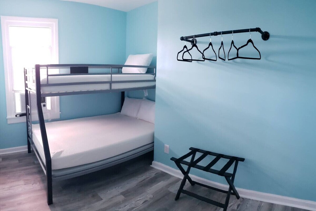 Large duplex (two floor) apartment with 6 bedrooms (3) with queen size beds and (3) with twin over full bunks. Gala style kitchen, 7.1 cubic foot refrigerator (not a mini-fridge), large dining room, and living room. Two full baths (one on each floor). 2 blocks to beach and boardwalk 1 block to Pacific Ave shops and restaurants. Cookware, utensils, BBQ, pillows, bedsheets, bath towels provided. Get ready to explore the beautiful coastal landscapes out here on the south-eastern shores of New Jersey’s lively resort city, with TMU National Wildlife Refuge and Wildwood Dog Park & Beach being under a 10 minute drive away. A delightful setting for friends and families, guests who stay here will enjoy a world of endless entertainment owing to the wealth of attractions, thrill rides, waterparks, and shopping opportunities located just a stone’s throw away. Upon entering the home, you will be greeted with newly renovated apartment. Indulge in a movie marathon on our large HDTV, with the ability to log into your favorite streaming services. Getting hungry? Satisfy your culinary cravings in the kitchen, a lovely space with all the tools you need to bring your culinary visions to life. Full suite of appliances – every aspect of this kitchen has been designed to make your cooking experience effortless and enjoyable. Get your creative juices flowing using our: Full size refrigerator Microwave, oven and stove Pots and pans Oil, salt, pepper and spices Plates, bowls, mugs, glasses, and silverware Cutting board, cooking spoons and knives Should you decide to dine out, have peace of mind that a slew of seafood restaurants and international cuisines are a short walking distance from the property. Choose from Mexican, Polish, Italian, and many more! Ready to hit the hay? Then get ready to sleep on cloud 9! Whether you need to take a short nap or retire for the night, restful sleep will find you in our comfy bedroom. A total of 15 guests can fall asleep comfortably here, and feature: 3 Queen mattress 3 Bunk bed with a twin over full mattress Living room futon 2 full bathroom with a standup shower, toilet paper, towels, and a sink vanity to store your bathroom essentials. Keep reading to learn more about our extra benefits and start planning your trip to Wildwood, NJ today! ✓ Covid-19 Compliant: Health, safety, and wellbeing of our guests are of utmost importance. Therefore, expect a thorough and sparkling clean before you check in. ✓ Pets Allowed: We extend a warm welcome to your furry companion to embark on your next journey here at no extra cost! Please message the host beforehand and notify which type of pet and how many you plan to bring. ✓ Work from Home: Stay connected on our complimentary high speed internet of up to 1000 Mbps, capable of streaming video conferencing calls or downloading big documents. ✓ Safety: Have peace of mind during your stay with our emphasis on safety. The house is equipped with fire extinguishers, smoke detectors, carbon monoxide detectors, and security cameras to ensure your well-being and protection. Other Things to Note: No smoking or vaping at all times Minimum age to book is 27 years old Top Rated Attractions *Historical Attractions* Cape May Lighthouse Nestled in the charming coastal town of Cape May, New Jersey, sits a beacon of history and beauty – the Cape May Lighthouse. Standing tall at 157 feet, this lighthouse has stood the test of time and has been shining its guiding light for over 160 years. The lighthouse is one of the oldest in the country, and is still in operation, illuminating the way for sailors and beckoning all to come and explore. Climb the 199 steps to the top of this magnificent tower, and you will be rewarded with breathtaking panoramic views of the Atlantic Ocean and the surrounding landscapes. This lighthouse is a true gem, listed on the National Register of Historic Places and beloved by locals and tourists alike. Come and experience the magic of the Cape May Lighthouse, where history and beauty converge, creating a truly alluring and unforgettable experience! Doo Wop Experience Museum Step back in time and experience the vibrant, futuristic world of Doo Wop architecture at the Doo Wop Experience Museum in Wildwood, New Jersey. This museum is a celebration of a unique moment in design history, showcasing the colorful, space-age vision of the mid-century architects and builders who transformed Wildwood`s beachfront into a wonderland of atomic-age style. From vintage photographs to interactive displays and multimedia exhibits, every aspect of this museum is designed to transport you to another time and place, when steel, glass, and neon were the building blocks of a bold new vision for the future. History buffs and aviation aficionado’s should also pay a visit to the Naval Air Station Wildwood Aviation Museum and Harriet Tubman Museum. *Outdoor Recreation* Dolphin and Whale Tour Step aboard Thunder Cat Dolphin Watch & Speedboat Tours for a unique adventure unlike any other. Get ready for a thrilling encounter with the wonders of the sea, where you will have the opportunity to witness the playful antics of pods of dolphins, glide alongside graceful stingrays, and perhaps even catch a glimpse of magnificent whales! This is a chance to connect with nature and create memories that will last a lifetime. Cape May National Wildlife Refuge Plan a visit to the wild heart of New Jersey at Cape May National Wildlife Refuge, a stunning landscape of salt marshes, tidal creeks, forests, and fields that is home to an incredible array of wildlife. From the graceful flight of migratory birds to the gentle shuffle of endangered species like the piping plover and Atlantic loggerhead turtle, this 10,000-acre refuge is a true treasure trove of natural beauty. Locations and Distances (all distances are approximate) Supermarkets and Shopping: Europa Delights (0.4 miles) 2-minute drive Boardwalk Mall (0.4 miles) 2-minute drive Bill`s Corner Deli (0.8 mile