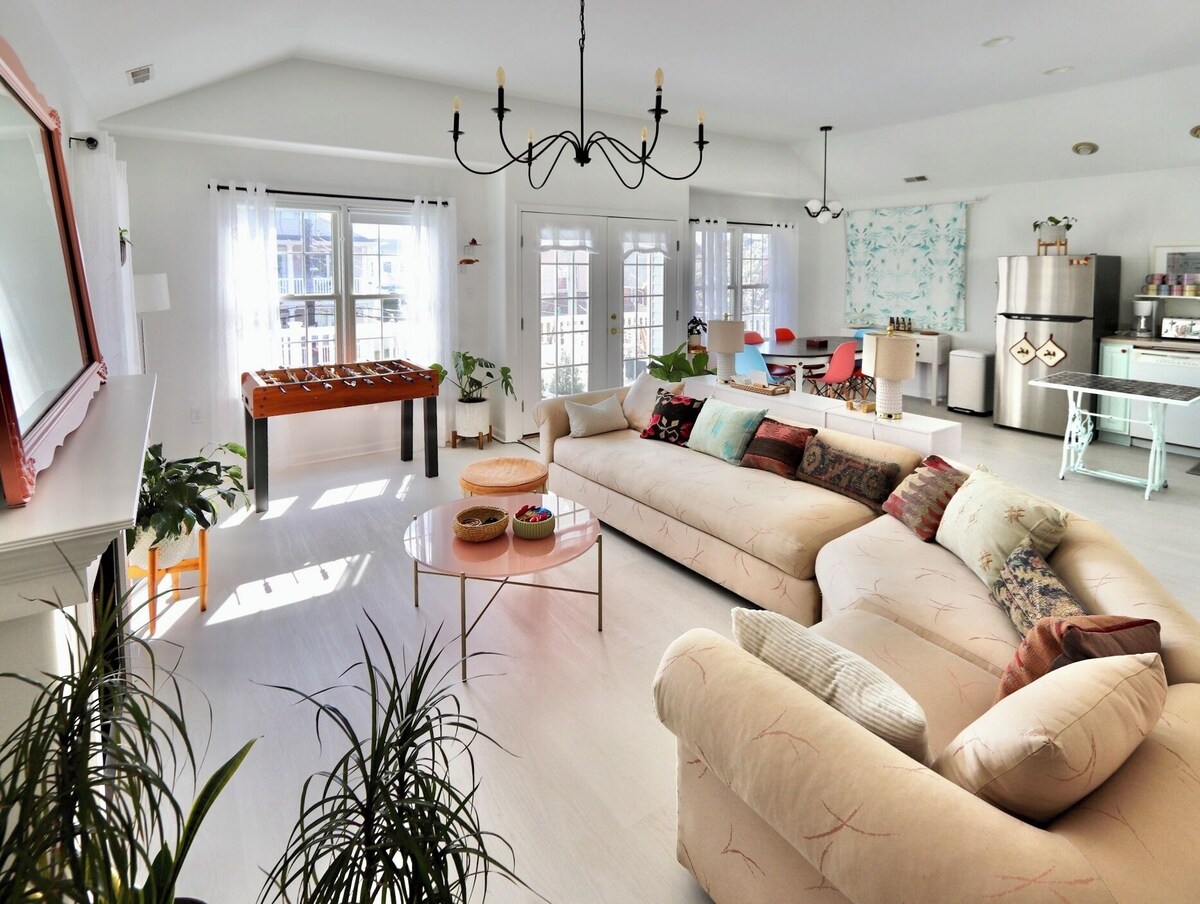 A little bougie, a lot beachy—this home blends easy comfort with playful design that’s more coastal aunt than coastal grandma. Fall in love with BOUGIE BEACH BUMS: -Spacious—no bunk beds, big deck, real room to relax -Elevated yet totally inviting design -Luxe touches like a Roche Bobois sofa + rainhead showers -Linens + beach gear included -Just 14 houses from the sand -Walk: 5 min to Byrne Plaza, 8 to Splash Zone, 20 to Convention Center -Drive: 15 min to Cape May / Stone Harbor Kick off your sandals and make yourself at home in this breezy, 1,360 sqft beach house. The spacious primary suite comes with a king bed and the luxury of a private ensuite. Two additional bedrooms—one queen and two twins—offer the perfect setup for families, friends, or multi-generational groups. A second full bathroom and outdoor shower mean there’s plenty of room for everyone to rinse off after a day in the sand. 🍑 HIGHLIGHTS ● Three airy bedrooms: 1 King, 1 Queen, 2 Twins ● 2 full bathrooms (including a private ensuite) ● Outdoor shower for sandy toes ● 2 Smart TVs (living room & primary bedroom) ● Bed, bath, and beach linens provided for a stress-free stay ● 6 beach chairs included for your coastal adventures ● Foosball table for endless family fun ● A spacious and well-equipped kitchen that’s stocked with basic sundries ● Onsite washer and dryer for your convenience 🍑 WHAT MAKES US BOUGIE ● The best fireworks views: Enjoy Friday night fireworks from your oversized private deck—boardwalk crowds optional! ● Steps to the sand: Stroll down a quiet, residential street for instant beach access. We’re just 14 houses from the beach with no motels or businesses on your way. ● We, your hosts, live locally. We do not use a third party property manager but look after our guests ourselves with the support of a professional cleaning crew. 🍑 PRIME LOCATION ● Walk to Starbucks, Mack’s Pizza (or Sam’s—your call!), local favorite Taqueria El Azteca, and the brand new Johnny Longhots. ● Our central location is your ideal base for Wildwood’s robust calendar of festivals and events. ● Cape May and Stone Harbor are just 15 minutes away. Book now and make this your favorite summer tradition! Our prices include all fees. No hidden fees.