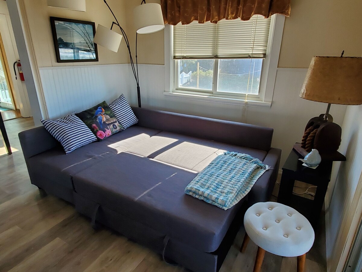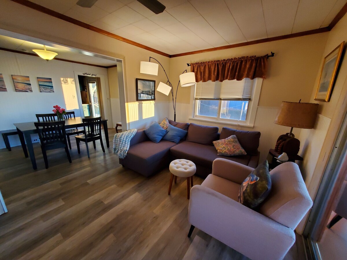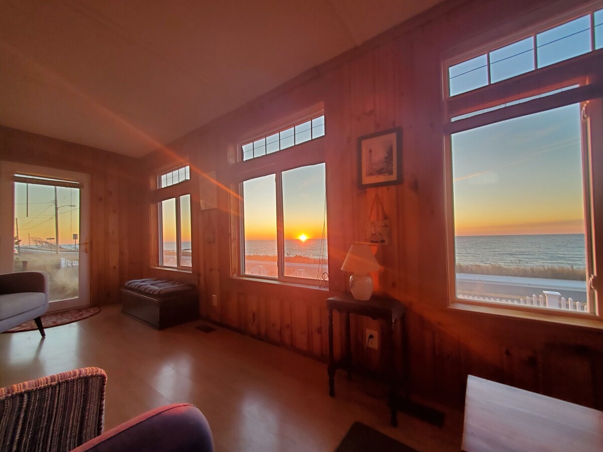 Beach front cottage located directly on Shore Road in historic Townbank offers such a perfect beach stay you will want to return year after year! Whether you are looking for a family vacation, couple's retreat or simply to reconnect with a group of friends, this property is equipped and located to provide wonderful memories that will last your lifetime. This is a two bedroom, one full bath home, which comfortably sleeps six with an amazing view above the dunes from the sun room for daily dolphin and sunset watching. Townbank is affectionately known as “Sunset Beach” and offers spectacular sunset viewing every night. People come from all around just to watch the grand colors provided nightly as the sun sinks slowly into the horizon over the water. Staying here ensures you the premium, unobstructed view of this daily event from both inside the home or the fenced in yard at no additional cost! The home does offer central air conditioning, however guests equally enjoy opening the many windows to fully experience the ocean breeze, peaceful lapping waves and sea gulls beckoning you to enjoy your day on the quiet, non-crowded beach which awaits just outside your door. This area is perfect for strolling about on the beach (no beach tags required!) or biking along the safe shore road that runs directly in front of the cottage. The Cape May-Lewis Ferry is just about one mile down the road. If you want to hit the boardwalk at night, Cape May is 10 minutes by car and Wildwood is just as close. Nearby there are wineries, shops, galleries and gourmet restaurants. Harpoons on The Bay, a beach front restaurant and bar, is just a few blocks walk down the road and a great place to dine if you aren't in the mood to cook! You can have a few drinks and simply walk home; no need to worry about driving! A quick trip to the market is only a few minutes by car. Major highways are accessible just outside of town, yet traffic is not a problem while staying in Townbank. The “small town feel” is comforting while strolling or biking throughout the town. The house is comfortably furnished for your enjoyment and offers updated kitchen appliances, two bedrooms plus additional sleeping in pull-out sofa beds. The eat in dining room for six is beautifully furnished and is next to the living room where you can relax watching cable television, reading or chatting. The grand sun room offers additional dining while overlooking the water, or just a place to hang-out and watch the dolphins or sunsets. The cottage sits in a large, white picket fenced in yard and offers plenty of space for outdoor fun. Our property actually consists of four lots, but we only have two cottages on it, leaving ample yard space. Beach access is simply through the gate,down the short, gently sloping dune and you are on our quiet, peaceful, non-crowded beach. It's easy to go back and forth from your “beach camp” to access a snack, drink or the bathroom as you enjoy the tranquil setting of what seems to be a private beach. Booking your vacation couldn't be simpler! Check our calendar for availability and rate that are extremely reasonable for beach front property. Home Amenities: * Central air and ceiling fans * The kitchen is equipped with gas stove/oven, refrigerator/freezer with ice maker, toaster oven, microwave, general cleaning supplies and all dishes, glasses, pots and pans, utensils you will need. * The living room offers a large TV with cable and DVD player, WiFi and many wonderful books to peruse during your stay. There is a sectional sleep sofa with all linens stored neatly within. * Bedrooms offer comforters, and pillows with one queen bed and two twin beds. * The bathroom has a tub and a brightly lit vanity area however, you will need to provide your own bath towels and sheets and pillow cases. * We provide a couple of beach chairs and offer outdoor seating and eating for your enjoyments. Just bring beach towels and you are ready to hit the sand and water! * There are no laundry facilities on the premises, There is a clean, lovely laundromat within a five minute car ride. * The most amazing amenity we offer is the world class SUNSET and dolphin watching from the privacy of your beach front sun room! It just can't be beat! Our prices include all fees. No hidden fees.