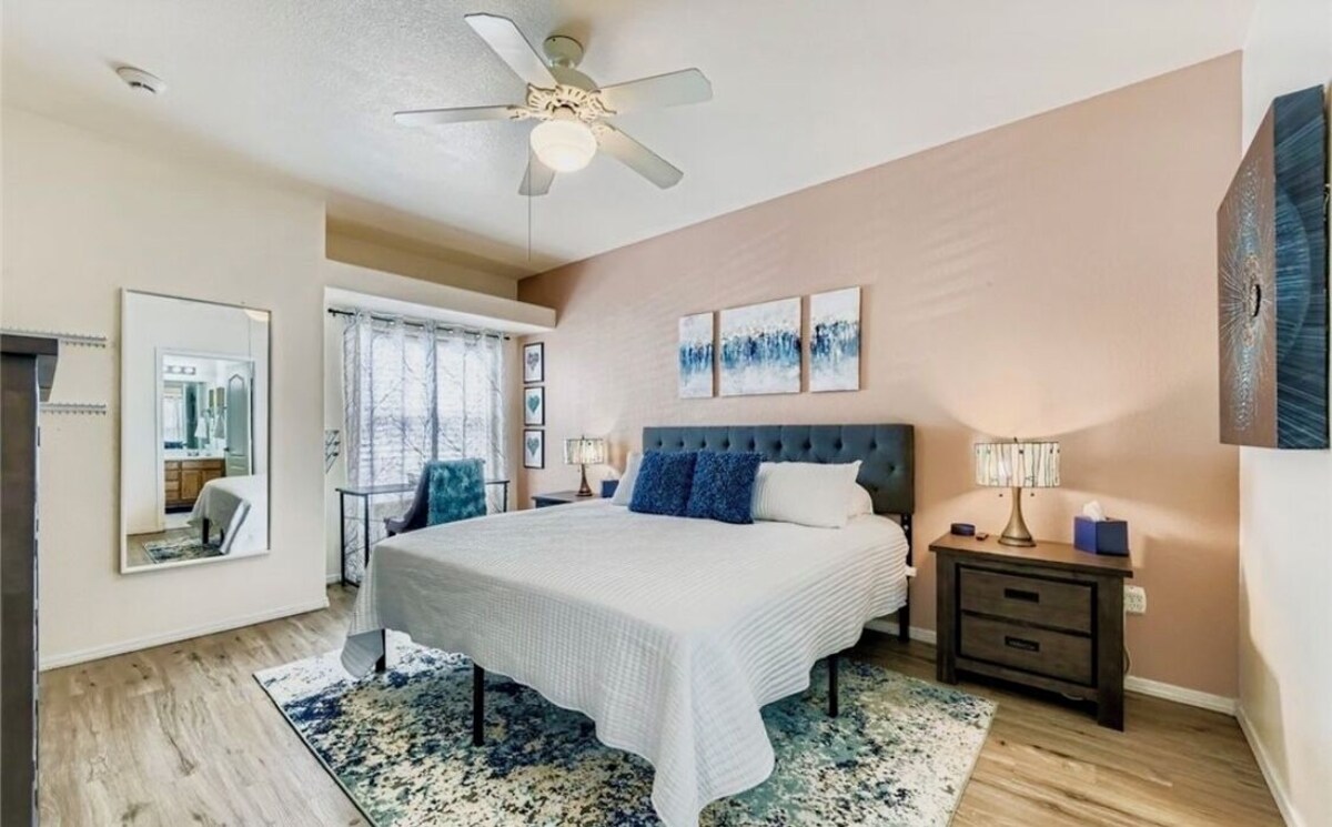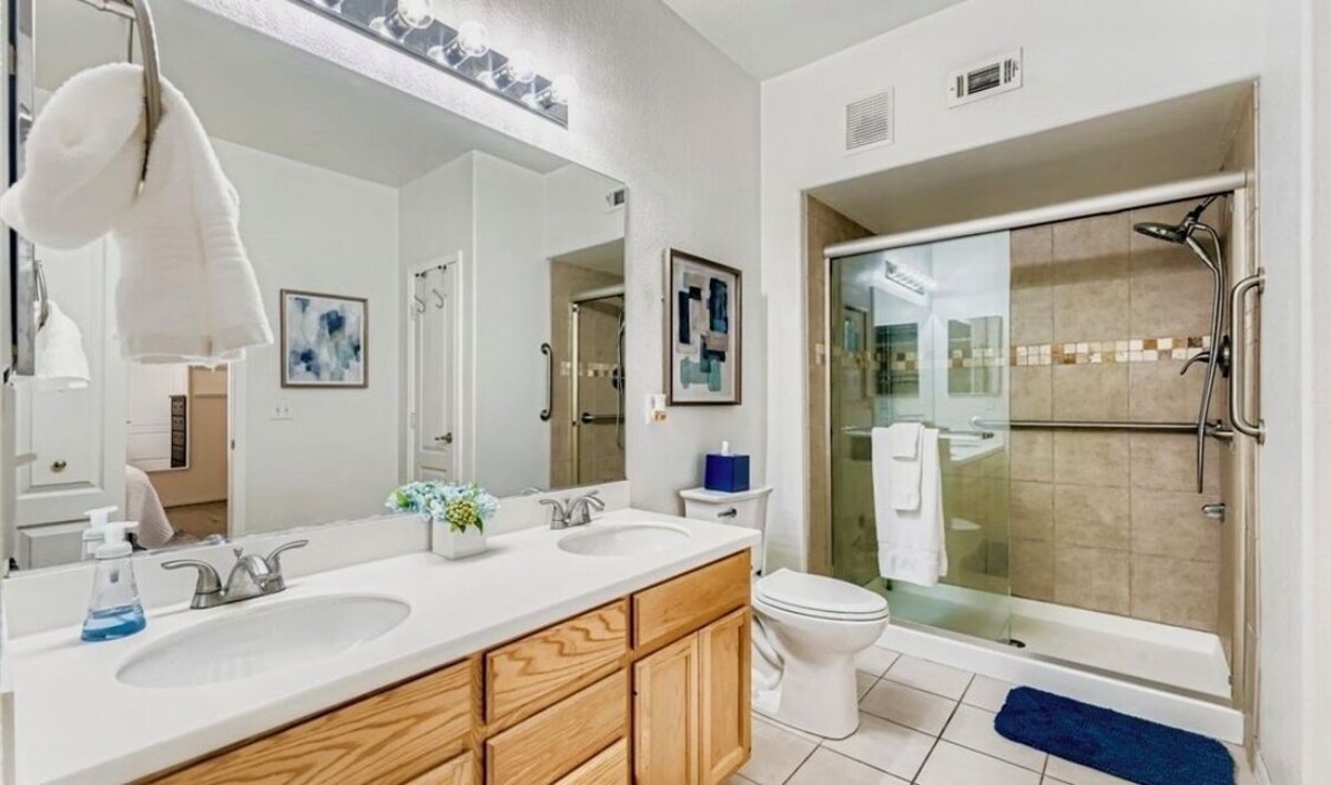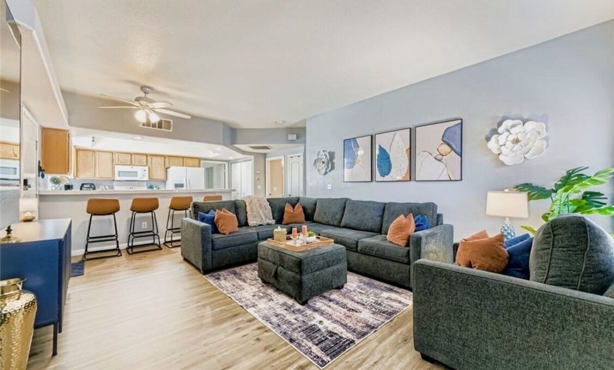 This Las Vegas condo boasts 2 inviting bedrooms, featuring 1 king bed and 1 queen bed. The first bathroom is equipped with a hair dryer, bathtub, and shower for your convenience. The master bathroom has a nice size shower. The kitchen has everything you need too. All you need is your clothes and some groceries! The unit has many amenities like 2 pools, newer central AC and a fitness room, 4 guests can enjoy a fantastic stay in this superb property. It’s also a gated and security patrolled complex. You get 2 parking spots one in the garage and one outside the garage. Some guest parking is available for a night. A great place to call homebase while you're away, we hope you enjoy your stay. Our prices include all fees. No hidden fees.
