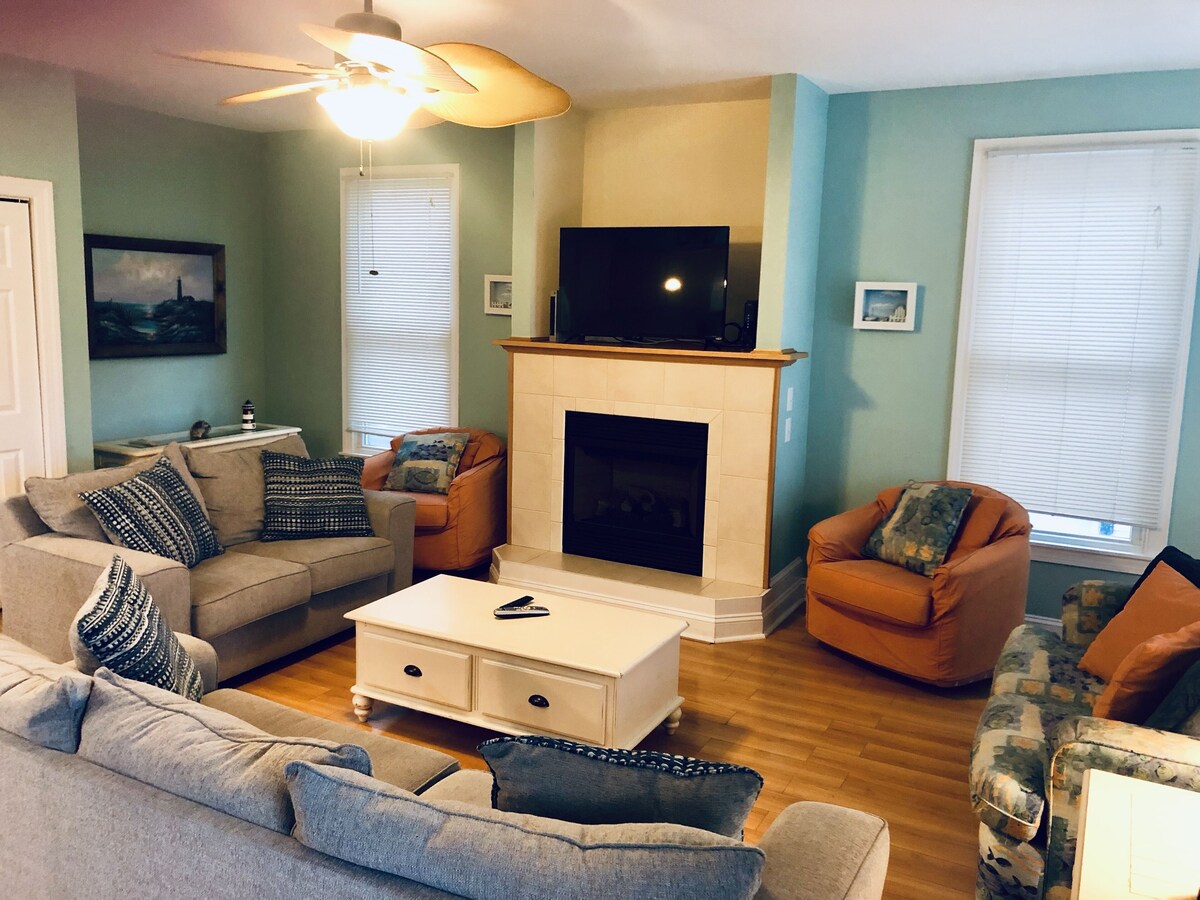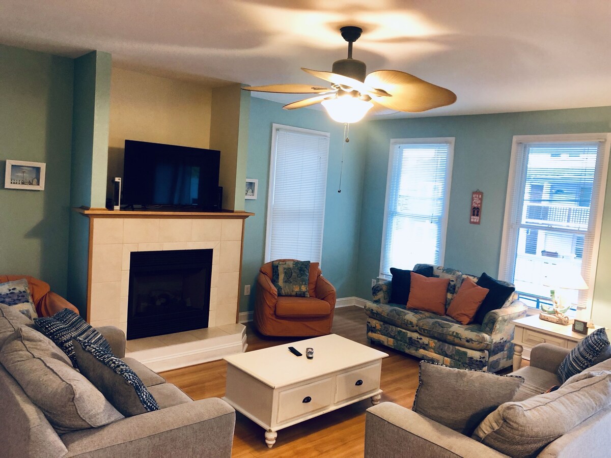 Bring the WHOLE family (2 & 4-legged) to enjoy our condo affectionately known as the \ . Bright and roomy beachy decor with all hard wood floors. The whole building has 4 units. Garages & storage rooms on ground level. Two units on the \ (above garages) and 2 units on the \ . Ours is the right side of 1st floor with year round resident owners above us on the 3rd floor. Coral master bedroom has queen bed, ceiling fan and attached bath with shower. Kitchen has island with 2 chairs. Blue corner room has queen bed and ceiling fan. Yellow room has Pyramid bunk (single upper & double lower) and a single trundle bed. Trundle is always out since the mattress is too thick to fit under the bunk! Hall bathroom has tub/shower combo. Washer & Dryer in hallway. Large private balcony. I need to update the picture! We have a high top table with 4 tall comfy swivel chairs plus the larger table shown in the picture. Attached garage parking for 1 car and driveway parking for 1 car. 4 adult cruiser bikes, 1 adult mountain bike, 1 adult tricycle, beach chairs, beach cart & some random beach toys for your use. Check in is 3:00 PM Check out is 11 AM. We try to be flexible, but it depends on bookings before & after you. Unfortunately we rarely have any play with the check in or out times during peak summer season. Please describe your traveling group when inquiring about our Hizzle. High school & college students - we're so glad you're GRADUATING! But sorry, we don't EVER rent to senior week groups. Our prices include all fees. No hidden fees.