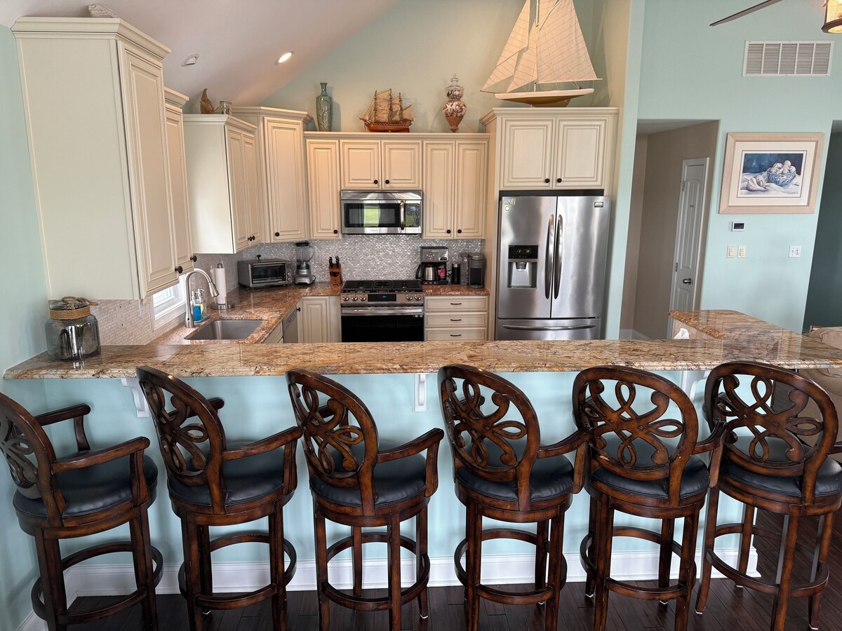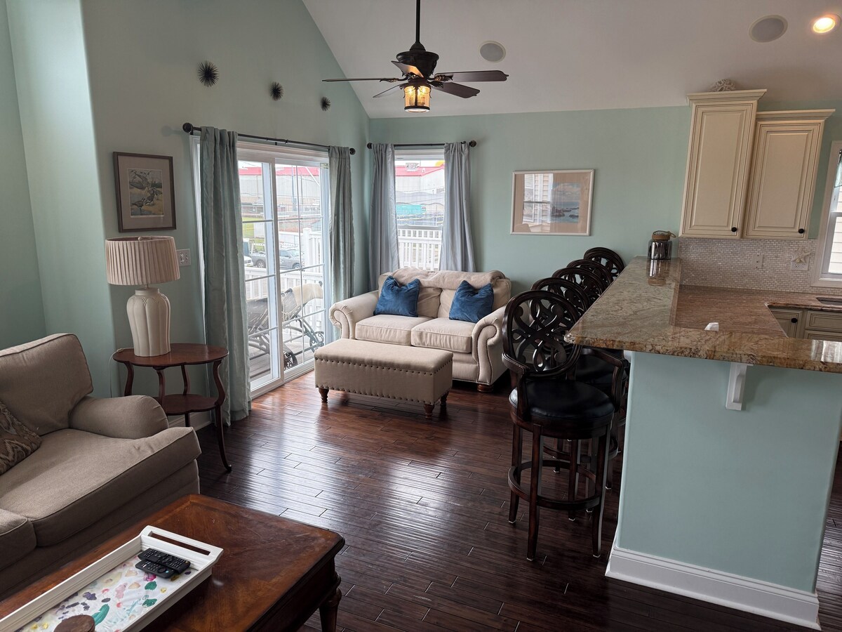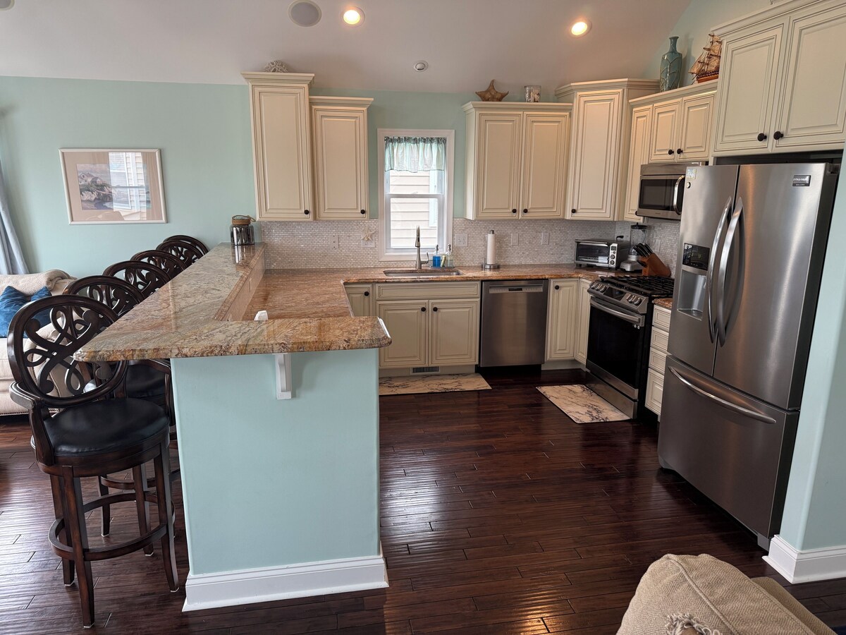 This is a single family home with fully fenced, pavered, and landscaped backyard. During the summer we rent Saturday to Saturday. Please use those ranges to check availability). This 4 bedroom sleeps 8 people. It is a top down shore house (kitchen is upstairs), with a vaulted open kitchen / family room. There is an upstairs deck with 2 lounge chairs, 2 chairs, umbrella and a gas grill accessible from the family room (and you can see the Morey's Piers fireworks from this deck each Friday at 10 PM starting July 4th till Labor Day). The kitchen is fully stock. It has a coffee maker with attach hot water system (We leave a pack of coffee filters) and there is Keurig machine. There is a dishwasher, over the range microwave, Oven with gas cook top and a refrigerator with ice and water dispenser. The kitchen is fully stocked with pots and pans etc. There is bar stool seating at the kitchen island with 6 bar stools. The upstairs family room has 1 sofa and 2 love seats. There is a 4K flat screen TV with surround sound. There is a full bathroom upstairs with a tub. The master bedroom contains a walk in closet and a full private bathroom with a shower. The bed is a king sized 4 poster Tommy Bahama bed with a high end mattress. There is a flat screen TV mounted on the wall. The other upstairs bedroom has 2 bunk beds (full size) with memory foam mattresses. It contains a small seating / play area for the kids and a desk. Downstairs you will find another TV room and 2 bedrooms (Queen Bed in one and a Bunk Bed (full size) in the other). Both bedrooms have doors to the back deck and fenced in back yard. There is a full bathroom with tub. There is also a laundry with a washer and dryer, small ironing board and iron. The back yard has several chairs on the back deck, 2 lounge chairs, a huge umbrella for shade, a grill, and an outdoor dinning table with 6 chairs. There is also an outdoor shower to wash off the sand from the beach. The back yard is pavered. There is a driveway and free on street parking. The beach is 5 blocks away. Convention center is 8 blocks away. Both within walking distance. Our prices include all fees. No hidden fees.
