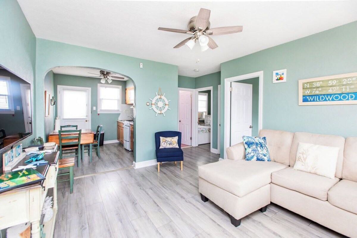 Summary: Kiwi's Cottage is one of three Villas D’Amico family-owned apartments just one and a half blocks from the beach near Wildwood Crest. We are part of the Turtle Getaways collection of premier vacation properties. The Space: Kiwi's Cottage has two bedrooms and one full bath, dining area, a full kitchen, living room, WIFI, A/C, and heat. There is an outside private porch perfect to enjoy coffee in the morning and the cool breezes of summer evenings. There is a washer/dryer in a common area for guest to use during their stay. We are ideally located: 1.5 blocks from the beach and boardwalk, 3 blocks from the convention center, and a block to Duffer's and Marvis's Diner. The outside area has plenty of room for outdoor fun and dining complete with a gas grill and outdoor seating. Kiwi's Cottage can be rented together with Darcy's Beach House and PG's Bungalow for a shared vacation experience with friends and family. Your reservation includes linens, towels, beach towels, beach chairs, beach cart and an umbrella. We have a dedicated driveway for check in and check out. Street parking is free using the provided parking permit, one permit per apartment. Kiwi's Cottage is Pet friendly; please check our house rules for details. Guest Access: Guests will be provided with a unique door code prior to check-in. A parking permit will be available at check-in. In addition, the property manager, Denise, greets all our guests to acquaint them with the property. The Neighborhood: Family friendly residential neighborhood with direct access to beach and boardwalk, one and a half blocks from the beach at Wildwood Crest. Getting Around: Kiwi's Cottage is in walking distance to restaurants, amusements rides on the boardwalk, and to the beach. We are a short drive to Cape May and other shore communities. Other Things to Note: Note, if you have any sensitivity to pet allergens please be aware that pets are regularly present in this home. There is a $50 per pet per stay fee. If you have more than one pet a separate invoice will be issued. Note: The reservation fee collected at the time of booking is non-refundable. Check our website, www turtlegetaways com for all the local attractions in Wildwood and the surrounding communities. See all Turtle Getaways offerings by searching on property ID: The Blue Fig: 2825372 Bee Happy Cottage: 3726322 The Westley House: 2193159 Cottage at Westley House: 3726275 Kiwi’s Cottage: 2009289 Darcy’s Beach House: 2010342 PG’s Bungalow: 2011597 Our prices include all fees. No hidden fees.