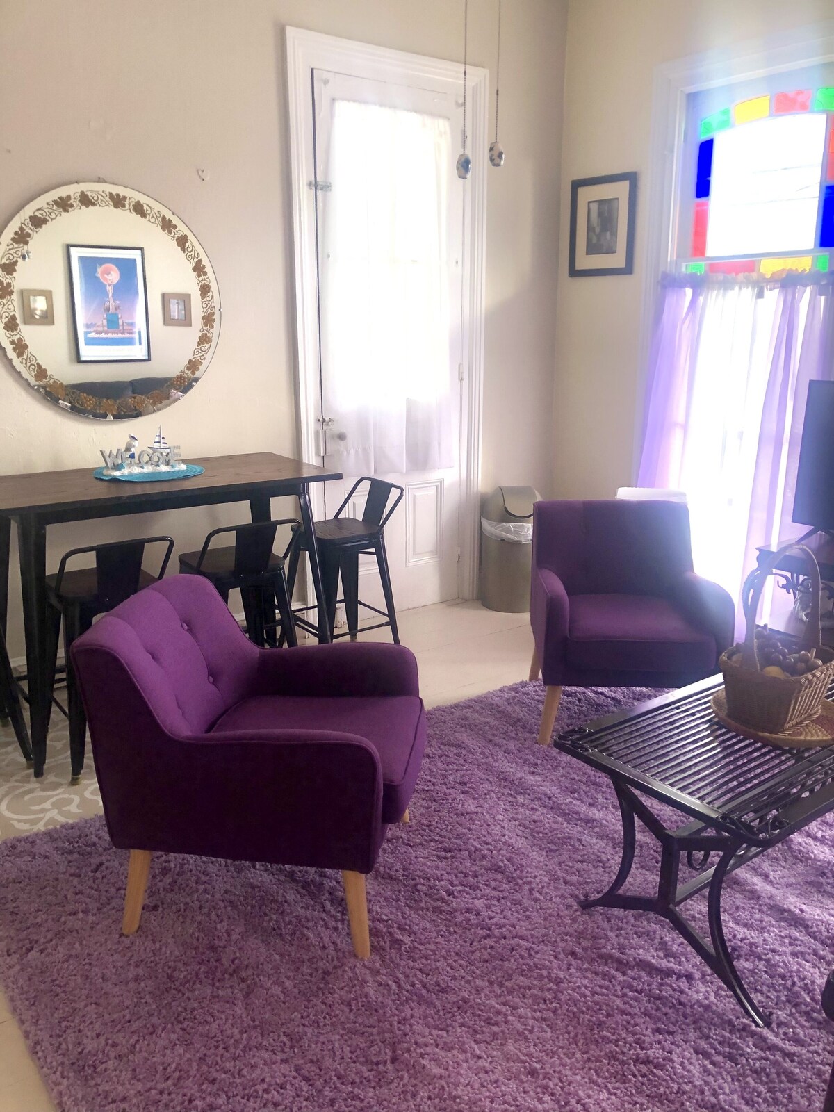 This Charming 150 year old Historical Victorian flat is located 1 block from the beach and 3 blocks from Washington Square (main shopping district)! Outdoor dining table located on the wraparound porch outside of the unit, which is on the first floor. Beautiful decor, including two stained glass windows in the front of the unit, adds to the old world feel of the lovely Cape May Shore. This unit is perfect for a small family (sleeps 4) with 1 bedroom, pull out couch, and comfortable kitchen and living area. The full kitchenette allows for an eat in option on those days when you just want to hang in and relax. The bedroom has a queen size bed and is attached to the updated bathroom. The living room is comfortable with a flat screen smart TV, wireless internet connection, sofa, chair, and dining room table and 4 chairs. Two wonderful screen doors allow the ocean breeze to flow through the unit, making a relaxing area after a day at the beach. For your convenience bed linens and bathroom towels are included. We also stock the unit with enough of your basic necessities to get your stay started. The outdoor shower makes clean-up from the beach easy. All of this in the heart of historical Cape May where almost all the of the local activities are within walking distance!!I Our prices include all fees. No hidden fees.