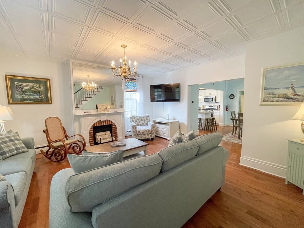 Exquisite home, extraordinary setting, and exceptional location- “The Sugar Plum Cottage” is in one of the most choice locations in Cape May. This stunning Victorian home has custom details and striking architecture throughout the residence. It has been restored to include all of the amenities a sophisticated renter must have today. New kitchens and baths, central air and heat, beautiful front porch, second floor sun porch, back yard, parking and more. A short block to the beach and mall. Sandy beaches, spectacular sunsets, surfing, swimming, dining and shopping just a lazy stroll away. Let your worries disappear as you sit on your front porch and watch the horse and carriage drive by! For sleeping arrangements you have on the first floor two bedrooms. One has a bunk bed with a pull-out trundle, all single-sized beds. The second first floor bedroom has a king-sized bed with a private bathroom. There is also a laundry room / hall bathroom on the first floor in addition to the kitchen, dining room, and living room.On the second floor there are three bedrooms. One has a queen-sized bed and private bathroom. The second bedroom has a king-sized bed and private bathroom. Lastly, the third bedroom has a queen-sized bed and there is an additional pullout queen-sized sofa bed and twin trundle bed in the living space at the rear of the second floor. The third floor has a queen-sized bed and private bathroom; additionally there are two mini-cribs stored on the third floor that guests can use during their stay.Property has light quilts for tenants to use during their stay if they do not wish to bring their own blankets. All guests must bring their own linens/sheets and both bath/beach towels to use during their stay.All bookings and lease payments are handled by Coastline Realty LLC for 114 Decatur Street. Please note that the refundable security deposit cannot be paid by credit card, and a tenant cancellation policy applies to every lease. After placing a reservation you will be contacted with the lease and booking information within 24 hours by Coastline Realty to review and confirm your booking.This is a Pet Friendly Property. If you are not bringing a pet during your stay, you will not be responsible for Pet Rent. For online booking, your lease will be adjusted accordingly. Please include in message before or with your booking if you will be bringing pets and how many (maximum of 3). There is a pet fee per pet. Our prices include all fees. No hidden fees.