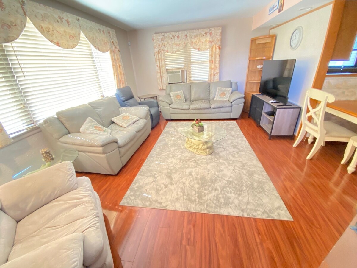 Great location spacious apartment one block from Sunset Lake. 3 blocks from the beautiful Crest beach. Full kitchen with lots of counter space Grill on your private patio. Very quiet and family safe. Free off street parking Our prices include all fees. No hidden fees.