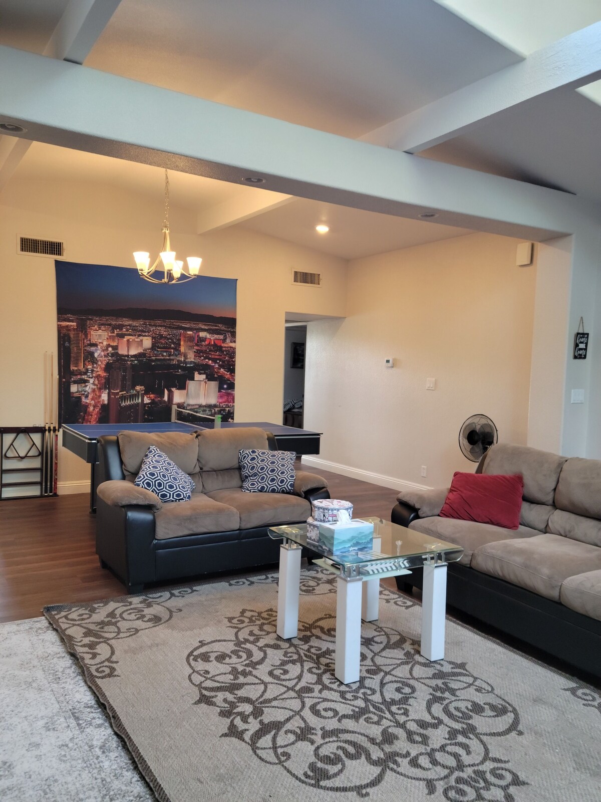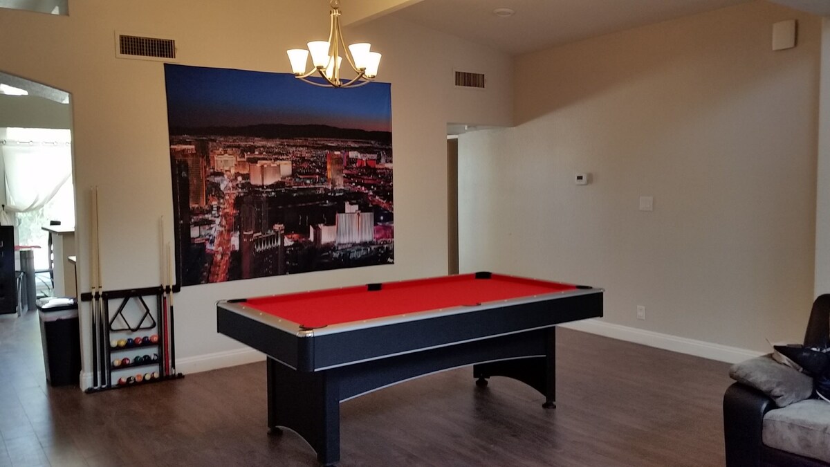 City License # G66-05255 Great vacation home for family!!! *Fully equipped 3 Bed 2 Bathroom house. -There are two queen size beds, one full size and one sleeper in the family/dinning area and one in the living room. *Very roomy living room with pool table/ping-pong table top. *Easy access to US-95 Fwy. -10 minutes to Downtown Las Vegas. -15 minutes to Strip. -15 minutes to Red Rock Canyon. -10 minutes to Spring Mountain Road/China Town. *50'' flat screen 4K TV with home theater sound system. 32\ ,