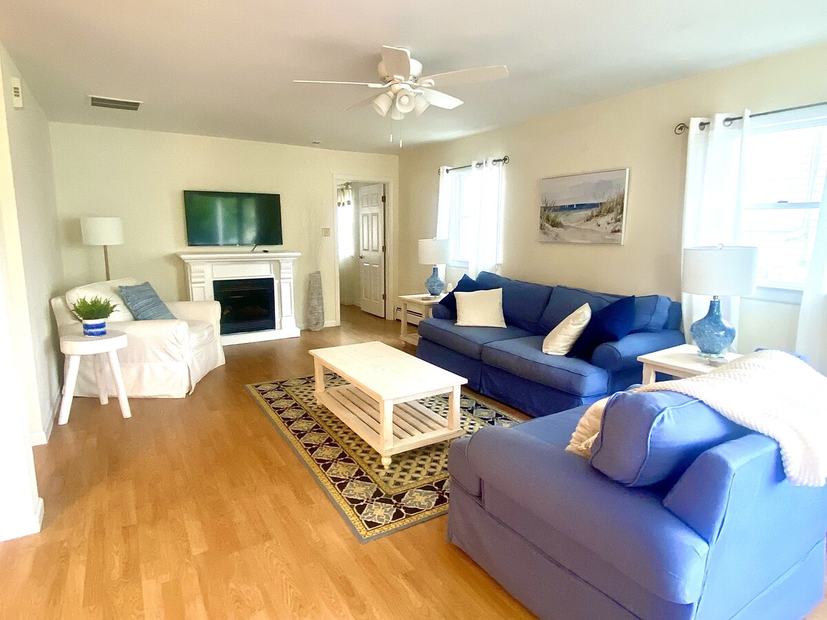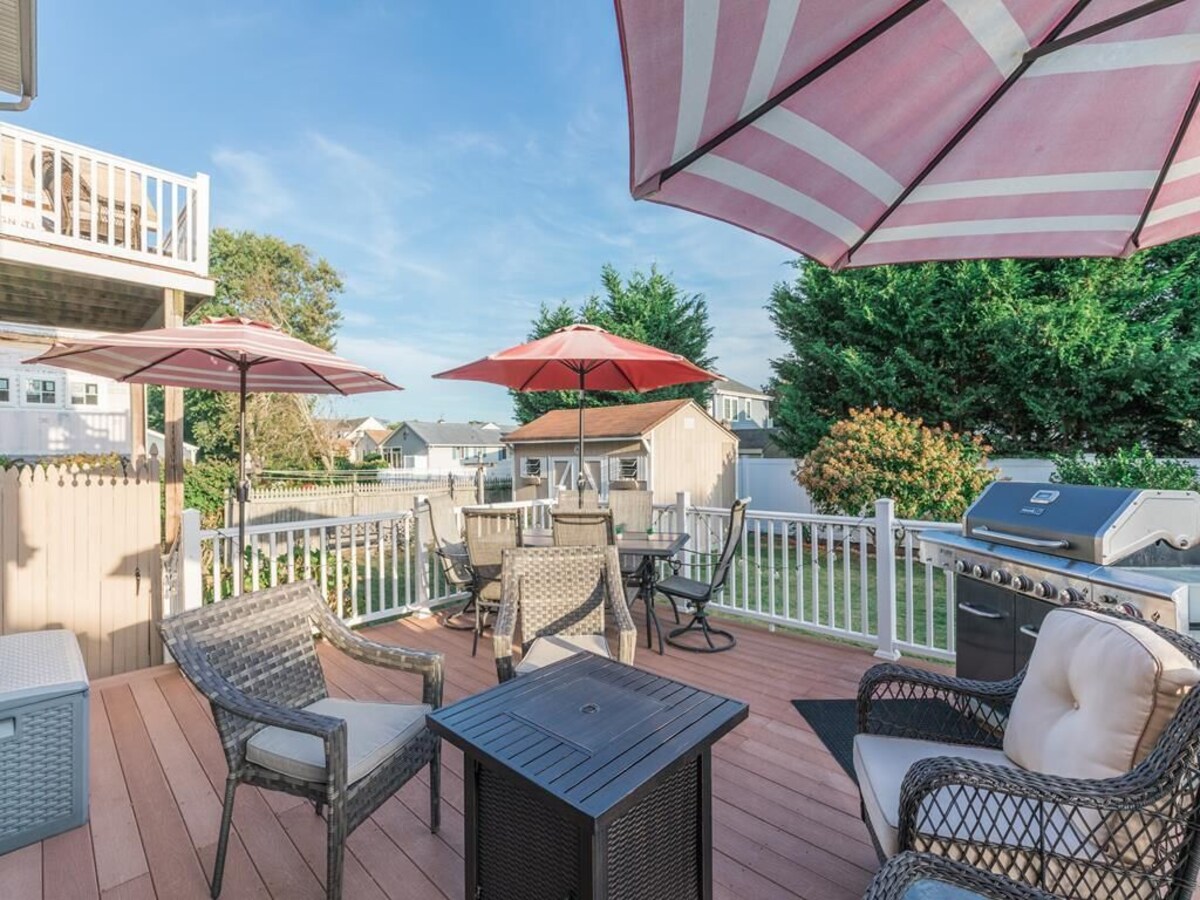 The house is complete with a Cape May style front porch, fully equipped with adorable rocking chairs, perfect for your morning coffee or an after-the-beach drink. The home also has a sprawling, fenced-in back yard with a large deck for sunbathing and grilling. Out front you will also find plenty of parking both in the driveway and on the street.
