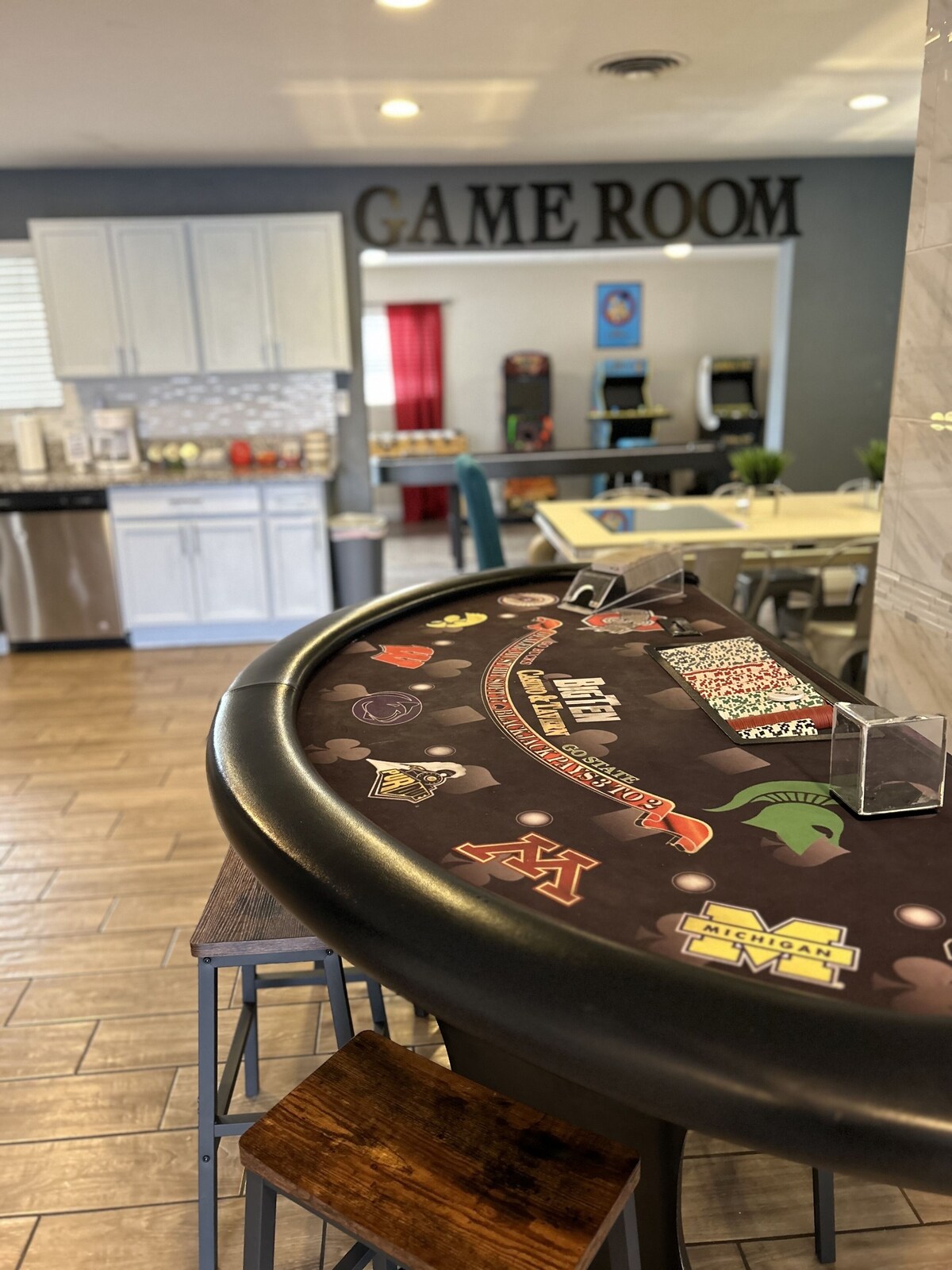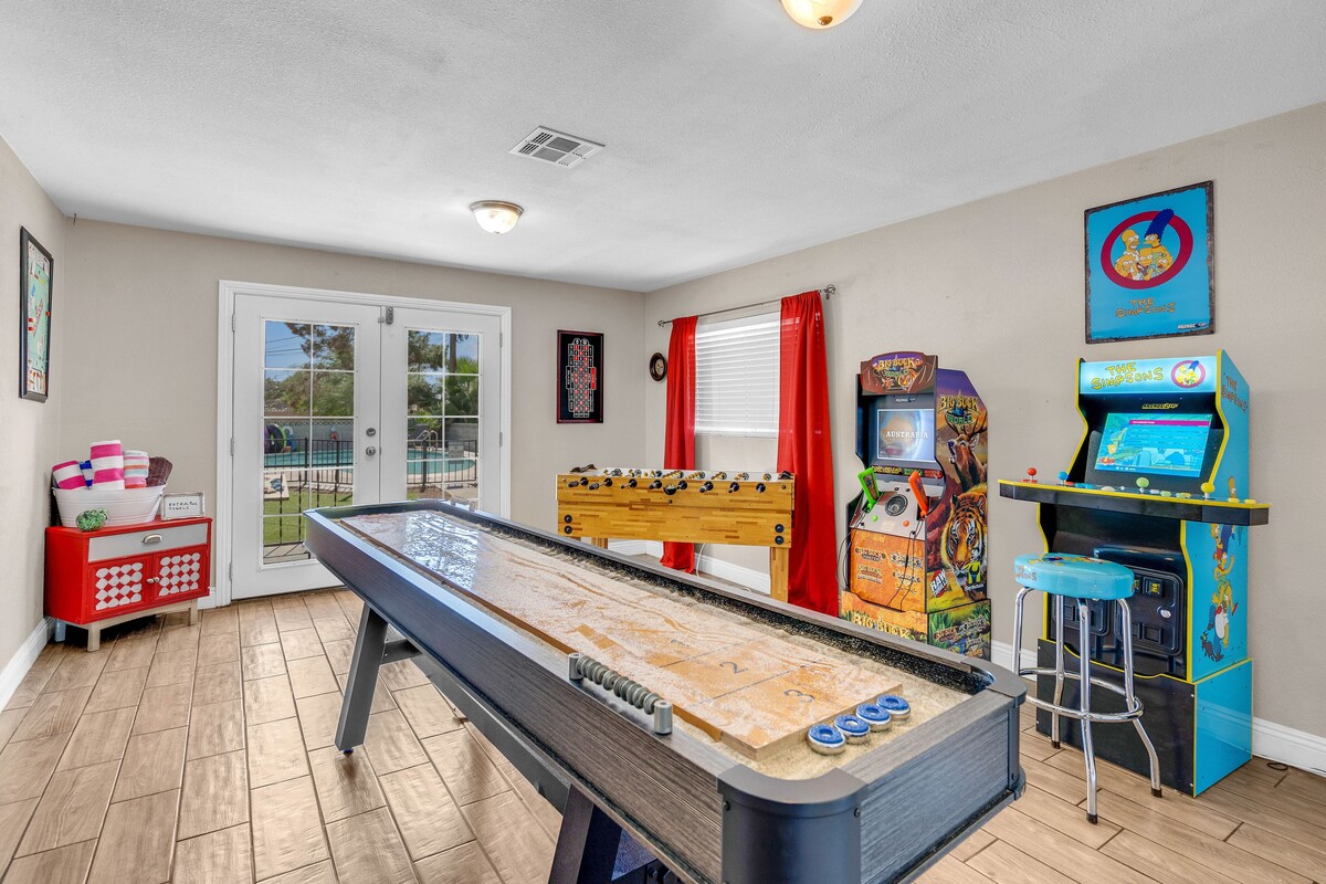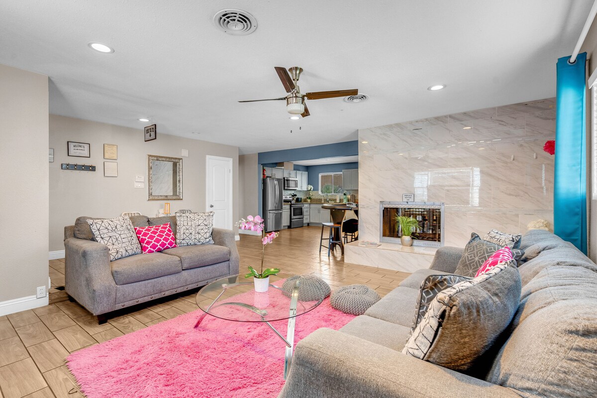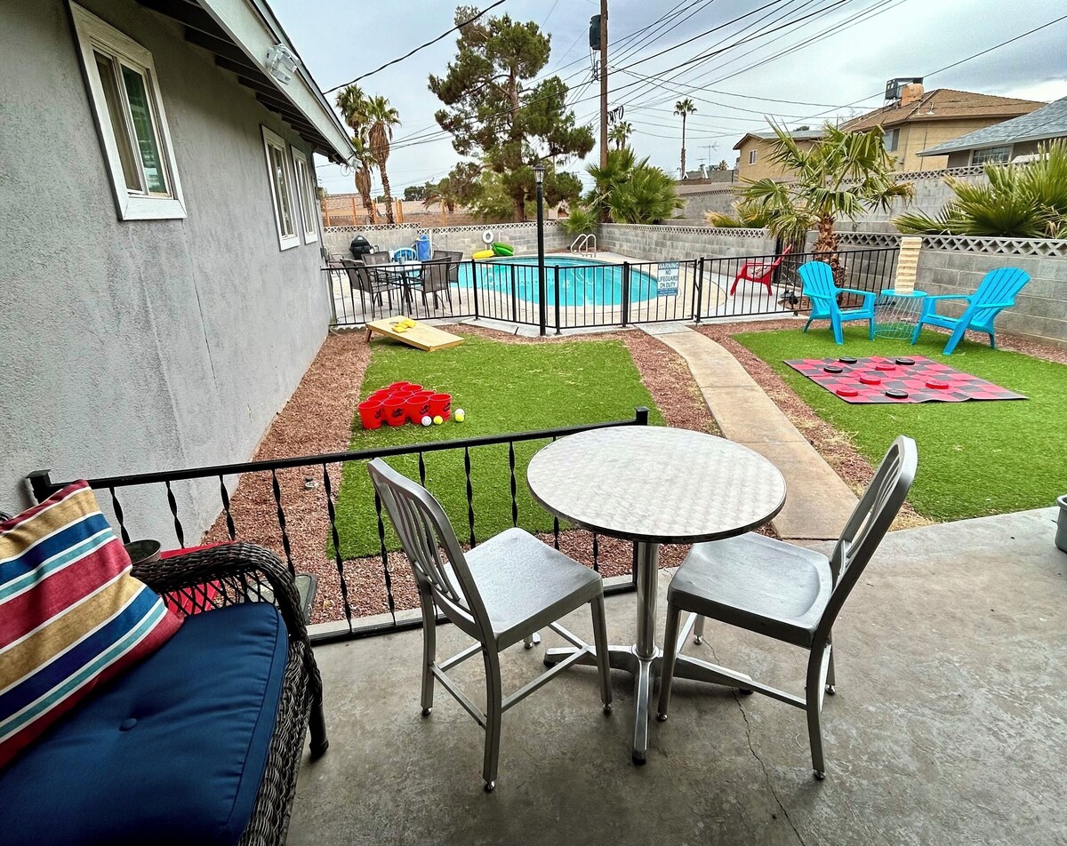 LICENSE G66 00347 About 4 miles to downtown Vegas the Fremont Experience and less than 6 to the STRIP!!! You can actually see the stratosphere from my backyard! Modern comfortable home w/plenty of room for 8 Adults! Backyard oasis with a pool, barbecue grill, lots of yard games & comfy loungers to catch some sun. Incredible game room with Pool table/ping pong table, darts, full size black jack table, karaoke machine and lots of games for the entire family (Yes this does include some adult drinking games). Guest interaction: While I live close and can come by should you need anything I have set up the house so that you should have everything you need and can come and go as you please. I'm always a text or phone call away though should you need anything. Neighborhood overview: The neighborhood is nice, quiet and quaint. It's right across from a nice public golf course. Getting around: There is public transportation close and the house is only 4 miles from the strip. I do recommend using Uber or Lyft to get where you want to go! Our prices include all fees. No hidden fees.
