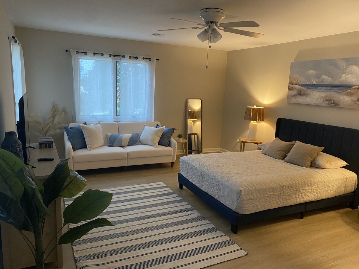 Beautiful North Cape May large and bright home! Come & enjoy the most beautiful sunsets of all the Jersey shore here in North Cape May! Located 5 homes from Delaware Bay Beach where you can enjoy rest, shore activities, sun, nature, and plenty of fun! This 5 bedroom home sleeps up to 12, but will absolutely accommodate your smaller group comfortably. Spacious, bright, full of light, and airy, our home is complete with a screened in porch to enjoy your company into the evening hours. Sunroom is enclosed during cooler months to enjoy basking in the shore rays throughout the year. We are located just steps to the shore to get in your morning walk or jog. Enjoy riding your bike along the bay while taking in the fresh shore air. Walking distance to Harpoons on the Bay where you can enjoy sunset drinks & food. Short drive to everything else including Historic Cape May with its famous beautiful old mansions & famous Washington Street. Escape the busyness of Wildwood, yet be there within a short 15 minute drive for all that the boardwalk has to offer. We are located within a few minutes from the Delaware May-Lewes Ferry where you can jump on to take a day trip, or simply enjoy the eateries, drinks, and entertainment located at the beautiful new terminal. Feel free to head over on your bicycle! Plenty of visitor information can also be found there. There is a great locale there where you can enjoy outdoor, terrace & indoor sunset drinks & food. Nature enthusiasts will enjoy local bird migration tours and other nature & sea life experiences. Local town pool just blocks away. Short drive to the NAS Wildwood Museum which is well-worth the visit. Multiple local winery & brewery locations to enjoy. Plenty of local shopping including smaller shops, and larger essentials shopping such as at ACME, Big Lots, Marshalls, Lowes, Walmart, and more. Cook, or enjoy cuisine from the many local eateries where you can sit down, pickup, or have have your meal delivered. More about our home: This is two story corner, property facing the bay. Our shore inspired, newly decorated, clean, & spacious 5 bedroom home is ready for you to make new memories. New furniture & mattresses throughout. If choosing to enter through the front door, you will find the dining room and kitchen area. The fully equipped kitchen includes 12 person dinnerware both ceramic & plastic for outdoor eating. All cooking and baking essentials provided to make your morning pancakes, & other favorite recipes. Wine glasses & espresso for the adults & s'mores & fondu set for the kiddos! Sit down in this indoor eating area or choose either of the two outdoor spaces. Don't like walking up steps? Then use one of the two bedrooms on this first level. The first bedroom includes a cozy queen size bed and lovely decor. Guests of this bedroom can sip their morning tea in front of the large bay facing windows or enjoy some early evening beverage of choice with glimpses of the sunset sky. Just next to this queen sleeper room is the second bedroom with twin trundle, easily accommodating an additional two guests. Through the kitchen, you will find the spacious living room/den area with high cathedral ceiling and wide bay window & sliders. Find plenty of space here to enjoy one another while playing games or watching a movie. Next to the living room, you will step down into the 3 seasons screened or covered porch to spend time with your loved ones enjoying the fresh shore air & sunlight. Outdoor patio also included in the yard, complete with gas grill for you to fire up your favorite fire-roasted cuisine. Also, on the first floor you will find a complete laundry/ mudd room space to drop off your sandy beach gear before heading through the rest of the home. Many amenities in here to make your stay convenient & conformable. The wide staircase leads guests to the second level complete with three spacious bedrooms. You will first encounter the double bedroom, then the four-sleeper double twin trundle bedroom. Lastly, there is a spectacular bedroom suite which includes a sitting area futon couch to enjoy the sunset, or have your morning coffee with tranquil views of the bay. In the bedroom suite, you can make a cup of coffee before heading into the office nook/workspace to check in at the office. Numerous windows all around the home for a uniquely bright and airy shore feel. Bay views can be enjoyed from all second floor front windows. Plenty of closet, cabinet, & drawer storage space for all your needs throughout the home. Numerous parking spots in the driveway, front & side of the home for you to leave your vehicles and walk to the bay. Convenient side entrance takes you to the laundry area to dust off the sand, or another which leads you to the living room/ den area. Whether you a looking for a weekend escape or longer getaway, we would love to have you. N. Cape May is truly a special place anytime of the year. We know that your time here will leave you feeling relaxed and with lasting memories. Many seasonal events to take park in near the area including, Shorebird & Horseshoe Crab Celebration, Jersey Sea Glass Coastal Arts Festival & sooo much more. Thanks for looking! Our prices include all fees. No hidden fees.