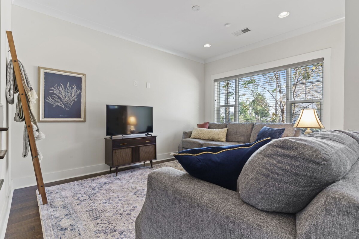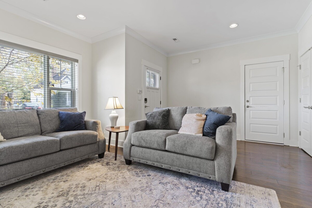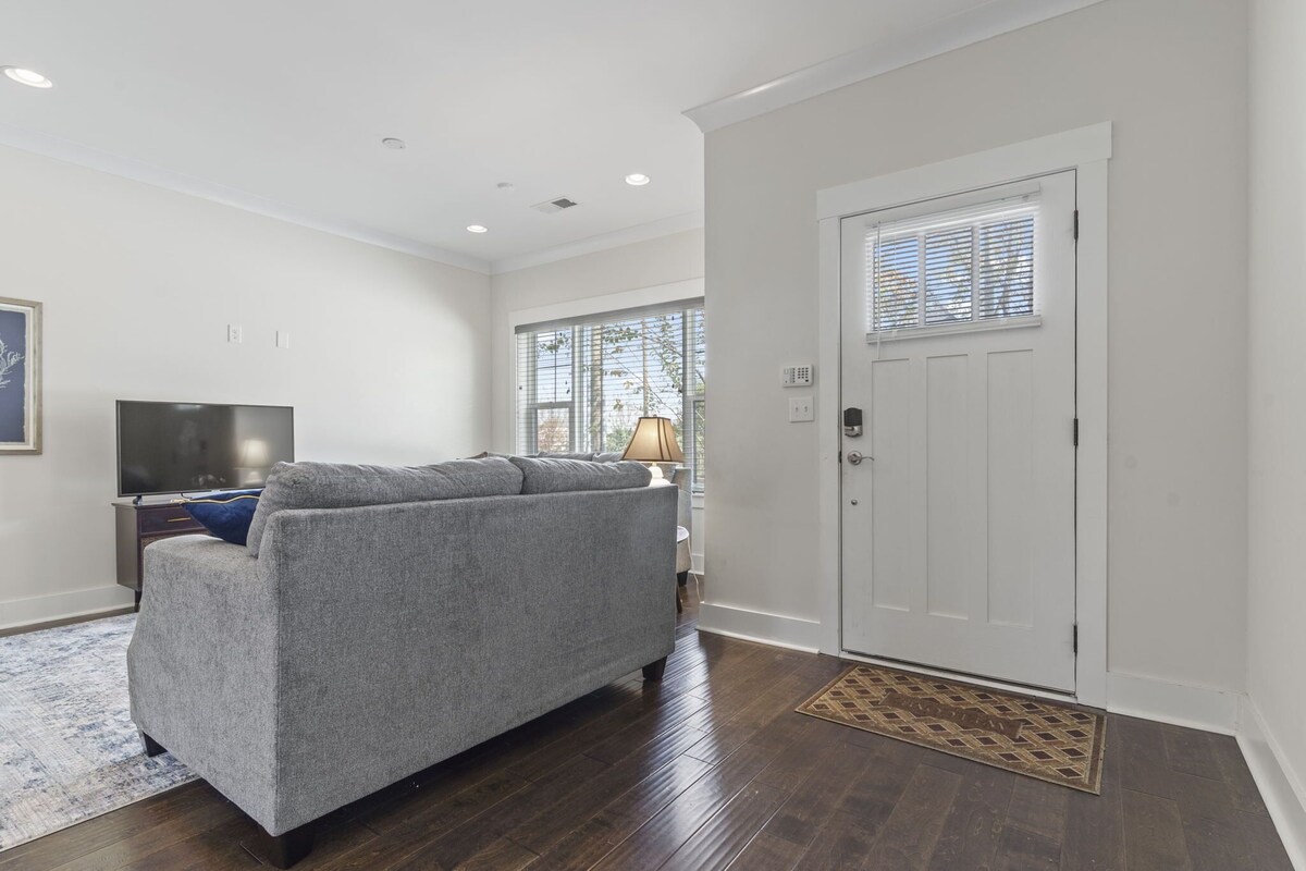 Welcome to Alta Novella, your perfect monthly rental, located within walking distance of Downtown Greenville! Boasting 4 bedrooms with private en suite bathrooms, a fenced in patio perfect for your pets (pet fee required*), a state-of-the-art kitchen, luxurious dining room, and two living rooms, our home truly has it all. You won't find a better location, as baseball games at Fluor Field area 1/4 mile away and Greenville's famed Fall's Park is 1 mile away. We can't wait to host you! Our three-story town home is ready and waiting for you and your guests, with gathering spaces on each floor and 3 outdoor seating areas. Alta Novella is available for monthly rental (30 days to 6 month) and perfect for those looking for their new home in the upstate, waiting on a home to be built, or in the area for an extended work trip. All utilities are included and our home is fully furnished. *Pets are welcome to join you for your stay for a fee of $250 for the first pet and $100 for each additional pet. Read on to get a better idea of what to expect at our home :) ~The First Floor~ Guests are able to park either in our small driveway or in the ample street parking in front of our home. Upon entering, guests will find a cozy living room with a couch, a love seat, plenty of plush throws, and a Smart TV (streaming only on our high-speed Wi-Fi, no cable). This floor also houses our laundry room, which is available for guest use. Finally, we have our first suite, a Queen room, featuring a Queen bed, small table and chair area, dresser, and full bathroom with a single vanity and a step-in tile shower. The back of this bedroom leads to our patio, where guests can enjoy our fenced-in outdoor area, complete with an outdoor dining table and chairs. ~The Second Floor~ After proceeding upstairs, guests will be on our main level, which houses a large dining room with ample seating for 10 (2 long benches, and 2 chairs). Stunning bespoke bookshelves and a gas fireplace complete the room, which is just off of our luxury kitchen. Our kitchen features a gas range, microwave, stove, granite countertops, and all you will need to cook up a delicious meal. A half-bath is located just off the kitchen for your convenience. Additionally, our first of 2 balcony spaces is off of the dining area, featuring 6 padded rocking chairs-- a perfect place to converse with friends. Finally, this floor features our second bedroom, the Master Suite. Our Master Suite has a King bed, a small seating area for two, and a large, luxurious bathroom. Our bathroom has its own toilet closet, two vanities, a large walk-in closet (hangers provided), and a jacuzzi soaking tub/shower combination. ~The Third Floor~ Our third and final floor was designed with a younger crowd in mind. The stairway leads up to another living space, where we have included a desk area for those who may need to work from home. This hallway leads to our \ boasting leather reclining couches and chairs, and plenty of floor cushions for the whole family to snuggle in to watch together. The bookshelves surrounding the TV contain fun games and puzzles for the entire family. Off of this living space is the second balcony, which is smaller than the first and has 2 chairs for those who may prefer a quiet place to converse. Our final two bedrooms are located on this floor. The first bedroom is our King bedroom, featuring a small dresser, end tables, King bed, closet, and a private bathroom with a glass door shower. The second bedroom features two full beds and a large closet. The large en suite bathroom contains a double vanity, traditional tub/shower combination, and toilet. With plenty of places to gather together, and for each of your guests to have their own space, Alta Novella truly has all you need for your next Greenville adventure! We tend to allow our guests to keep to themselves, but are always a message away if needed! We are located near downtown in a transitioning neighborhood that is quickly moving up. There is frequent foot traffic on this street and a soup kitchen at the end of the road. While Alta Novella is perfectly positioned for walking to Downtown, we do recommend a car for seeing the other amazing sites that Greenville has to offer. Uber is also available for a quick trip beyond the Downtown area. Smoking is permitted outside, provided all exterior doors are closed and buds are disposed of safely (i.e., not in a trash bag/paper cup/or other flammable container). Smoking indoors or leaving buds in the yard is prohibited and will incur a $250 fine. No tampering with smart lock, Wi-Fi router, or ring camera. Our prices include all fees. No hidden fees.