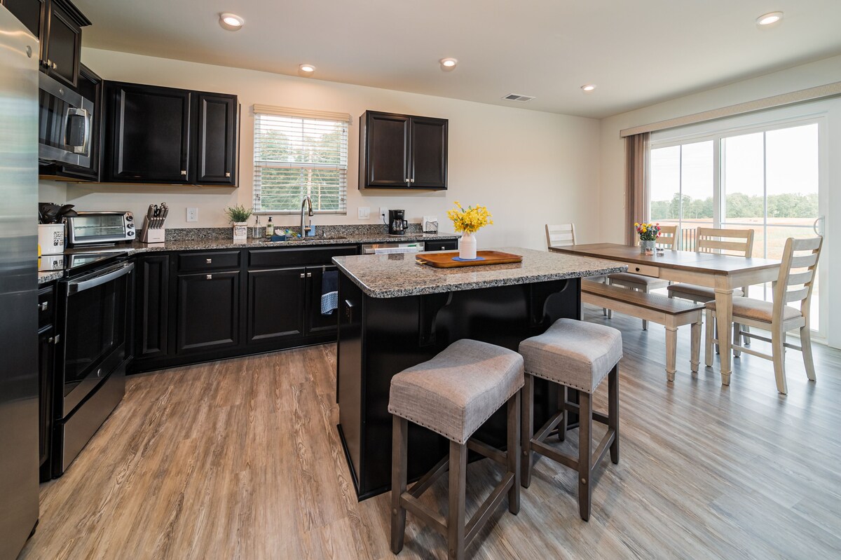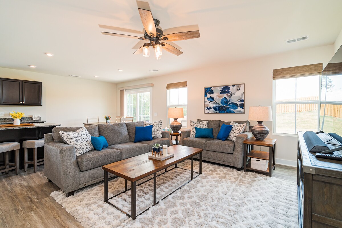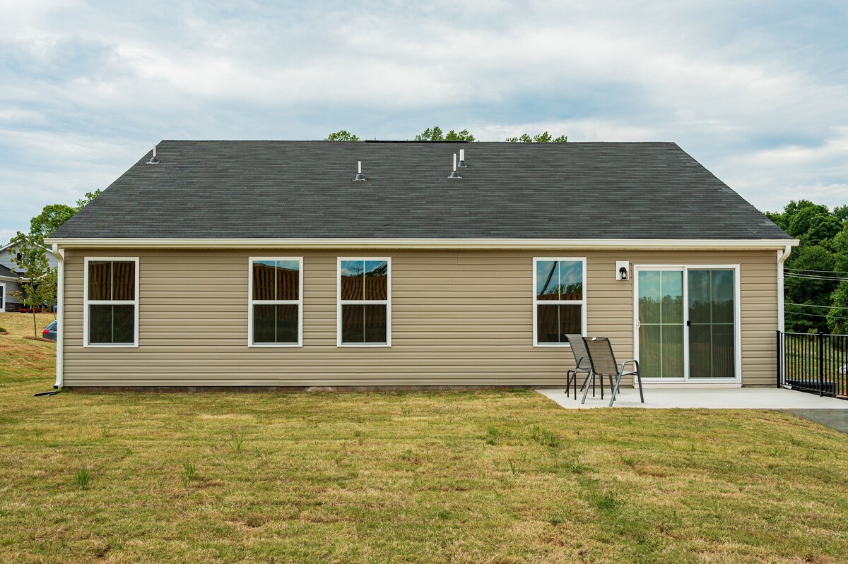 Welcome to Creekstone Cottage! A beautiful newly constructed 3 bedroom, 2 bath ranch home located in Mauldin. We are very close to Conestee Nature Park, The Donaldson Center, and Lockheed Martin as well as 20 min to Downtown Greenville. Our home is available for rental on a monthly basis-- perfect for those relocating or visiting family. Pets are accepted with a pet fee on a case by case basis. A $750 security deposit will be requested after booking. Welcome to Creekstone Cottage, your beautiful home away from home. Located in a brand-new subdivision, this 3 bedroom, 2 bathroom home is perfectly appointed to welcome you and those you love for stays of 1 to 6 months. Upon pulling up to the home, you will notice a nice driveway that leads right into a 2-car garage, which is available for guest use. When you come through the front door, you will be welcomed into a foyer area, with places to store your shoes and bags. The Queen bedroom and Twin bedroom/office are to your left. If you proceed straight down the hallway, you will come to the open-concept living area. A kitchen with a full island and stainless steel appliances is fully stocked with all you will need for cooking homemade meals. The dining space has room for 6 and leads to the backyard and small patio space. When you're ready to relax, the living room features cozy sofas, a large Smart TV (available for streaming only, no cable), which sits atop an electric fireplace. The Master bedroom is off of the living room, giving it space and privacy from the other two bedrooms. It features a King Bed with a Purple mattress, nightstands, dresser, and TV. The large Master Bathroom has a double vanity and stall shower, and leads to a large walk-in-closet. At the front of the house, the Queen room features a Queen bed, nightstands, closet, and dresser. The small twin bedroom also doubles as an office. It has one twin bed and a large sit-to-stand desk available for your use. Pets are welcome to join you for your stay for a fee of $250 for the first pet and $100 for each additional pet. We know that you will enjoy this lovely new home, and we can't wait to have you! Have questions? Feel free to reach out-- we are happy to help you plan your stay. We tend to let our guests keep to themselves, but are always just a message away if needed. Our home is located in a brand-new development in Mauldin. They are still completing the neighborhood, and those surrounding it. A car is required, as there is no reliable public transportation in this area. Smoking is permitted outside, provided all exterior doors are closed and buds are disposed of safely (i.e., not in a trash bag/paper cup/or other flammable container). Smoking indoors or leaving buds in the yard is prohibited and will incur a $250 fine. Our prices include all fees. No hidden fees.