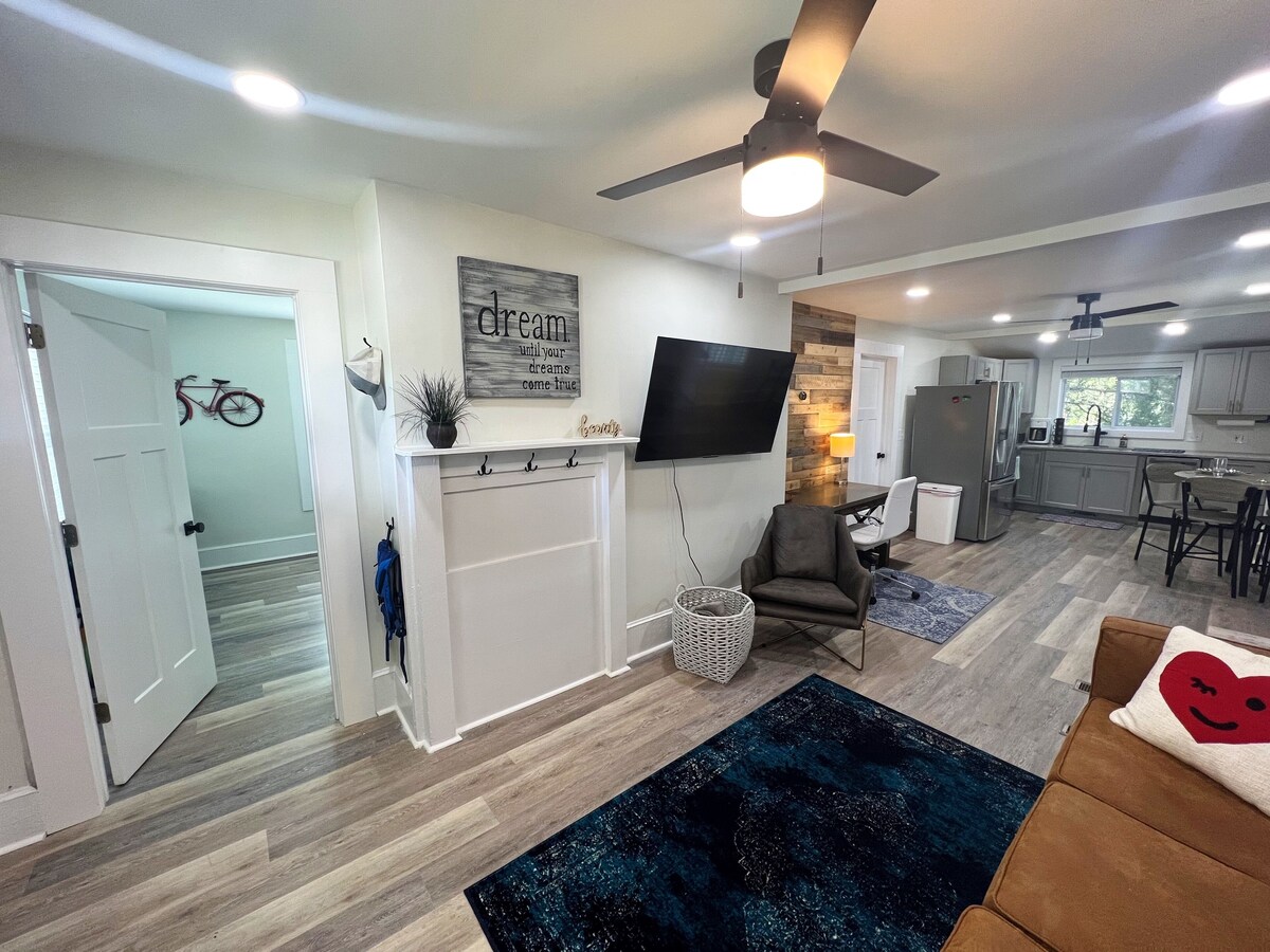 Welcome to the recently updated 2 bedroom 1 bath home in the heart of 'West End' Greenville. You are just a couple minutes from DownTown Greenville. Walking distance to Unity Park, Swamp Rabbit Trail, Greenville Drive Baseball at Fluor Field, Falls Park on Reedy. Conveniently located with easy access to I85 and 385 the major highways in the area. Lottie B’s Casa is fully equipped home, pet friendly, and available for just days to many months and anything in between. You are greeted with the warmth of the family room adjacent to that is a great work space and fully equipped kitchen. The bedrooms are on the left side of the home with the front bedroom with a Queen Bed just off the family room and Master bedroom with comfy Queen Bed as well off the Kitchen, with attached bathroom. The bathroom is something to be admired…Custom glass, tile, lighting, and more. We hope you like the little touches of rod iron pipe used as towel racks and toilet paper holders. The hook rack is refurbished original wall stud from 50+ years ago…we just love the warmth this adds to the bathroom You will love the custom finishes and furnishings in this home. Granite countertops, gold finishes throughout, stainless steel appliances, spacious French Door fridge, a stove and oven that is smartphone ready and easy to use. Two Smart TV’s mounted on the wall, one in the master bedroom measuring 30”, the main TV mounted in the Family Room with ability to adjust towards the kitchen if preferred. In the Family room is seating for 5…a comfy leather couch and two super relaxing leather chairs. We hope you like the recycled Solar Panel as our black board. Everything in this home has been thought through for the vision of making a warm welcoming experience for all our guests. Guests will be able to enjoy all the outdoor activities available for free in Downtown Greenville…Free Music at Noma Square, Festivals and Eateries all year long. Easy walk to the Commons offering; coffee, baked goods, a couple cute eateries, and local pub with dozens of choices of micro brews. West Greenville, is known for its Art District a couple miles away from the home. West Greenville offers a little more relaxed vibe with tasty delicacies from Rise Bakery, or fantastic pizza at Coastal Crust Pizza, relaxed atmosphere at Margaret Bar, and much more down on the West End. ** We are pet friendly, additional costs associated PER PET FEE for the Stay. Thank you. ** Our prices include all fees. No hidden fees.