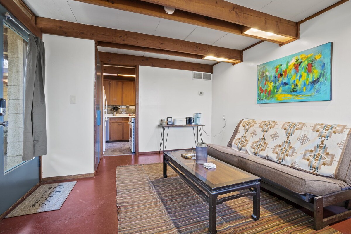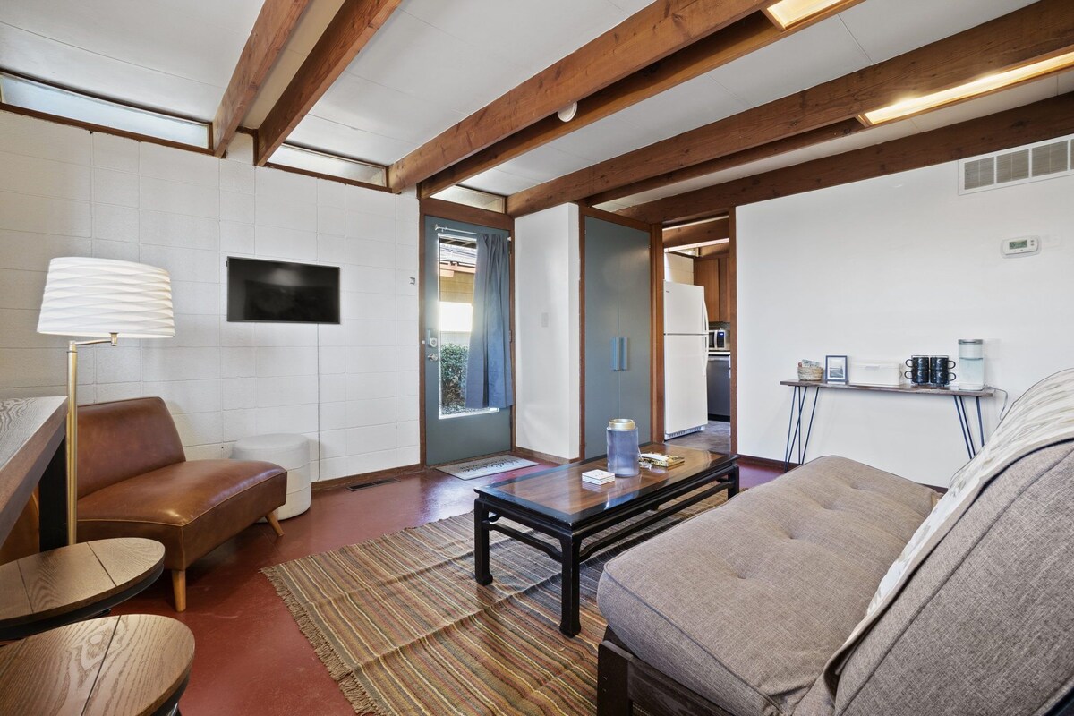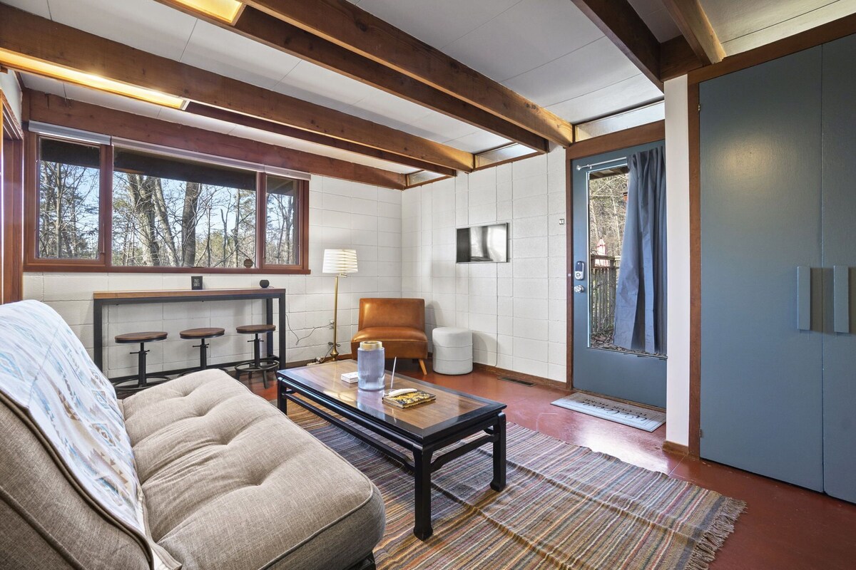 Welcome to the Lodge at Paris Mountain, a true one-of-a-kind experience on 16 acres with a view of Paris Mountain. Our excellent home is tucked away, but still conveniently located, as we are: 1 mile from Furman University 8 minutes to Downtown TR 15 minutes to Paris Mountain State Park Entrance (other side of the mountain) 15 minutes to Downtown Greenville Designed by Frank Lloyd Wright's protégé, this authentic Mid-Century Modern Guest suite is perfect for your next adventure. Nestled up a long driveway in 16 acres of woods is the Lodge @ Paris Mountain, a small apartment located behind the carport of this idyllic Mid-Century Modern home. Our home is pet-friendly and available for monthly rental (30 days-180 days). Guests will be able to park in our large driveway and have a private entrance to the Lodge. Once inside, guests are greeted with a cozy living area, complete with a Futon, that doubles as the second bed (linens are provided in the game closet), a TV for streaming (no cable), a stocked coffee bar, stocked game closet, and a lovely bar-height dining table that looks out over the surrounding woods. Off of the living room is a small kitchen with original cabinets, a stove, refrigerator, microwave, toaster, dishwasher, and all you'll need for preparing a quick meal. Finally, off of the living area is our singular bedroom, featuring art work by the owner, a king bed, reclining chair, perfect for reading, and antique lamps. A \ connects the bedroom to the single bathroom, with a toilet, sink, and tub/shower combination. The dressing room features a comfortable chaise, a cabinet for towels and extra blankets, and antique finds such as a Tiffany-style lamp and mahogany framed mirror. We have done all we can to ensure a serene, idyllic, and period getaway for all of those looking for a stay that is unique and one-of-a-kind. Pets are also welcome at our home with a one-time fee, which is charged during booking or requested after booking if applicable. The private deck is the perfect spot to relax and unwind. The mountains are calling! It's time to go! Guests have access to the entire guest suite and to parking in the upper and lower circular driveways. I am available if needed but respect the privacy of my guests. Please note, a family does live in the main house, and you may see them as you walk to your unit, but once inside, it is quite private. No tampering with the wifi router or smart lock, please. Smoking is permitted only on the back patio, provided all exterior doors are closed and buds are disposed of safely (i.e., not in a trash bag/paper cup/or other flammable container). Smoking indoors or leaving buds in the yard is prohibited and will incur a $250 fine. Our prices include all fees. No hidden fees.