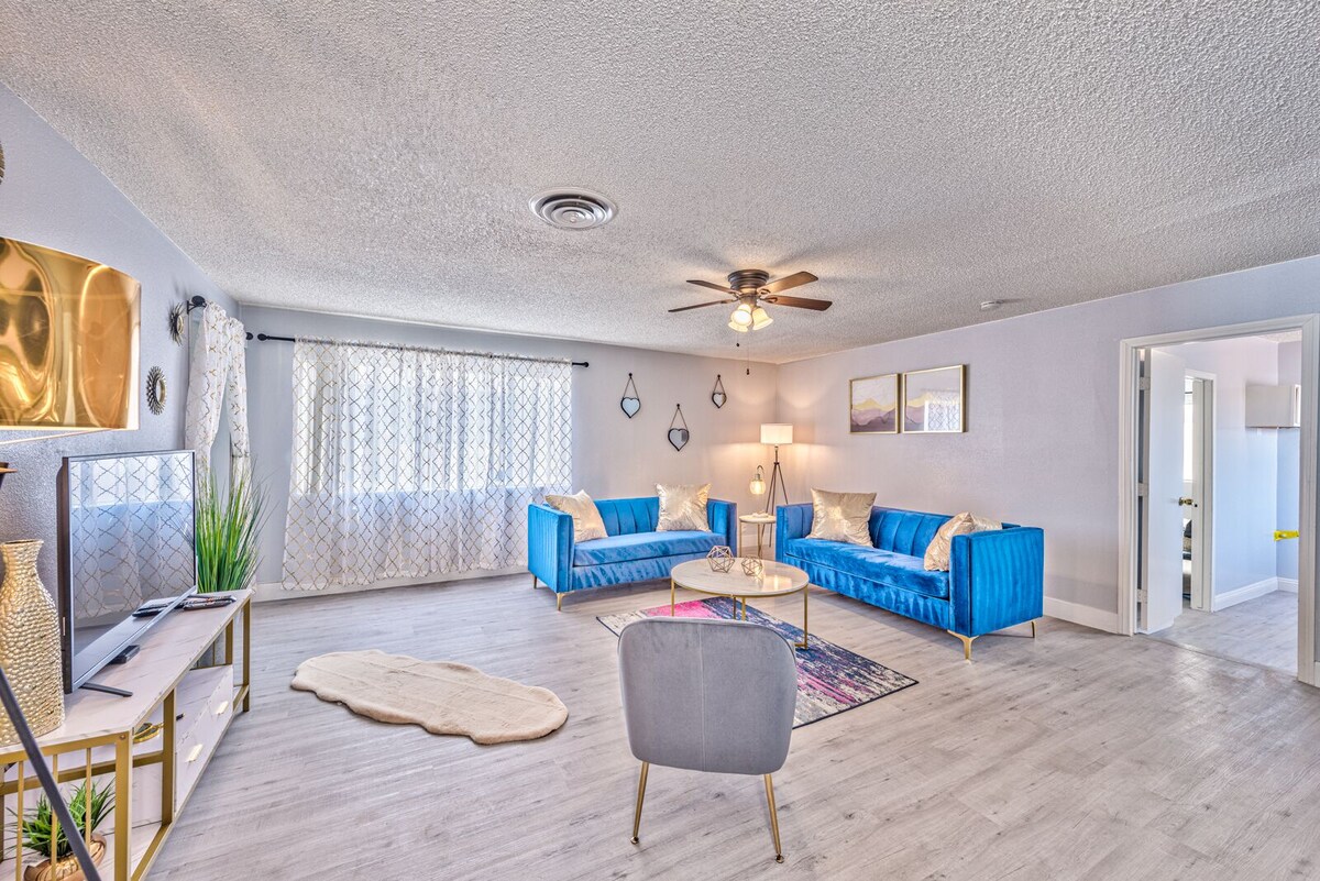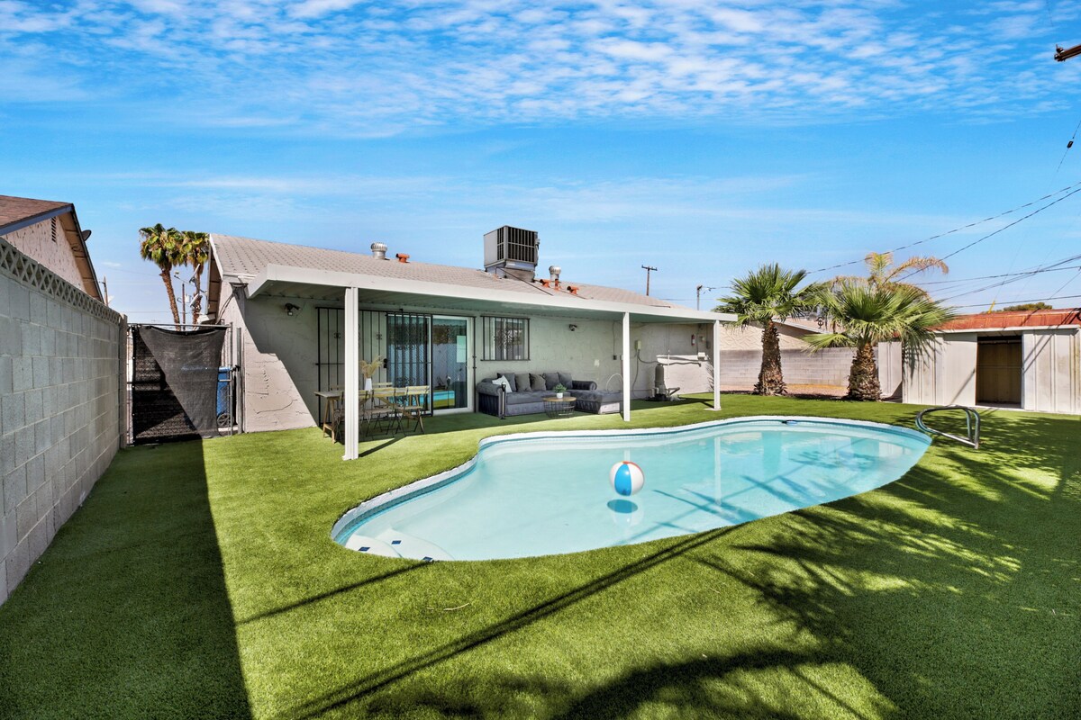 Luxury Vegas VIP Home – Your Perfect Getaway! Escape to a stunning and exclusive retreat just 2 miles from the Las Vegas Strip! Our 3-bedroom, 2-bathroom villa offers a spacious, newly remodeled space that accommodates up to 11 guests in complete comfort and luxury. Whether you’re here to enjoy the electrifying energy of the Strip or to unwind in peace, our home is nestled in a quiet, private community, providing the perfect balance of relaxation and convenience. Our villa is designed for families, groups, or friends seeking an unforgettable Las Vegas experience. The combination of modern luxury and serenity will ensure you make the most of your Vegas adventure. House Features: Sleeps 1–11 guests – the entire house is exclusively for your stay, ensuring privacy and comfort. 3 luxurious queen-sized beds, 1 bunk bed (twin over full), 2 plush sofas, and 1 rolling bed provide plenty of sleeping options for your group. Newly remodeled with brand new furniture and high-end mattresses, ensuring you get the best rest possible with ultra-soft sheets and cozy down comforters. Private, spacious pool (non-heated) – perfect for enjoying the sun, relaxing, or having fun with the whole family. Gorgeous views of the Las Vegas sunsets – unwind while enjoying the breathtaking vistas from your backyard. HD Smart TV in the living area and bedrooms, connected to streaming services for all your entertainment needs. Fully equipped kitchen to prepare your favorite meals with ease, or host a fun dinner party with all the necessary appliances and cookware. Central air conditioning and heating to keep the home comfortable year-round. Extras & Amenities: Laundry facilities (washer & dryer) for your convenience – pack light and freshen up your clothes as needed. BBQ and outdoor seating area – enjoy dining al fresco or grilling up your favorite meals while soaking up the sun. Security cameras located at the front and back of the house, ensuring you feel safe and secure during your stay. 100% Non-Smoking – smoking is allowed only outdoors in the designated area to maintain the home's pristine condition. Parking available, including space for your RV – no hassle finding parking. Close to award-winning golf courses for a relaxing day of golf or outdoor activities. Just a short drive to the convention center – perfect for convention-goers looking for a comfortable and private retreat. Professional maid service included, ensuring the home is always spotless. Fresh, high-quality linens and towels are provided for every guest. Relax in Style: Unwind in ultimate comfort in the master bedroom with an UltraPlus mattress, 1800-thread count sheets, and a cozy down comforter. Step outside into your private backyard oasis, where you can soak in the Las Vegas sun or relax under the stars with your loved ones. Whether you’re lounging by the pool, playing in the backyard, or relaxing indoors, this villa offers everything you need to feel like a VIP in Las Vegas. The Perfect Vegas Retreat – Whether you're visiting for the excitement of the Strip, the convenience of the Convention Center, or the relaxation of quiet community living, our Luxury Vegas VIP Home provides the perfect base for your Las Vegas getaway. Book today and enjoy your dream vacation in style! Our prices include all fees. No hidden fees.