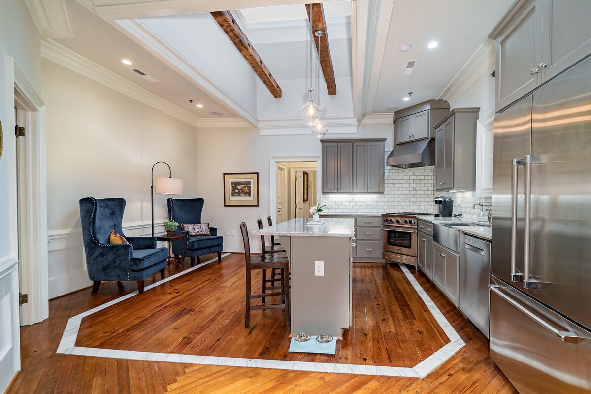 A once in a lifetime opportunity awaits guests of LOFT 1892, a beautifully restored condo on the corner of Downtown Greenville's N Main St and East North St. Pets are welcome with a one time fee. This home features 2 luxurious master suites with state-of-the-art walk in showers, and four-poster beds. The Loft was built around 1892, and began as a grocery store. The hardwoods are original, except for the kitchen, and the Queen bed, and beams are period as well. You can't get any closer to Downtown than this! The beautiful pink building is situated right on N Main St and East North St. Step down the stairs from your loft right into the bustling street to grab food from our amazing restaurants or shop at local boutiques. Guests will need to park on the street (Free on weekends if you can find a space) or for $7/day in the parking garage less than a block away. The entrance to the condo is between downtown businesses, and leads to a large, carpeted stairwell that brings you to the Loft. Once inside, the intricate details of this condo will take your breath away-- ornate door knobs, beautiful crown molding, antique artwork, and a fully remodeled kitchen with stainless steel appliances and quartz countertops are but the tip of the iceberg in this luxury accommodation. The living room is inviting and warm, featuring a mix of modern and antique pieces. A large screen TV is available for you to login to your streaming apps (no cable). The windows at the end of the living room look straight out over Main Street, and can be opened to enjoy the view and the breeze. The kitchen features bar seating for 3 as well as a cozy reading nook with blue velvet wingback chairs. After passing through the kitchen, guests will come to the Master Bedroom, situated at the back of the condo. This large room features those beautiful original 1892 hardwood floors, a King four-poster bed, cozy reading chair, and a TV. There is a dresser for clothes and a large closet for storing formal attire. The en suite bath is truly stunning. A double vanity and toilet nook start off the space, but what really gives it the wow-factor is the large tiled walk in shower complete with 3 shower heads-- a standard one, hand-held shower head, and the coveted rain shower head-- like having a personal spa! Off of the kitchen and behind the living room is the second suite. This one is adjacent to main street and features a 19th century handmade wooden four-poster bed (Queen size). 2 nightstands, a dresser, reading chair, and small TV fill out this gorgeous room. The en suite bath does not disappoint, as it has a large single vanity as well as a walk in shower with dual shower heads. After enjoying the artistry and serenity of the first floor, you'll want to explore the second level. Guests can climb a large, spiral staircase to an additional loft seating area with a large corner desk for getting some much needed work done. The seating area is cozy, as the walls are covered with high-end boards, giving it a rustic, inviting feel. The seating area leads to a back door, which takes guests to our roof-top deck. A large seating area ensues, and an outdoor TV is available (streaming only) for an evening movie night. You just can't beat the view-- standing on top of this iconic, historic building looking out over Main Street! No matter if you are coming for business, pleasure, honeymoon, wedding night, or special anniversary, we cannot wait to host you at LOFT 1892. *Pet fee will be charged when booking or requested after your reservation, if applicable* We allow our guests to keep to themselves and enjoy their stay, but are always just a message away if needed. Your neighborhood is the highlight of Greenville! A short walk from the post-card famous Fall's Park with its beautiful view of Reedy Falls from the suspension bridge and all the fun, food, and entertainment that Main St offers. If only looking to explore downtown, a car will not be needed, as everything you may need (including pharmacy/drug store) is in walking distance. However, if you'd like to explore other areas of Greenville, such as shopping at the malls, or getting out to the 3 local state parks, you may prefer to have a car. Smoking is permitted outside, provided all exterior doors are closed and buds are disposed of safely (ie, not in a trash bag/paper cup/or other flammable container). Smoking indoors is prohibited and will incur a $250 fine. Our prices include all fees. No hidden fees.