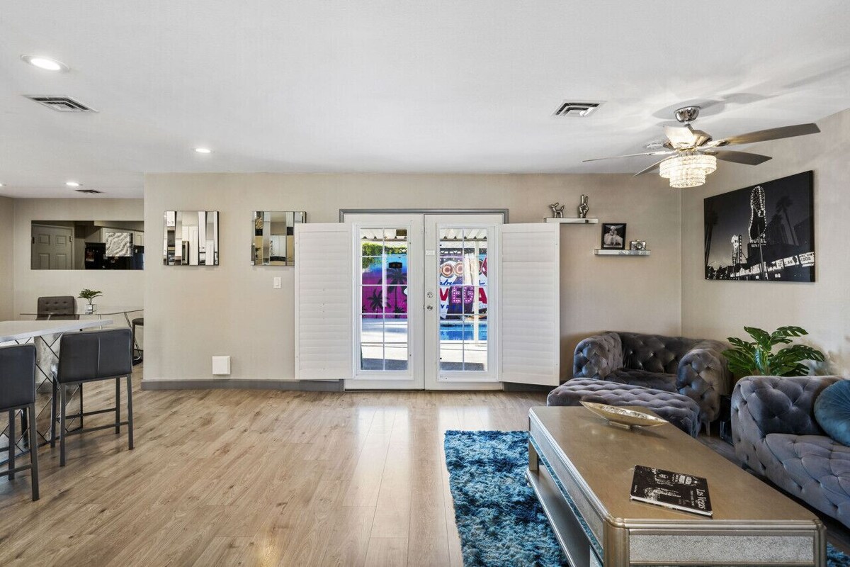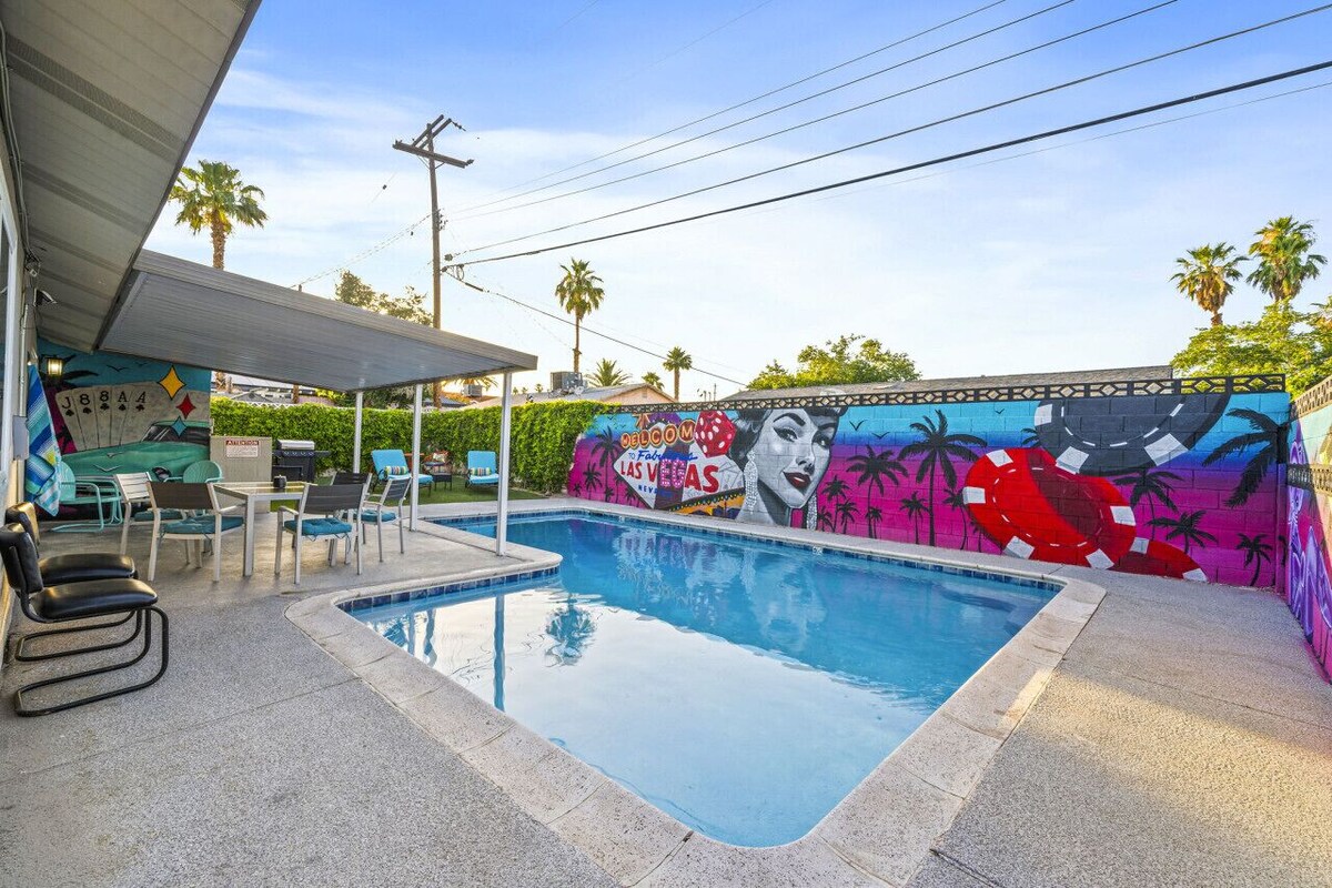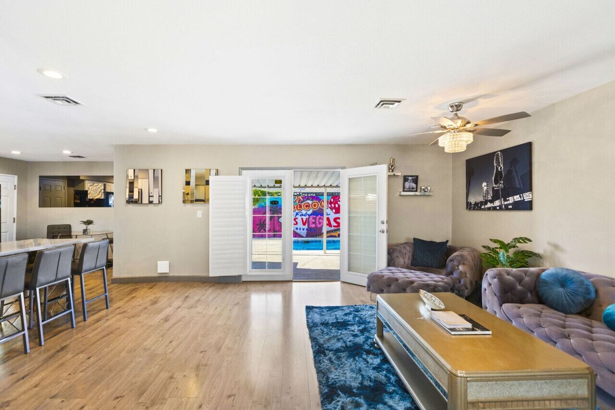 I personally designed every detail of this 1900 square foot, 4-bedroom, 2-bathroom home to ensure that you and your guests thoroughly enjoy everything my home has to offer. Each bedroom has a luxurious feel that is decorated with a contemporary and modern style. The property features brand new furniture, high-quality, comfortable mattresses draped in soft, hotel quality and high thread count bedding. The entire home is fitted with plantation shutters to keep out the heat and light when you want to get some uninterrupted rest and relaxation. The home has been newly remodeled and has every upgrade you could ever want. The spacious kitchen and bar area are ideal for cooking and entertaining. This property features a large kitchen full of natural light and plenty of seating. There will be no need to bring anything from home, as this kitchen is fully equipped with a refrigerator, gas stove, oven, pots, pans, mixing bowls, dishwasher, microwave, both indoor and outdoor dishes, cooking and eating utensils. If you prefer to dine out, there are plenty of delivery options from excellent nearby restaurants or take a short drive down to The strip or downtown and experience some of the best restaurants and celebrity chefs in the world, of course reservations are always recommended. The backyard has a great outdoor living and patio space with a sparkling 8-foot-deep pool. It is a private backyard that is the perfect place to swim, relax and fire up the easy-to-use propane barbeque to enjoy with your family and friends. Quiet Hours: Please observe quiet hours between 10PM and 7AM, respecting the tranquility of our neighbors. NO PARTIES OR EVENTS ALLOWED. If more guests arrive at the home than on the reservation or a party is being held, your reservation will be cancelled immediately without a refund. . We are ok with friends/family coming to visit you so long as its not an excessive amount of people. Send us a message to confirm please. No Smoking: Smoking is strictly prohibited within the property. If smoking evidence is found on the property we will have to charge a fee of $1000.00 Pets: We love to host your fur babies, please pick up if your pets potty in the yard. Please be mindful of your pet scratching/chewing any furniture. Pet Fees Apply. Pool Rules:No children are allowed to be in the pool unsupervised. Swim at your own risk. Our outdoor pool is not gated, nor is it heated. Vomit: For any vomit or other bodily fluids in the home, there will be an additional cleaning fee of $100 or more. Please let us know if this occurs. NO confetti or glitter allowed in or outside of the home. There will be an additional cleaning fee if you violate this policy of $100. Children/Infants: Our property allows children and infants but we would like guests to know that the home is not baby proofed with baby gates, secured storage, outlet covers, a gate around the pool, etc. If you do choose to bring your children or infants, please keep a close eye on them, especially by the pool area. Respect for Neighbors: Please be considerate of our neighbors. Keep noise levels to a minimum, especially during quiet hours. Avoid loud music, parties, or disruptive behavior that may disturb others. Cleanliness: We take cleanliness seriously. Please keep the property clean and tidy during your stay. Dispose of trash in the provided bins and take care not to litter in common areas. Guest Limit: The maximum occupancy for the property is 8 Guests(unless an event if occurring and approved by us). Please do not exceed this limit without prior approval. Amenities and Facilities: Enjoy all the amenities and facilities provided, but please use them responsibly and follow any posted rules. Children must be supervised while using pool facilities. We offer high speed internet, dedicated workspace, AC/heating, Shampoo/Conditioner/Body wash, Pool towels, Fully equipped kitchen, Outdoor Propane BBQ grill, Coffee/Tea station, flat screen TV's. Security and Access: Ensure all doors and windows are locked when you leave the property. Do not share access codes or keys with unauthorized individuals. There are security cameras on the outside of the home in the front, and sides and NOT in the back yard. Guest Liability: Guests are responsible for any damage or loss caused to the property's contents during their stay. Any damage or issues should be reported promptly. Emergency Contact Information: In case of emergencies or urgent issues, contact 911 for life threatening injuries. Additionally please contact me. Compliance with Local Laws: Guests must comply with all applicable local laws and regulations during their stay. Internet and Technology: Complimentary Wi-Fi is provided. Please use it responsibly and refrain from illegal activities. Follow any specific guidelines or terms of use for the internet or smart devices in the property. Missing or Broken items: If anything breaks please alert us. Any evidence of broken or missing items from the property, be it furniture, towels, linens, etc. is subject to an extra charge for replacement or to fix any damage. Towels and Linens: Please take care of our towels and linens. Feedback and Reviews: We value your feedback. If you have any concerns or suggestions, please let us know. Feel free to leave a review of your stay to help us improve our services. By adhering to these house rules, you'll ensure a pleasant and comfortable stay for yourself and your fellow guests while maintaining the cleanliness and peaceful atmosphere of the resort-style property. Any evidence of a guest breaking posted house rules, including exceeding the occupancy listed by the guest on the reservation, parking restrictions, pool rules, illegal substances, or use of the property can result in a fine of up to $1000.00 and/or cancellation of your reservation. Guest initiated cancellations will not include refund for any credit card fees (4%) and there will be an additional cancellation fee for processing the cancelation not to exceed $3