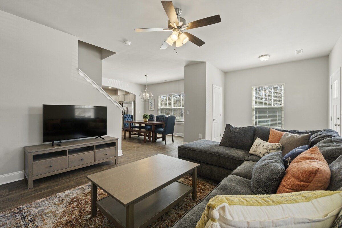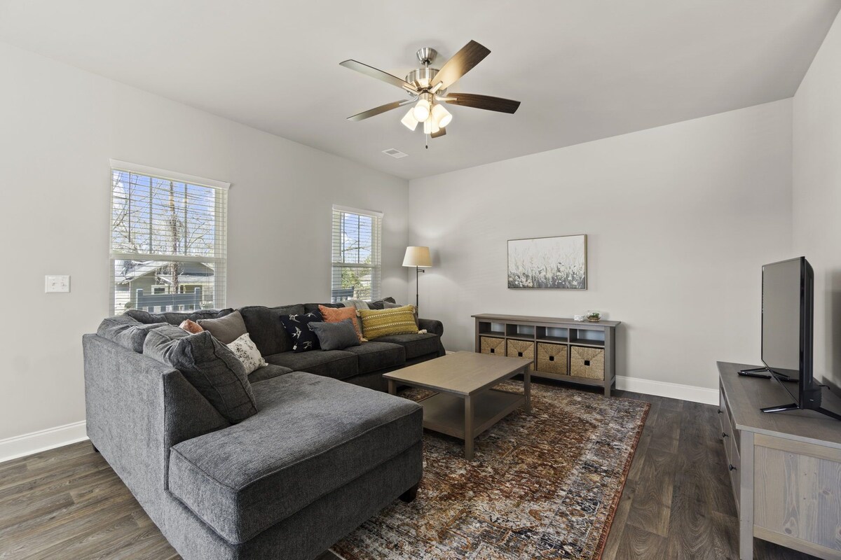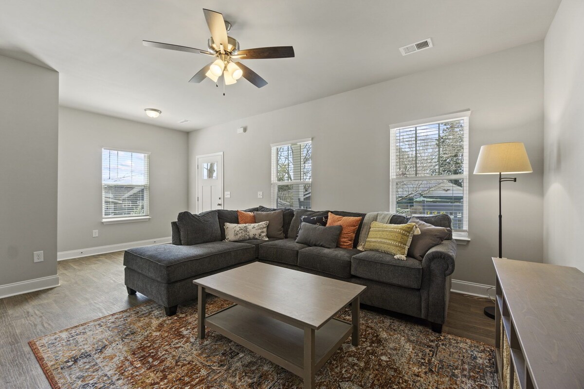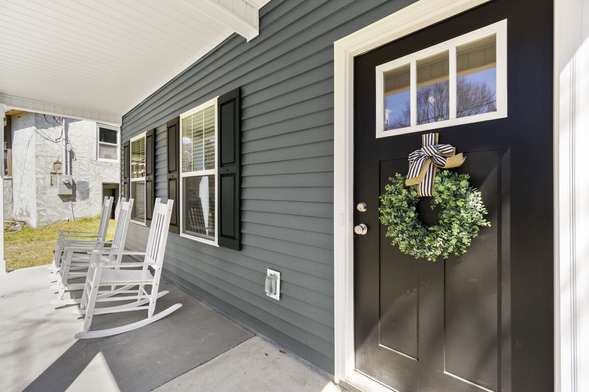 Located just 2 miles from Downtown Greenville and a short walk to the Swamp Rabbit Trail is this beautiful newly constructed 3 bedroom, 2.5 bathroom home. Our home is available for monthly rentaland is fully furnished with kitchen utensils, linens, and utilities included. All three bedrooms are upstairs, with a King bed in the master, a second room with a Full and twin bed, and a third bedroom featuring a desk and a twin bed. Please note: this home is in a transitional neighborhood. Welcome to Trailhead Inn! A Monthly furnished rental in the transitional Nicholtown neighborhood with utilities included. This home is pet friendly, with a pet fee* to be charged after booking. Please note that there is foot traffic in this neighborhood and homes currently under construction. We are located in the City of Greenville and are very close (2 miles) to Downtown Greenville and have neighborhood access to the Swamp Rabbit Trail! Guests will have full access to the home and lot, including the driveway at the back that can fit 2 cars. The front porch has 3 rocking chairs for you to enjoy. Upon entering the home, you can rest in our cozy living room complete with a sectional sofa and a smart TV (for logging into your own streaming services. There is not cable at this home). The living room leads into the open dining and kitchen space, where there is a large table for 6-- 4 chairs, and one bench. The kitchen is spacious with brand-new appliances and is stocked with everything you will need to whip up a great meal. The laundry room, pantry, and downstairs hall-bath are all off of the kitchen area. Upstairs, you will find 3 bedrooms. The Master bedroom contains a King bed, dresser, nightstands, and reading lamps. The en suite bathroom has two vanities, a full tub-shower combination, and a spacious walk-in closet. The second bedroom features a Full and Twin bed, closet, and nightstand with a reading lamp. The third bedroom has a desk and lamp set up as well as a Twin bed, to function as either a bedroom or an office. It also has its own closet These two rooms share the hall bathroom, which has a single vanity and standard tub/shower combination. *Pets are welcome to join you for your stay for a fee of $250 for the first pet and $100 for each additional pet. We are sure that this home will be exactly what you need for your stay, and we can't wait to discuss it more with you! Guests have access to the entire home and small yard. All utilities, Wi-Fi, and lawn care are included in your stay. Guests are responsible for taking trash cans to the curb for city pickup. Pet fee of $250 Smoking is permitted outside, provided all exterior doors are closed and buds are disposed of safely (i.e., not in a trash bag/paper cup/or other flammable container). Smoking indoors or leaving buds in the yard is prohibited and will incur a $250 fine. Our prices include all fees. No hidden fees.