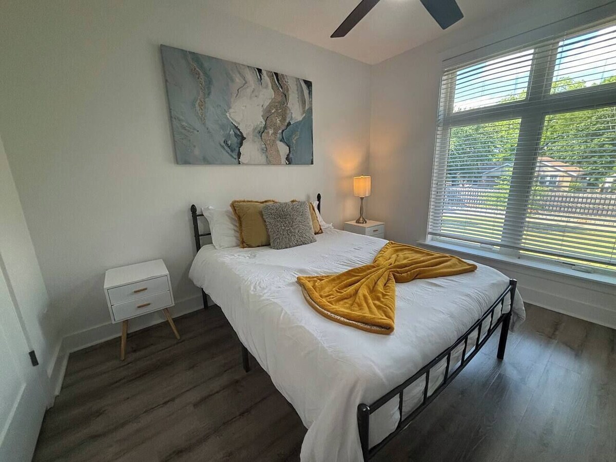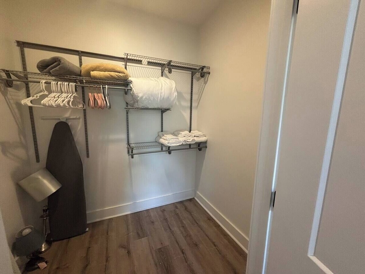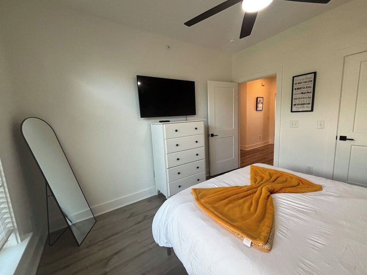 Experience modern comfort in this 2BR apartment within a gated community. Features include a fully equipped kitchen, high-speed Wi-Fi, and a 65” Smart TV. Both bedrooms offer queen-size beds with premium linens. The master bedroom boasts a private balcony. Pet-friendly with prior approval. Conveniently located near downtown Greenville's attractions. Ideal for families, business travelers, or remote workers. Living Room: Enter a bright, open-concept living area thoughtfully designed for comfort and style. Relax on the plush sofa with throw pillows while enjoying your favorite shows on the 65” Smart TV, equipped with streaming services. Modern accent chairs and a chic coffee table enhance the aesthetic, and a dedicated workspace provides a functional spot for remote work or trip planning. Kitchen: The fully equipped kitchen features sleek granite countertops, stainless steel appliances, and ample cabinet space. Whether preparing a simple breakfast or a gourmet meal, you'll find all the essentials, including pots, pans, utensils, and a Keurig coffee maker with complimentary coffee. The cozy kitchen bar seats two, perfect for quick snacks or morning coffee. Adjacent to the kitchen, a dining table comfortably seats up to five guests for shared meals. Master Bedroom: The serene master bedroom is your private retreat. It boasts a queen-size bed dressed with premium linens and plush pillows for a restful sleep. A walk-through closet offers generous storage space and leads to the en-suite bathroom. The highlight of the room is the private balcony with seating – ideal for sipping coffee or enjoying quiet moments. Second Bedroom: The second bedroom is equally inviting, with a queen-size bed featuring quality linens and ample closet space for your belongings. A flat-screen TV, bedside tables, and reading lamps complete the room, ensuring every guest feels right at home. It also offers convenient access to the second full bathroom. Bathrooms: Both bathrooms are modern and well-appointed, featuring tub/shower combos, clean towels, and essential toiletries. The master bathroom connects directly to the bedroom, while the second bathroom is easily accessible from the main living areas and the second bedroom. Hairdryers and ample vanity space make getting ready a breeze. Additional Amenities: In-unit washer and dryer for your laundry needs. Central heating and air conditioning for year-round comfort. High-speed Wi-Fi throughout the apartment. Pet-friendly accommodations available with prior approval. Our prices include all fees. No hidden fees.