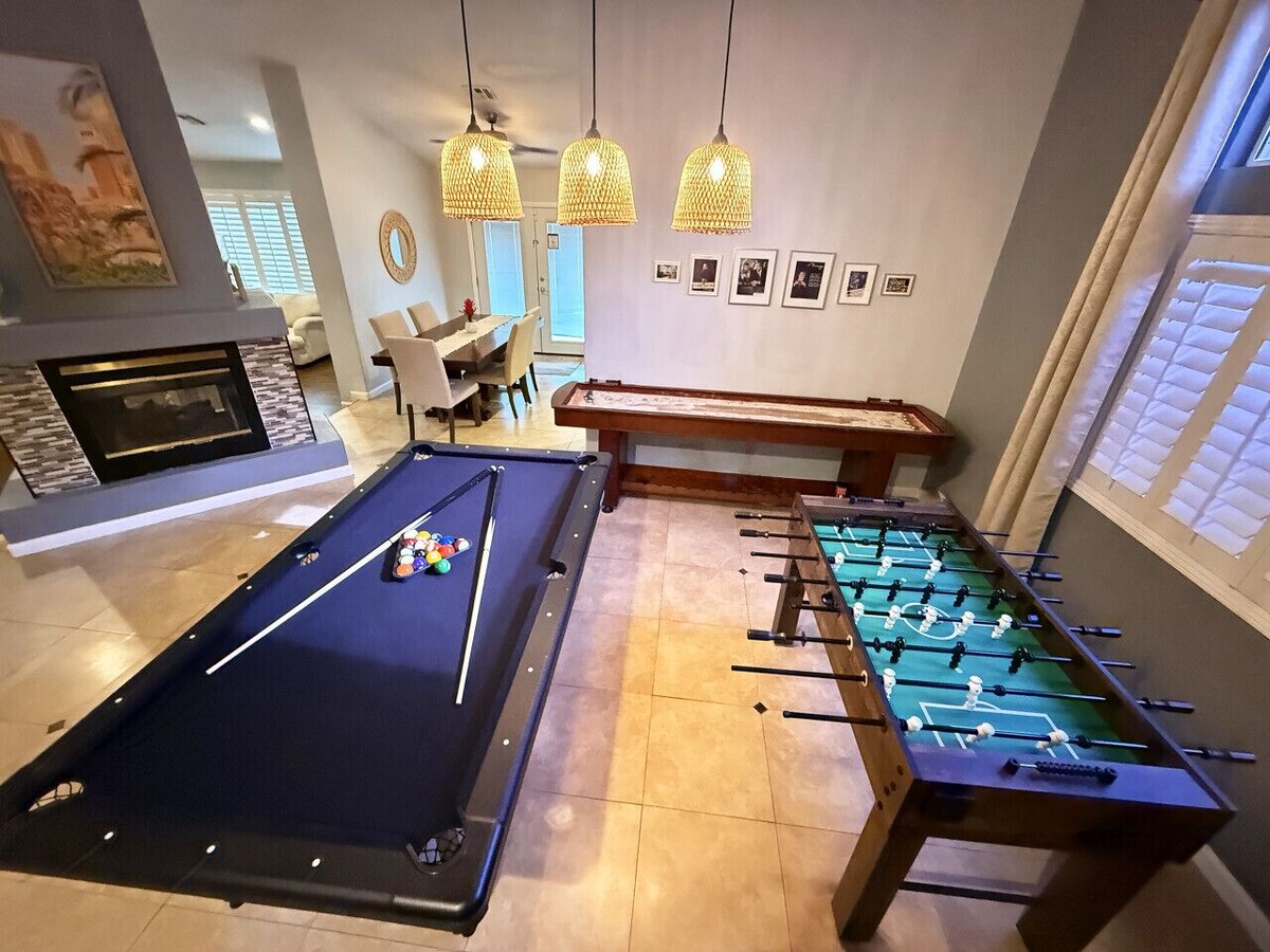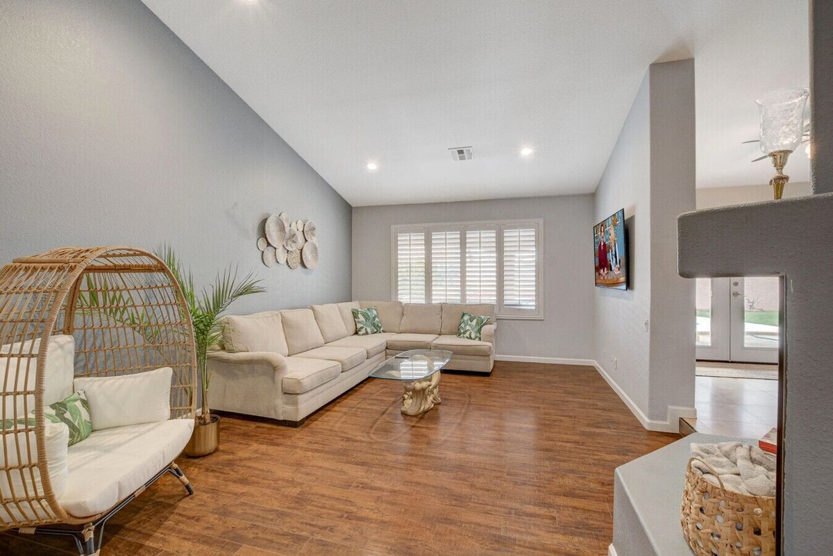 📍 Prime Location: Just 15-20 mins from The Strip and 10-15 mins from Downtown Las Vegas. 🏖 Inspired Design: Experience the charm of the original Mirage Hotel, adorned with memorabilia and Las Vegas history. 🐬 Relaxation & Luxury: Enjoy a palm-shaded lagoon, elegant home, and poolside lounging next to golden dolphins. 🌆 Quiet & Safe Neighborhood: Nestled in the heart of Las Vegas, close to all major attractions. (Pool heating available for a fee, 2-day minimum) 🛏️ Bedroom 1: The Mirage Suite Private with pool access, King-size bed, dual sinks, 42` TV. 🌺 Bedroom 2: The Mirage Queen Boho/tropical design, queen memory foam bed, workstation, fast WiFi. 🌴 Bedroom 3: The Mirage Double Room Ideal for families, sleeps up to 4 with two full-size beds. 🏊♂️ Unique Pool - Waterfall, golden dolphins, in-pool seating, photo spot, heating service available (heating fee apply). 🍃 Entertaining Deck 🕯 Living Room Plush sectional, golden dolphin coffee table, 65` TV with Netflix and Spotify. 👩🍳 Fully Equipped Kitchen Essentials, large gas cooktop, oven, microwave, and Keurig coffee machine. Dining Area: 🍽 Spacious for Meals 🏈 Stay with us and enjoy the ultimate football experience! Our home comes with NFL Sunday Ticket, allowing you to watch any game live from the comfort of the living room. Whether you`re cheering for your favorite team or catching multiple games, this is the perfect spot for football fans! 🏡 When you stay in this incredible home, you have the entire place to yourself. 🔑 You will be given a unique code to access the Smart Lock on the front door before you arrive and will be given all the information you need to access the WiFi. 🎨 The home is professionally decorated and Smart, including Smart flat-screen TV`s in the living room and master bedroom, ceiling fans, AC/Heating control units. 🚗 Plenty of parking – 2 car garage and 2 cars can park in the driveway. 🏙️ Las Vegas Strip: Approximately 20 minutes away. 🎤 T-Mobile Arena: About 20 minutes away. 🏟️ Allegiant Stadium: Roughly 20 minutes away. 🎡 High Roller Observation Wheel: Approximately 20 minutes away. 🎰 The Venetian Resort: About 20 minutes away. 🎭 The Mirage Hotel and Casino: Roughly 20 minutes away. 🎨 Neon Museum: Approximately 20 minutes away. 🏞️ Red Rock Canyon National Conservation Area: About 30 minutes away. 🏌️♂️ TPC Summerlin Golf Course: Roughly 20 minutes away. 🛍️ Downtown Summerlin: Approximately 20 minutes away. 🚭 DO NOT SMOKE ON PROPERTY, INSIDE OR OUTSIDE THE HOUSE! You can smoke in the park across the street. Breaking the rules may result in booking cancellation, with no refund and/or a $1,000 fine.Parties will not be tolerated and guests will be removed with a fine and no refund. As a LICENSED SHORT-TERM RENTAL PROPERTY, all guests must agree to follow all city ordinances and house rules as disclosed prior to booking of the property. 🚫 NO parties of Any Kind Due to the city ordinances.NO Fireworks of Any Kind on and around the property at any time.NO Disturbing Noises of Any Kind This includes use of microphones and speakers for singing, speaking, and playing music throughout the day and especially after 10:00 pm and before 8:00 am. 🚗 NO Street Parking of Any Vehicles All vehicles must be parked on the designated area within the property. No commercial vehicles allowed. 🚙 NO more than 6 Vehicles Allowed Due to the city ordinances.NO DISTURBING THE NEIGHBORS! NO EXCEPTIONS! This includes racing, revving, and spinning out cars/motorcycles on or around the property. 🐾 Pets are allowed with prior owner approval and a fee. There is a pet fee. Bringing a pet without the owner pre-approval may result in booking cancellation, with no refund and/or a $1,000 fine. If any neighbor or authority contacts us during your stay to report violation of any of the above rules, you will be reported to your booking Channel and required to leave the property immediately without refund. Please update your guest count for insurance purposes; additional fees may apply. When cancelling a reservation, processing fees will not be refunded. For your protection, like any hotel, we have 4 security cameras in the front yard and 2 security cameras in the backyard covering the outside premises. 🏊 Special Facilities on property: Swimming Pool Use of the Special Facilities during your stay involves certain risks, including but not limited to: 🌊 Drowning ⚠️ The risk of injury resulting from possible malfunction of the pool and/or Exercise equipment. 🚶♂️ The risk of injuries resulting from tripping or falling over obstacles in the Special Facilities areas. 🤿 The risk of injuries resulting from unsupervised divers and swimmers colliding. ⚠️ The risk of other injuries resulting from participating in any action in the Special Facilities areas. All guests hereby agree to the conditions below and fully intend to use the Special Facilities and entire property at their own risk: 📝 TO WAIVE ANY AND ALL CLAIMS that the guests have or may have in the future against the owner, host, directors, officers, employees, agents, or representatives (hereinafter referred to as the “Releasees”) in regards to guests` use of the Special Facilities. 🛑 TO RELEASE THE RELEASEES from any and all liability for any loss, damage, injury, expense, or other costs that guests may suffer or that their next of kin may suffer in connection with guests` use of the Releasees` Special Facilities and its surroundings, to any cause whatsoever, including negligence on the part of the releasees. 🛡️ TO HOLD HARMLESS AND INDEMNIFY THE RELEASEES from any and all liability to property, or personal injury to, any third party, resulting from the use of the Special Facilities and its Surroundings. ✅ That the Booking Guest verifies he/she is over the age of 18 and is responsible and will adhere to all the rules of the property and use instructions 