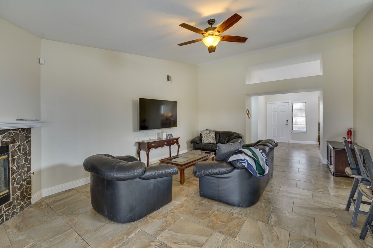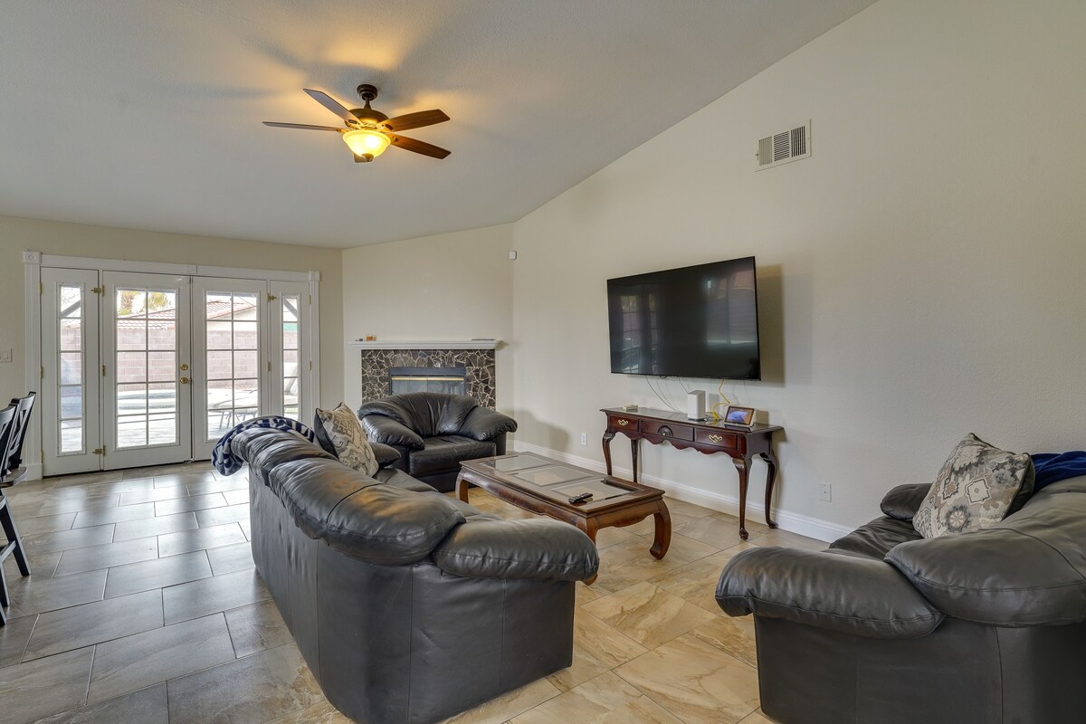 Your next extended stay in Las Vegas, Nevada, awaits with this 3-bedroom, 3-bath vacation rental as your home base. This ideally located home offers a kitchen for preparing home-cooked meals, a fenced-in backyard with a private pool and covered patio, and a location nestled just a short drive from the Las Vegas Strip. While you’re in town, go for a drive along the Red Rock Canyon scenic loop or catch a Golden Knights game at T-Mobile Arena, then head back home to cozy up by the fireplace. -- THE PROPERTY -- Free WiFi | 31-Night Minimum | ~11 Mi to Strip Bedroom 1: King Bed | Bedroom 2: Queen Bed | Bedroom 3: Queen Bed INDOOR LIVING: Smart TVs, fireplace, dining table, ceiling fans KITCHEN: Blender, coffee maker, cooking utensils, dishware & flatware, microwave, toaster oven OUTDOOR LIVING: Seasonal outdoor pool (opens Memorial Day), fenced-in yard, fire pit, covered patio w/ seating, dining area, gas grill GENERAL: Central air conditioning, complimentary toiletries, hair dryers, hangers, linens/towels, trash bags/paper towels FAQ: 1 minor step to enter, 2 exterior security cameras (facing out), pet fee (paid pre-trip), hot tub not available PARKING: Driveway (4 vehicles) -- THE LOCATION -- THE LAS VEGAS STRIP (~11 miles): Caesars Palace, Bellagio Hotel & Casino, The Cosmopolitan of Las Vegas, Excalibur Hotel & Casino, MGM Grand ENTERTAINMENT: Orleans Arena (10 miles), Las Vegas Ballpark (10 miles), UFC Apex (11 miles), MGM Grand Garden Arena (12 miles), T-Mobile Arena (12 miles), Allegiant Stadium (13 miles), Las Vegas Motor Speedway (14 miles) EXPLORE OUTSIDE: Springs Preserve (6 miles), Red Rock Canyon National Conservation Area (11 miles), Clark County Wetlands Park (18 miles), Spring Mountain Ranch State Park (20 miles) AIRPORT: Harry Reid International Airport (12 miles) -- REST EASY WITH US -- Evolve makes it easy to find and book properties you'll never want to leave. You can relax knowing that our properties will always be ready for you and that we'll answer the phone 24/7. Even better, if anything is off about your stay, we'll make it right. You can count on our homes and our people to make you feel welcome — because we know what vacation means to you. This property is managed by Evolve Nevada (Nevada Broker # B.143842). -- POLICIES -- - No smoking - Pet friendly w/ $50 fee (+ fees & taxes) - No events, parties, or large gatherings - Must be at least 21 years old to book - Additional fees and taxes may apply - Photo ID may be required upon check-in - NOTE: 1 minor step is required to enter the property - NOTE: Your safety matters. This property features 2 exterior security cameras: 1 camera is located at the front of the garage facing the driveway, and 1 camera is a Ring doorbell camera located at the front door facing the front outdoor entryway. The cameras are outward facing and do not look into interior spaces. The cameras record video and sound when activated by motion - NOTE: The private outdoor pool is available seasonally and will re-open on Memorial Day - NOTE: The hot tub is being repaired and not available Our prices include all fees. No hidden fees.