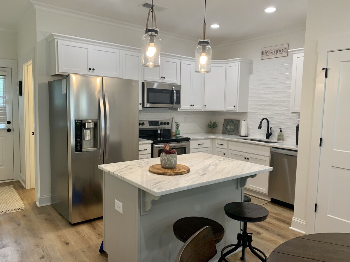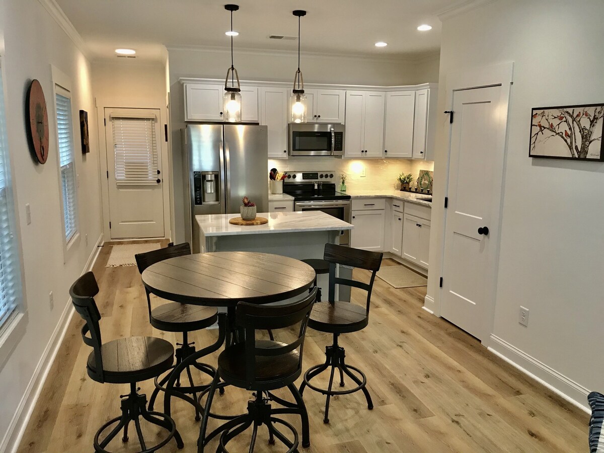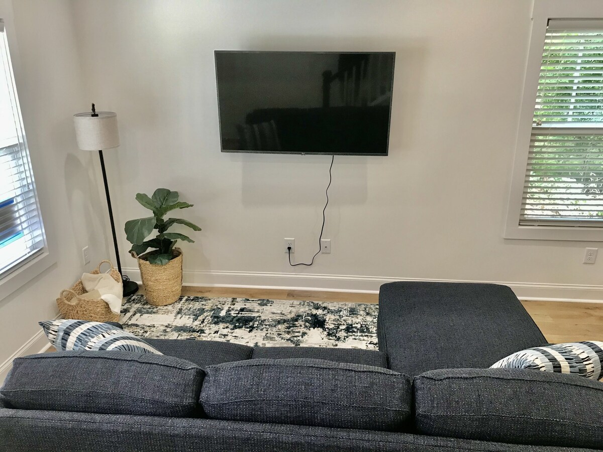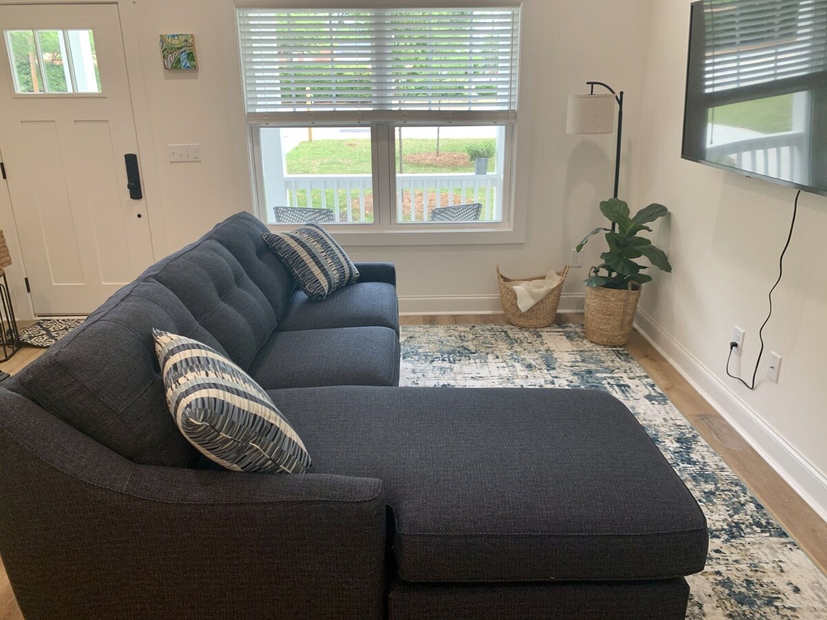 New Townhome within walking distance from Downtown Greenville! Located only a few blocks away from Main Street in the West End, you can either walk to everywhere downtown or take a very quick car ride. Built in 2021, everything is brand new including furniture and appliances. We have a great living area, kitchen, and dining all on the first floor. Upstairs, there are two bedrooms, two full bathrooms, and laundry. This place has everything you need for a very comfortable and relaxing stay. The first floor features a beautiful open concept with a living area, dining, and full kitchen. Living area has a comfy sectional couch that pulls out to a queen size bed, and it overlooks a 55 inch flat screen tv. The kitchen and dining area contain everything you need for prepping and enjoying any meal. Upstairs contains a washer and dryer, and two identical size bedrooms, each with their own queen size bed, full bathroom, and closet. This townhome is part of a new Duplex, and has an identical townhome right next-door. There is a nice spacious backyard that is shared with the townhome next door. Its within walking distance to the main attractions downtown such as; Fluor Field, Gather Greenville, Fall's Park, Liberty Bridge, and Peace Center. Also, within close proximity to St. Francis Hospital. Great location to enjoy all that Greenville has to offer. You can either walk to places downtown or take a very quick car ride. This townhouse has parking space for two cars and it shares a driveway and backyard with the townhome next door. It is nice and private as there are empty lots on both sides of the Duplex. Our prices include all fees. No hidden fees.