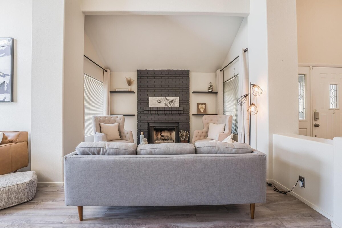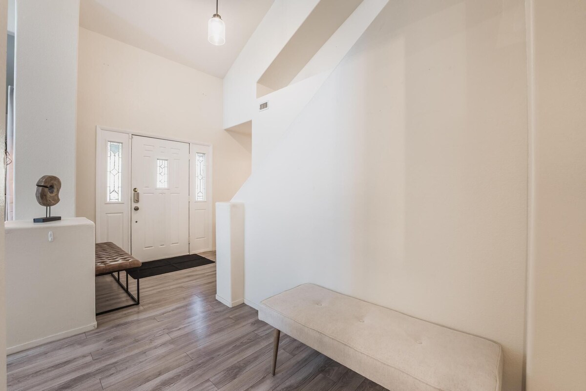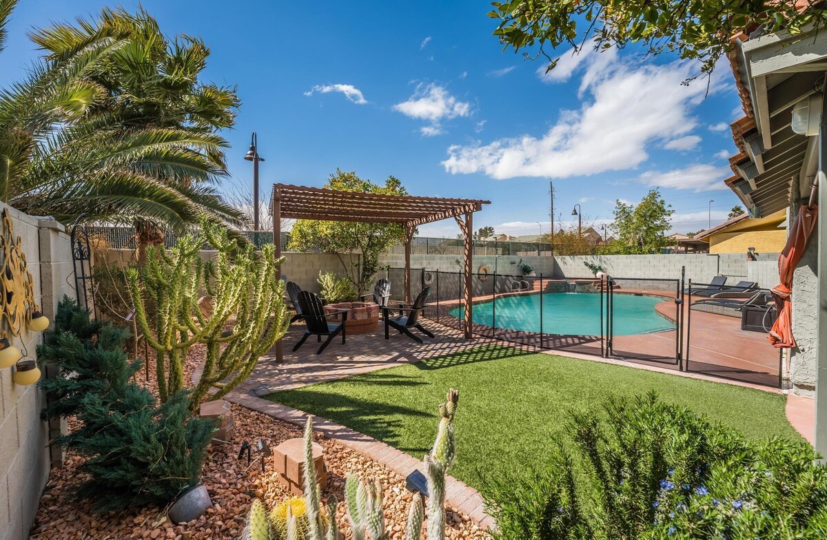 Welcome to your home away from home! This home highlights location and convenience. FREE parking. FAST& Reliable WiFi. Washer & Dryer in unit. Private Pool & Hot Tub. Private Backyard. Located just minutes to Downtown Fremont, Las Vegas Strip, & Red Rock Canyon National Park! Enjoy a home cooked meal together in our fully equipped kitchen or dine in at the countless restaurants less than 3 miles away. The home is perfect for large gatherings for your next family or group vacation. This home features a private pool and hot tub. The spacious outdoor oasis allows for extra gathering on the patio and patio bar. Our home is just steps away from the neighborhood park perfect for large gatherings and pets. Back yard is fenced, which allows for additional privacy and pet area. The home sits on a prime location to dining, coffee shops, bagel cafes, grocery stores, shopping centers, hospitals, highways, gyms, large neighborhood parks, dog parks, tennis courts, soccer fields, and golf courses. This location is ideal for those who would like to experience the true essence of Las Vegas, with outdoor activities such as hiking and biking trails with spectacular mountain views! This home's central location makes it ideal and convenient for travelers, students, and professionals. Perfect for longer stays! FEATURES AND BENEFITS - 4 bedrooms and 3 bathrooms (1 bedroom and 1 full bathroom on 1st floor; 3 bedrooms and 2 full bathrooms on 2nd floor) - Spacious bedrooms with designated study areas (includes a desk & chair in ALL 4 bedrooms) - Sofa bed (1 in game room on 1st floor) - Additional air mattress -Oscillating fans in each room - Washer & Dryer inside unit - Keyless, contactless entry - Fully Equipped Kitchen stocked with basics (plates, utensils, drink ware, baking pans, pots and pans, air fryer, toaster, seasonings, etc) - Coffee Bar - Board Games -Air Hockey table -Foosball table - Smart TV in living room, game room, and ALL 4 bedrooms - Private Pool & Hot tub *Pool NOT heated.* Hot tub can be heated upon request for a designated time window, with an additional fee. -Private patio -Private parking for up to 3 vehicles Our spacious and stylish vacation home allows your family and guests the extra comfort and privacy. Dog and cat-friendly property. GUEST ACCESS Guests will have access to the entire home and back yard. OTHER THINGS TO NOTE Please be mindful of neighbors and respect their property. Any additional parking is located on the street at no extra cost. BASIC RULES No smoking, parties, rearranging furniture, blocking driveways, excessive noise, or disturbing neighbors. Do NOT light up bonfires in the fire pit area. Do NOT use indoor fireplaces. Please be responsible and swim at your own risk. *Pool NOT heated.* Hot tub can be heated upon request at an extra fee. One time flat rate of $150. SECURITY CAMERAS Our property is equipped with exterior Ring cameras and are capable of recording video and audio. There is a Ring camera located at the main entrance, front of the home, side gate entrance, back yard and pool area. These are solely on the exterior of the property. Footage remains private and may be used for liability reasons and to monitor occupancy and other property policies. It in no way infringes upon the expectation of privacy in these public areas. To disable or obscure the cameras is prohibited and may result in the immediate removal of guest(s) and forfeiture of all amounts paid. In order to maintain a safe environment for all our guests, our community requires a basic background check. This assures you and your neighbors will always have a safe stay. Our prices include all fees. No hidden fees.