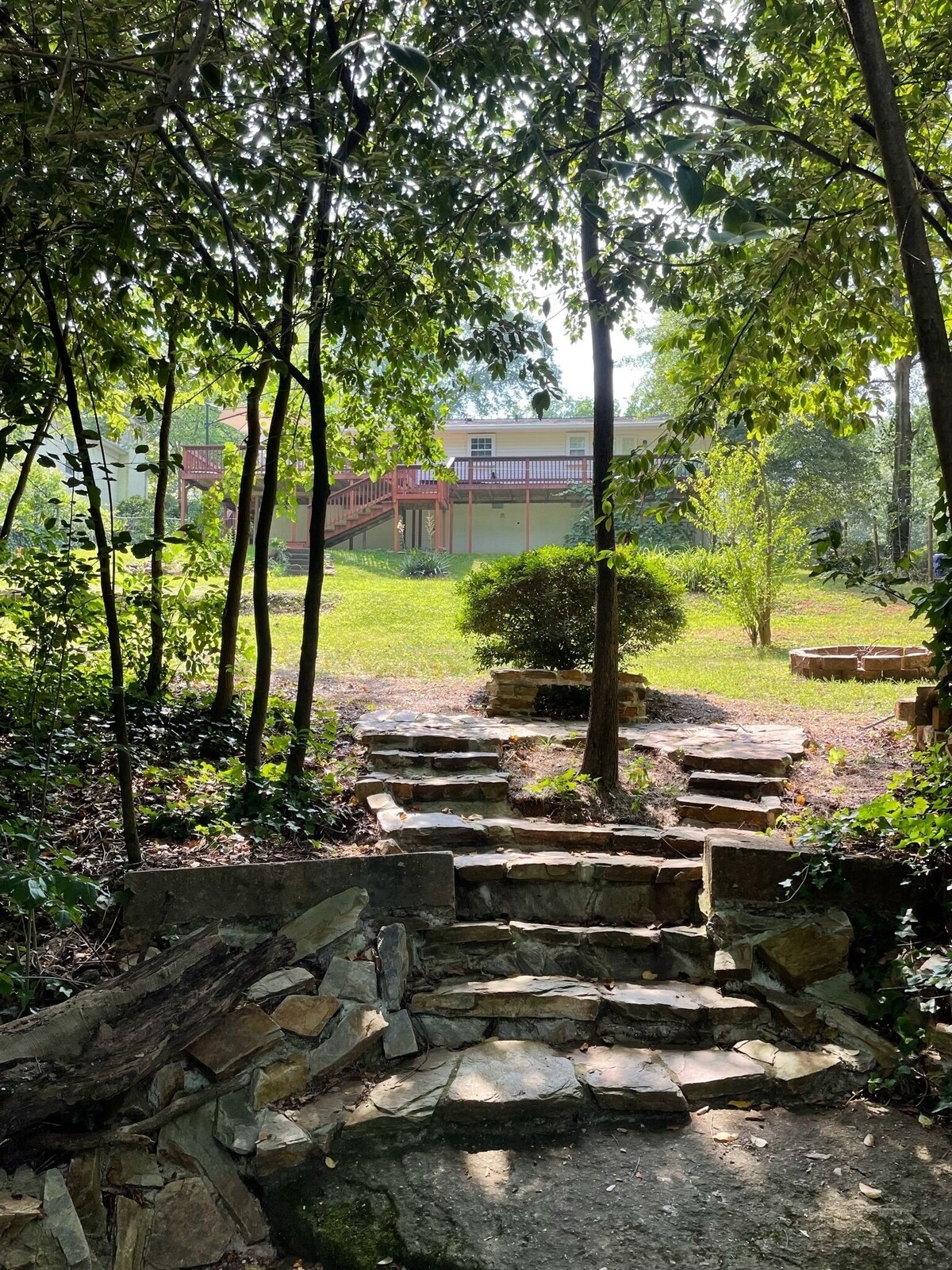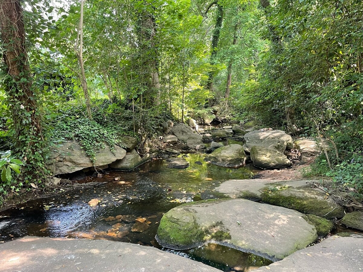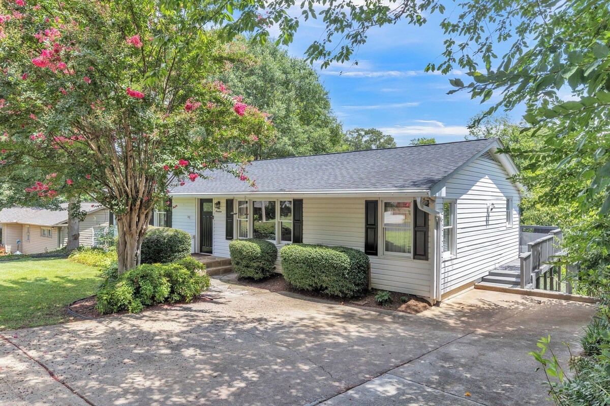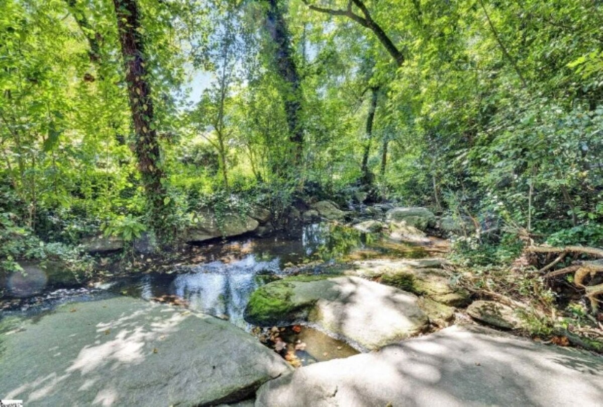 The Scarlett House, Newly Renovated Greenville home is on 1/2 acre. 50' deck overlooking a beautiful creek. We rent to families renovating, building or just looking to enjoy this great town. We offer a discount for a 1+ month rental. This home is dog friendly & perfect for working travelers. LARGE Master bedrooms on opposite sides of the house with 2 full baths and a naturally lite office/den with a trundle bed giving everyone space. This established neighborhood is family & dog friendly! Our local favorite coffee shop/night pub with different food trucks nightly is only 2 blocks from home! Only 3 .5 miles from downtown and 5 minutes from grocery stores. The split floor plan is perfect for privacy. On the south side the extra large bedroom w/ king size memory foam mattress and has the office/den directly opposite. It includes a wireless printer, paper, and small desk. There is also a trundle bed with 2 twin beds. There is a Flat Screen in the office as well as the living room. These two rooms share a full large bathroom. Behind the kitchen and living room is the other master bedroom/full bath. This also has a king bed with a memory foam. The deck wraps around the back of the house overlooking the fenced in yard and creek. The back yard is fenced in on three sides, open to the creek. We have included 2 roller gates on the back patio for keeping little ones and pets safe. The backyard is newly landscaped and includes a firepit seating area. We only ask that you monitor your dogs in the backyard as any damage to the landscaping will be charged. We have landscape Maintenance that come twice a month to maintain. Don’t worry there’s plenty of room for your dog to roam in the back . My dog Gypsy is a digger and we have to keep our eyes on her at all times when she’s back there, she just can’t help herself. This is a one of a kind home that we think you will find perfect for your stay. We offer affordable cleaning service while visiting. We provide bowls for your dogs. Dog(s) to be crated when guests are out. New outdoor dining table, chairs and 9' umbrella let you enjoy our beautiful backyard. We had a boat building regatta in the creek with the family last time everyone was up, loads for fun for everyone! This is a unique neighborhood in Greenville as many of the homes have very large wooded lots. It is a close knit community and we love visiting! It seems like everyone has a dog or two to walk. The neighborhood includes Grateful Brew, great coffee in the am and brews, games and food trucks at night within walking distance. Also the famed Pita House. There is also a Fresh Market, Publix and eateries all around the home and Augusta area. Rocky's Hot Chickens, Willie Tacos 2 miles, KitchenSync, Restaurant 07 (my favorite) I 385 access 2.5 miles TD Center 1.8 miles GSP Airport 2 miles Zoo 3miles Swamp Rabbit Trail 2.5 miles Greenville Tech 1/2 mile PLEASE NOTE, THIS Primarily a MONTHLY RENTAL. Our prices include all fees. No hidden fees.
